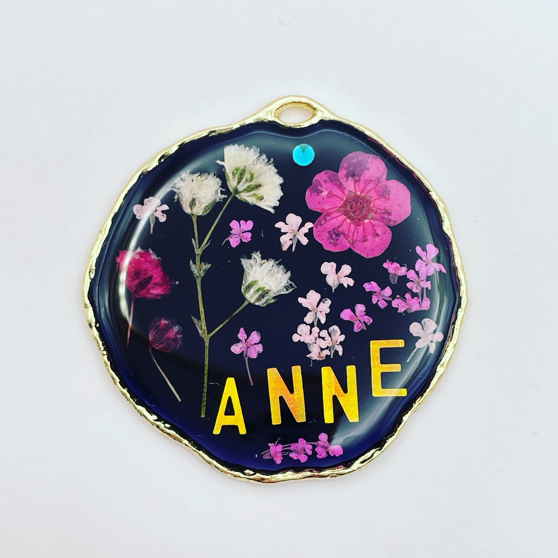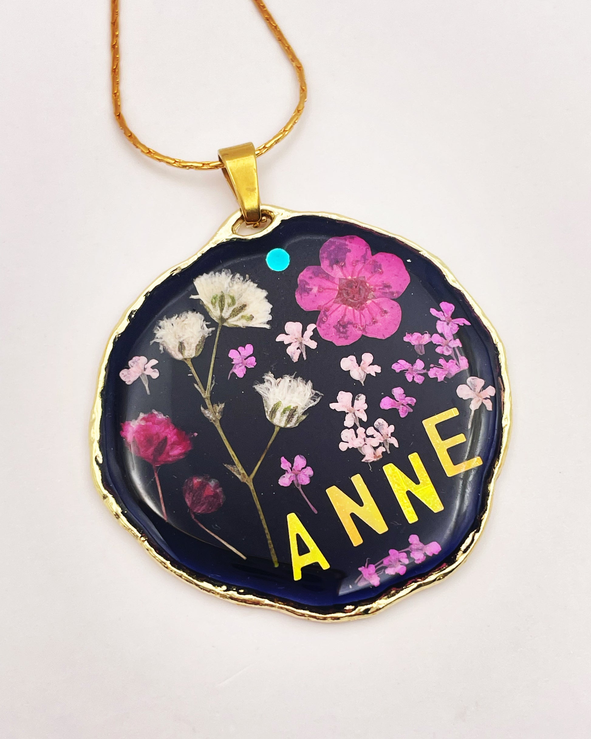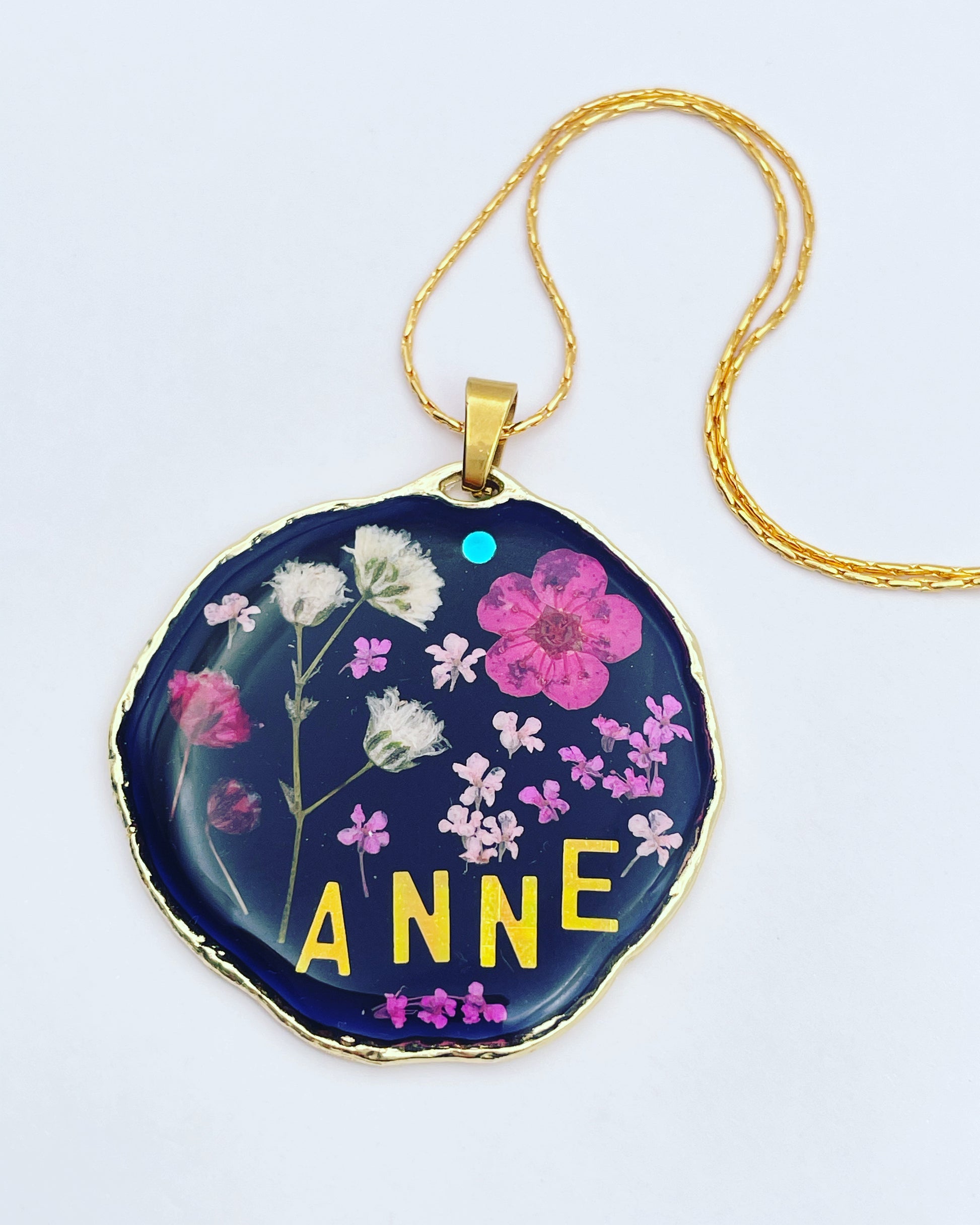 This customisable pendant necklace is handmade with real flowers and letters in resin. Most of the flowers are collected during my walks and pressed at my workshop in London UK. Each piece is carefully handcrafted by me.