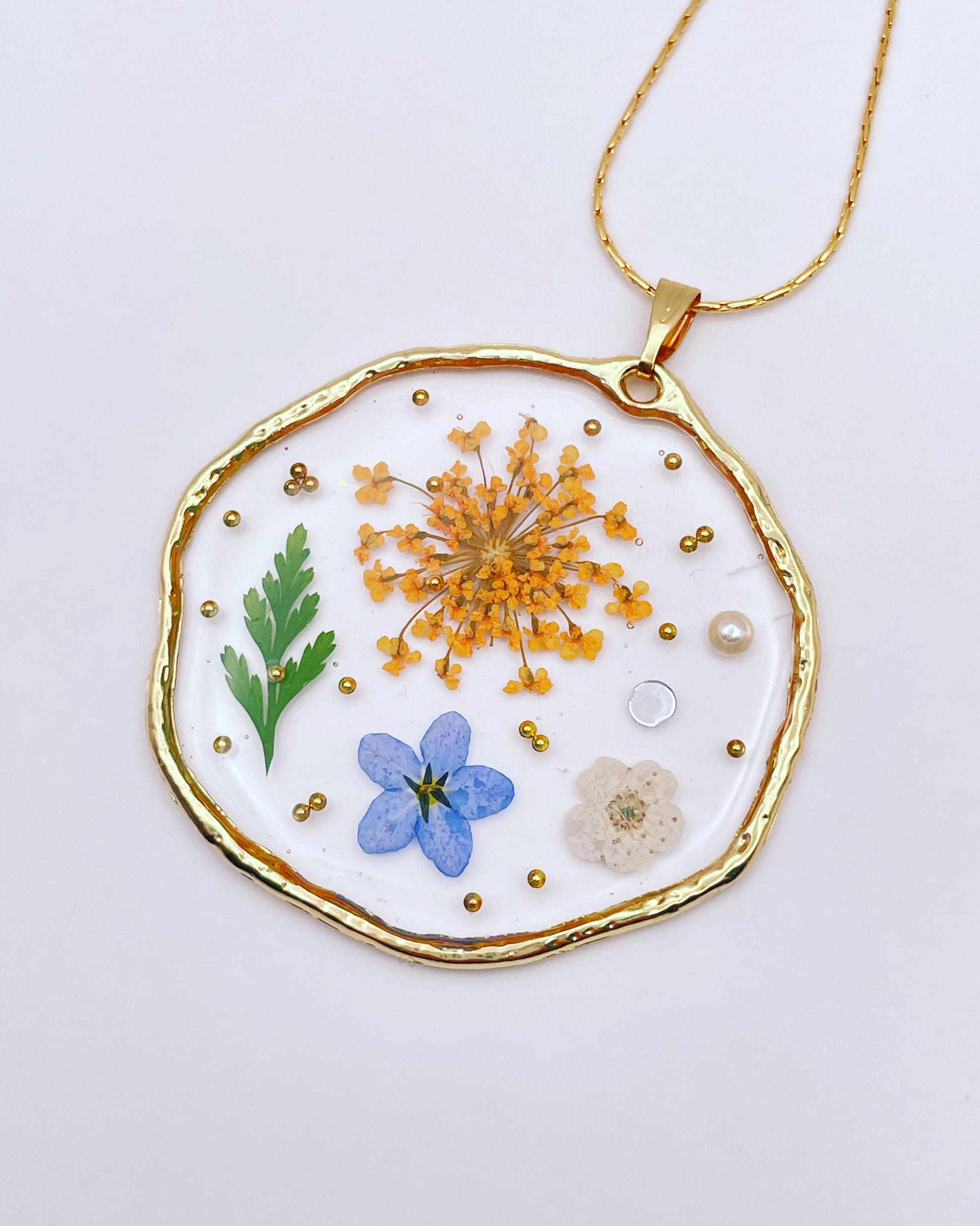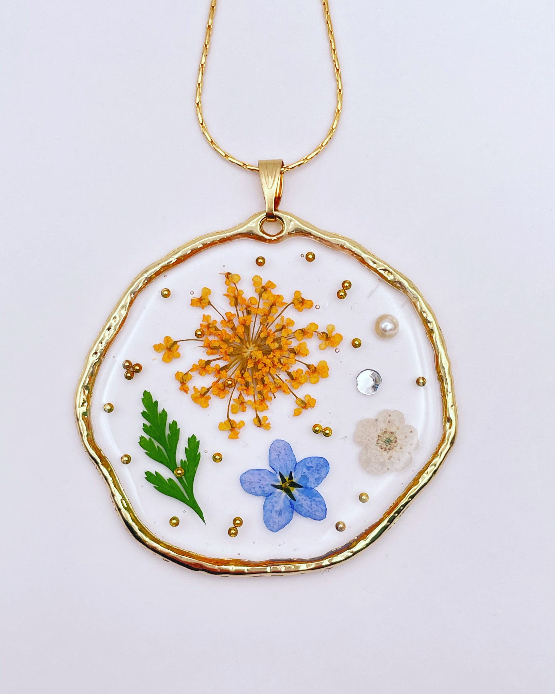 This beautiful statement pendant necklace is handmade with real flowers, crystals and gold beads in resin. Most of the flowers are collected during my walks and pressed/dyed at my workshop in London, UK. Each piece is carefully handcrafted by me.
