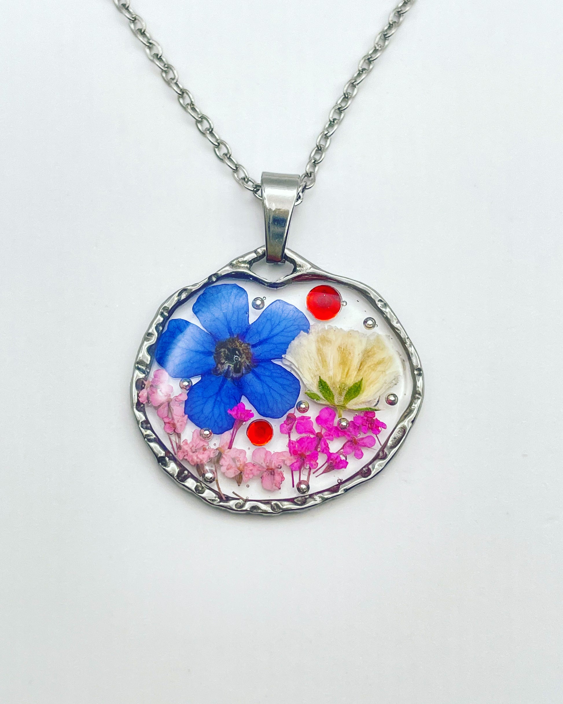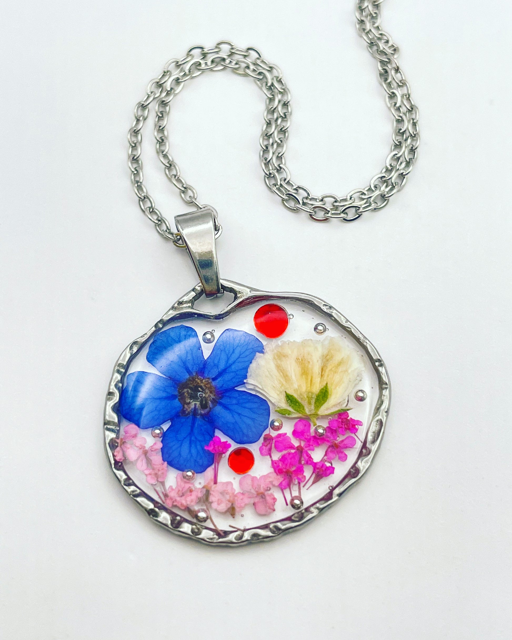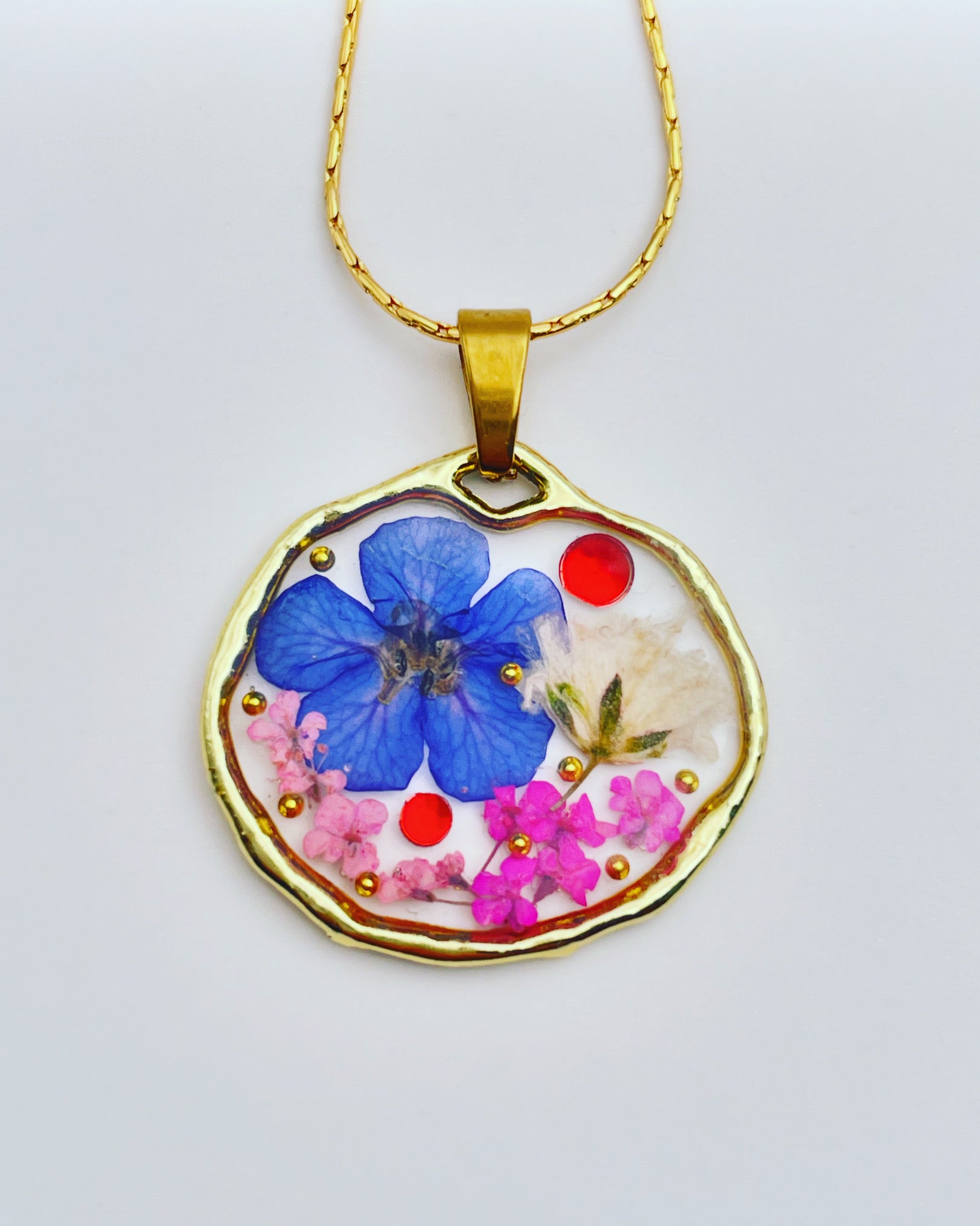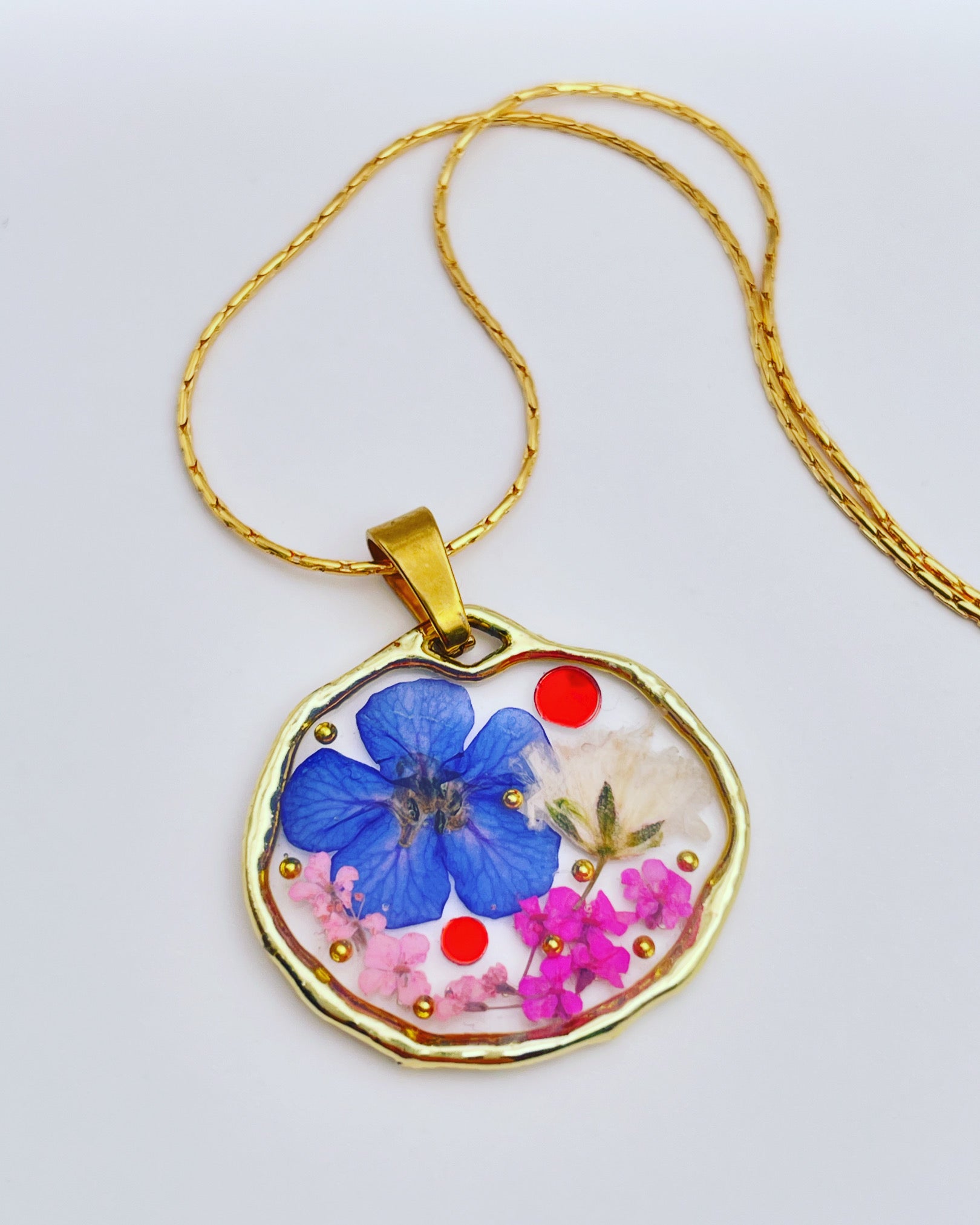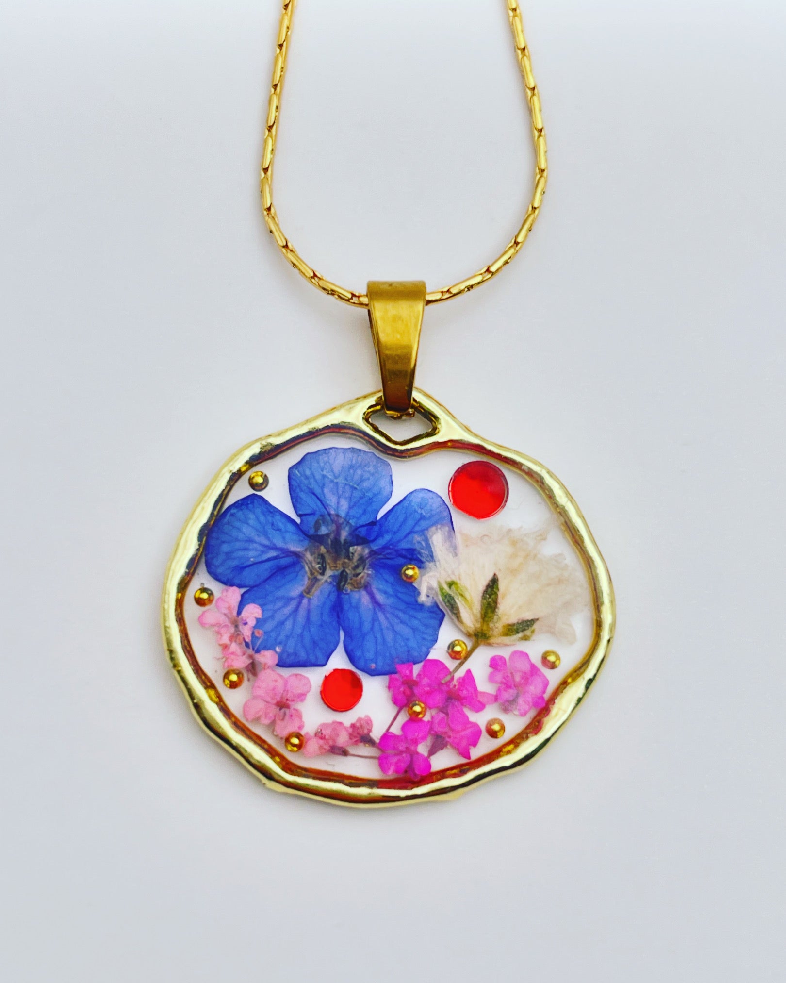 This beautiful pendant necklace is handmade with real flowers, crystals and gold beads in resin. Most of the flowers are collected during my walks and pressed/dyed at my workshop in London, UK. Each piece is carefully handcrafted by me.