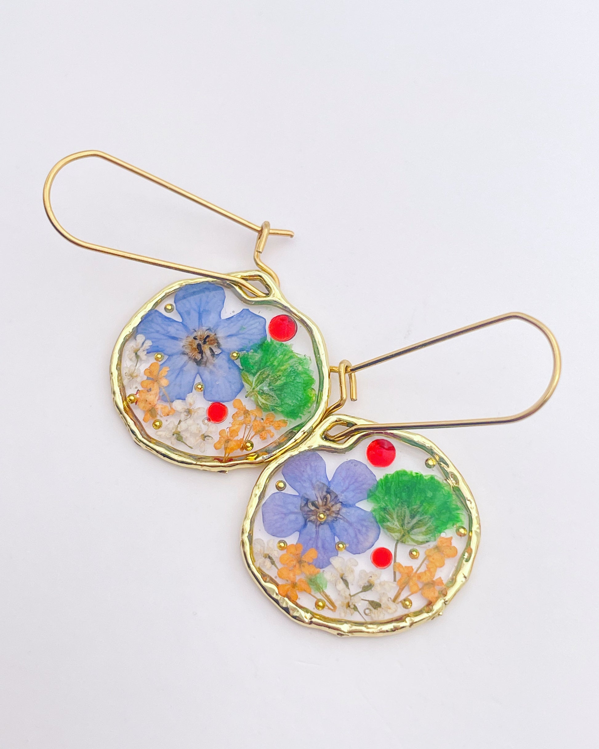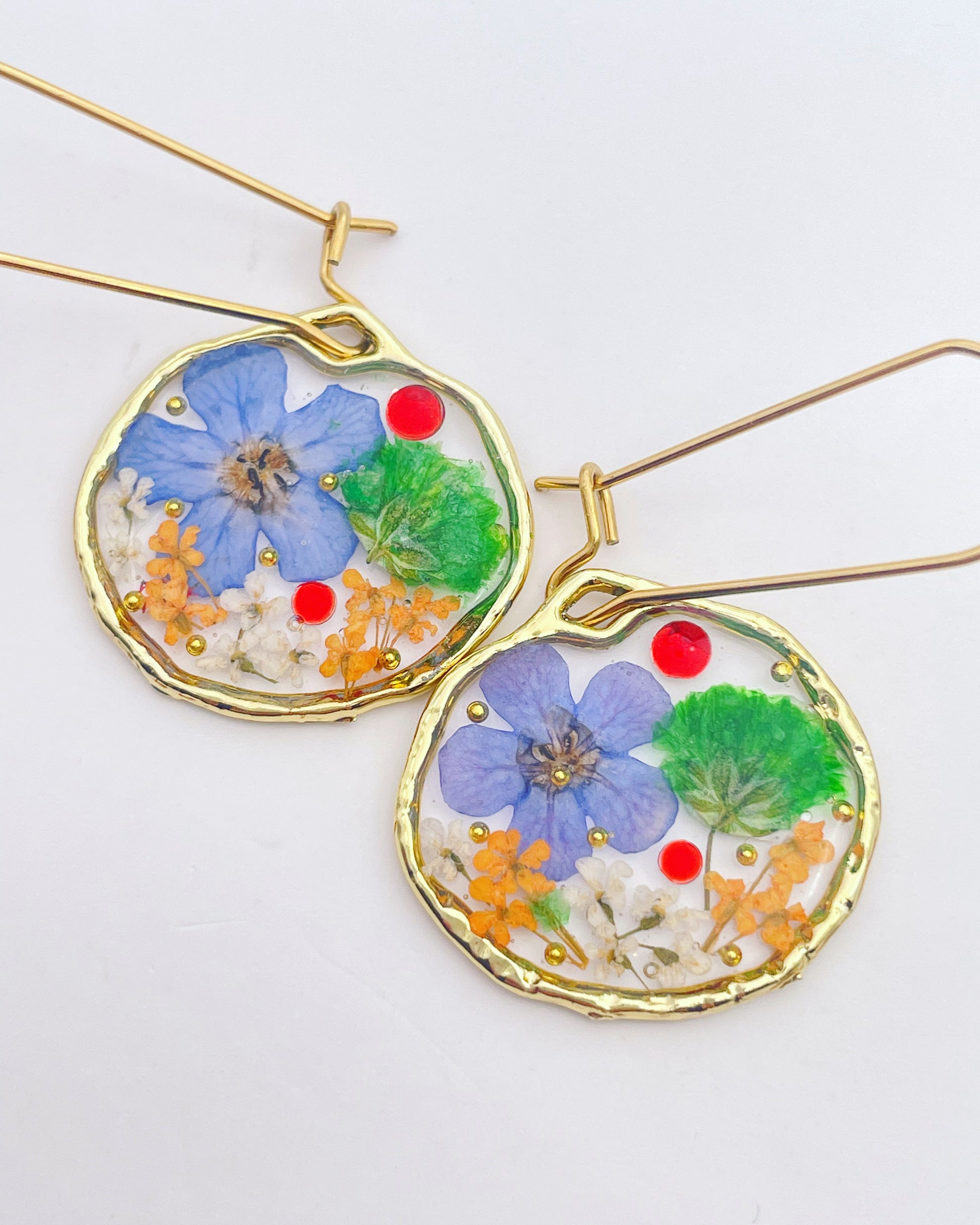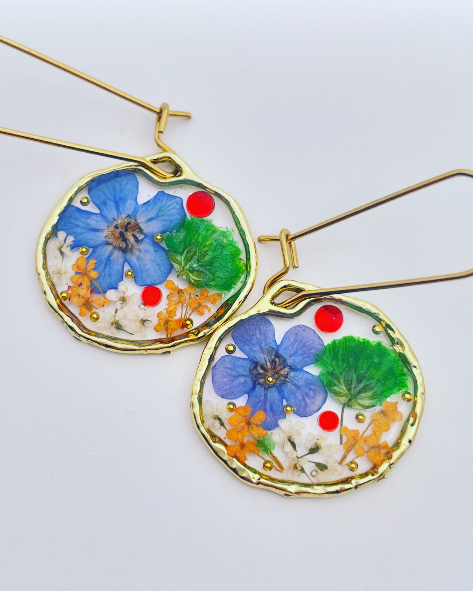 These beautiful statement dangle earrings are handmade with real flowers, crystals and gold beads in resin. Most of the flowers are collected during my walks and pressed/dyed at my workshop in London UK. Each piece is carefully handcrafted by me.