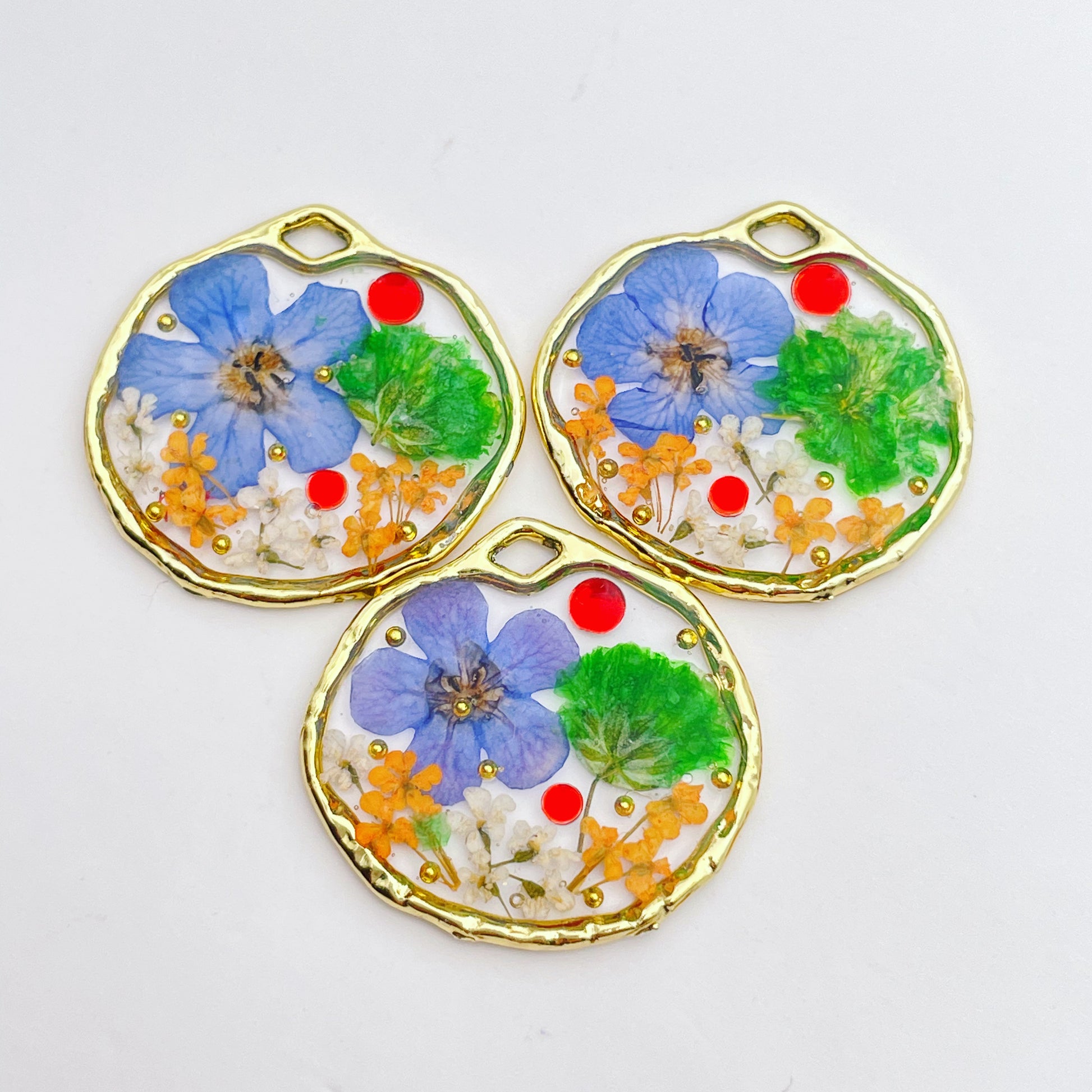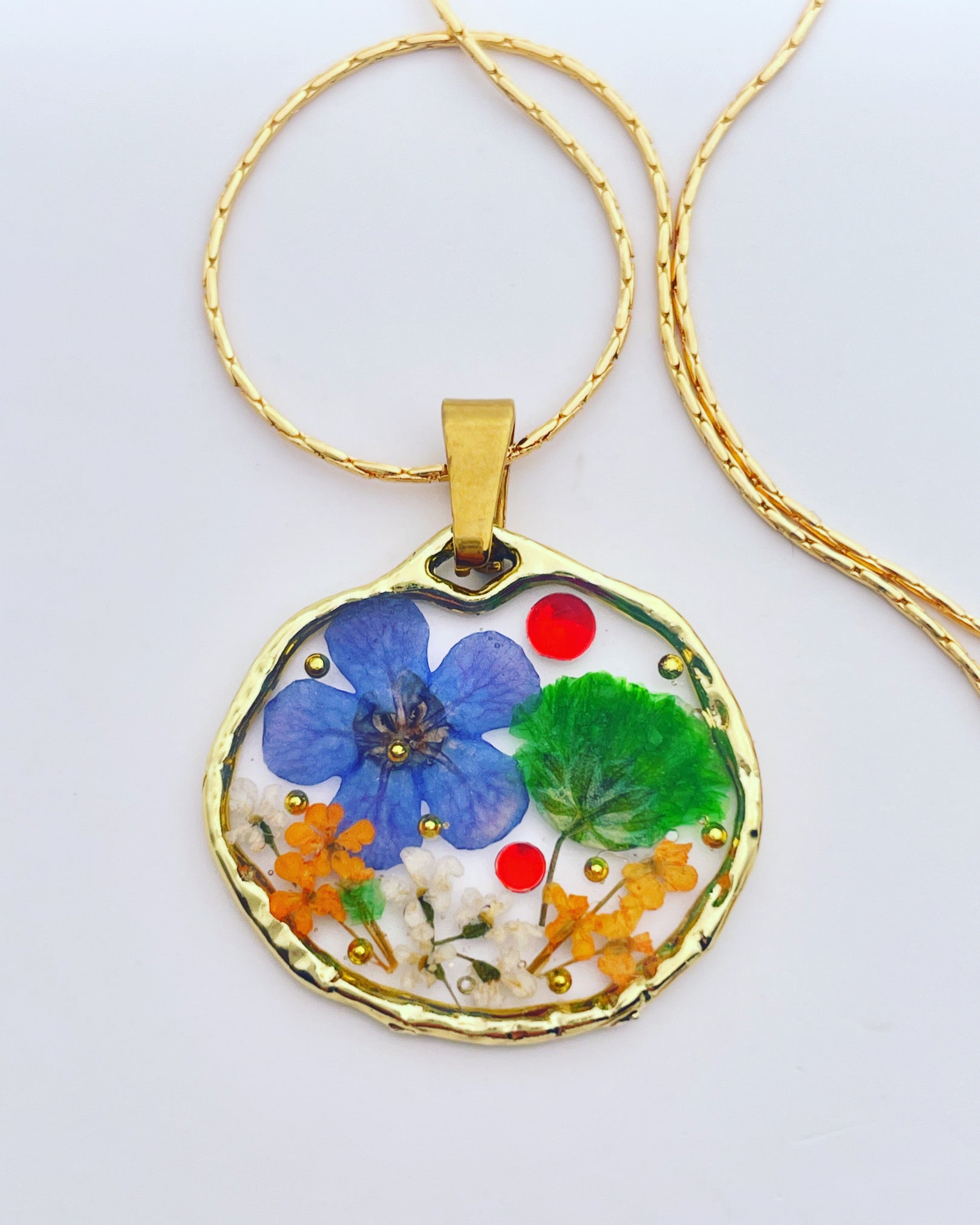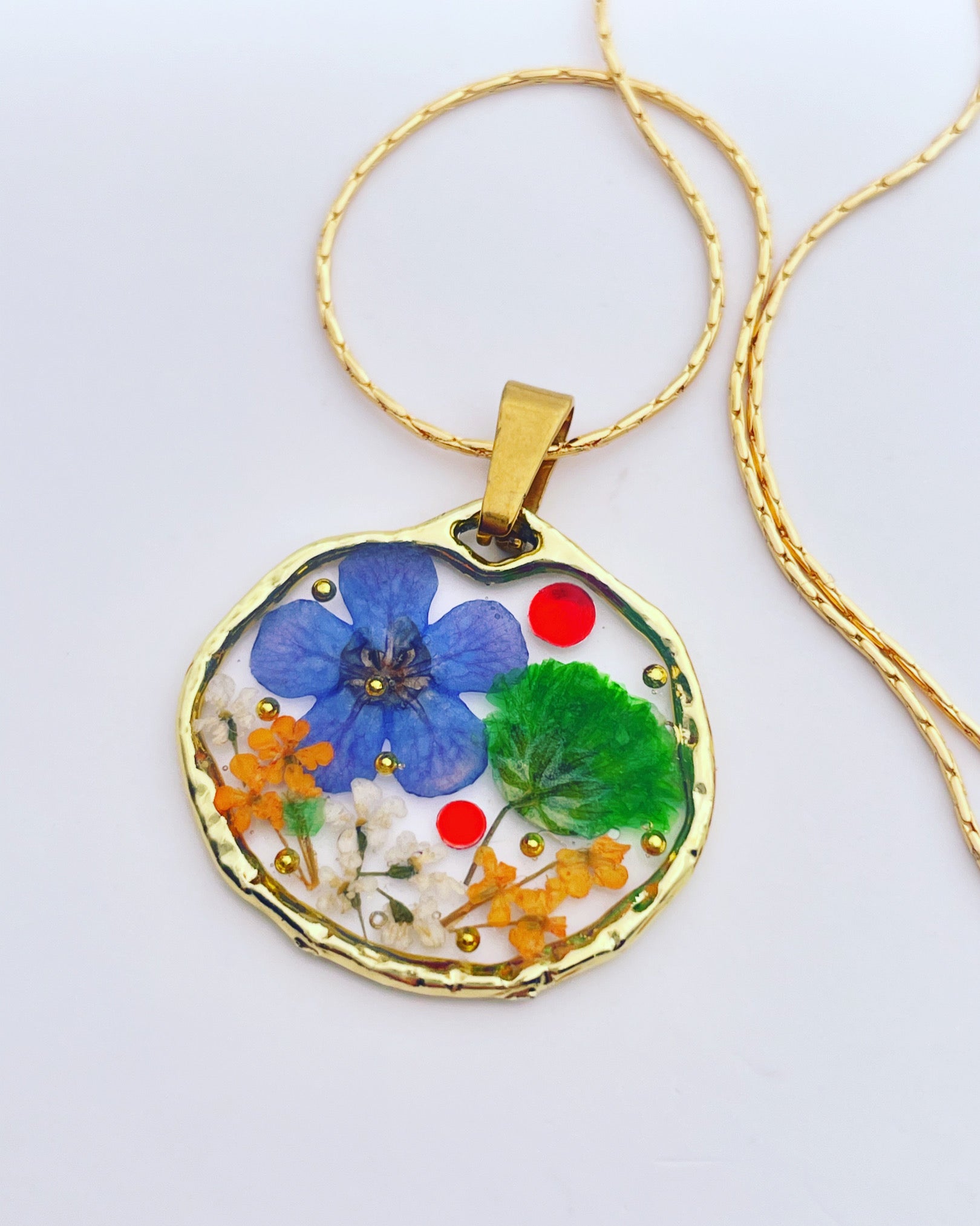 This beautiful pendant necklace is handmade with real flowers, crystals and gold beads in resin. Most of the flowers are collected during my walks and pressed/dyed at my workshop in London, UK. Each piece is carefully handcrafted by me.