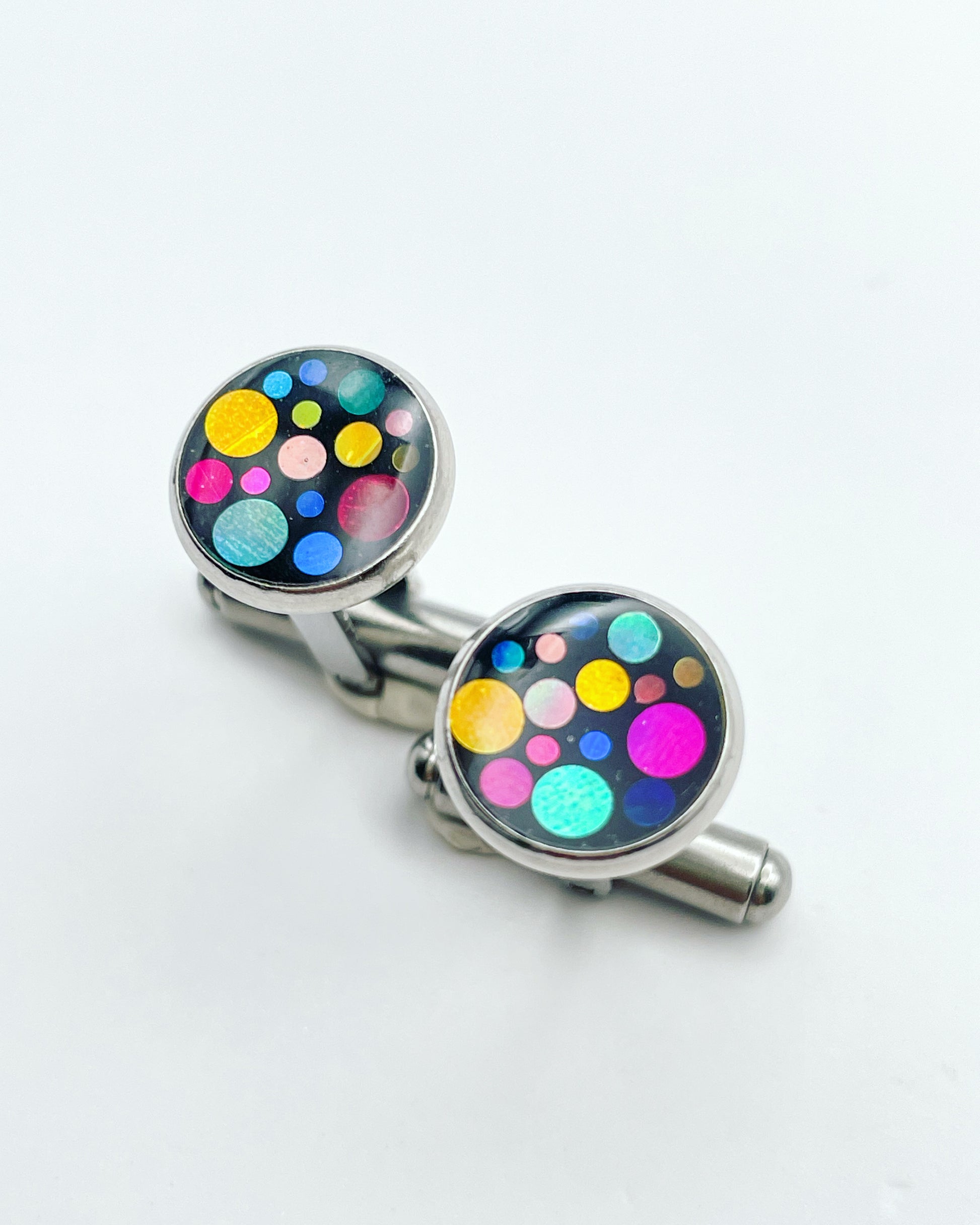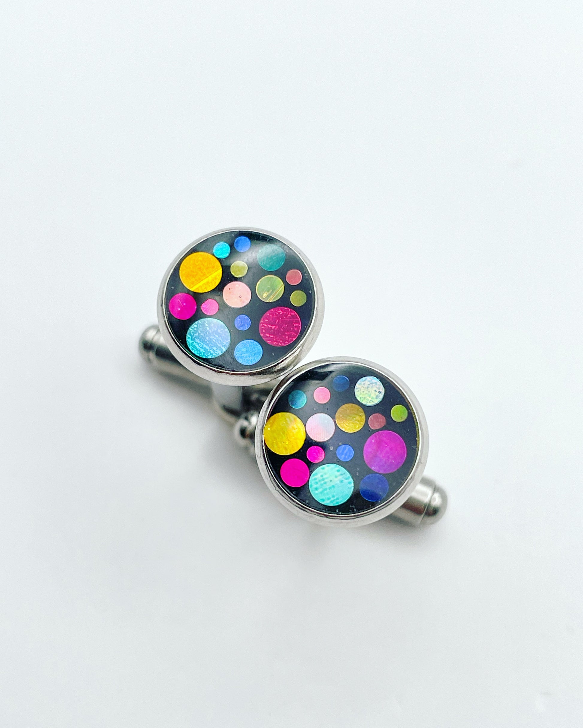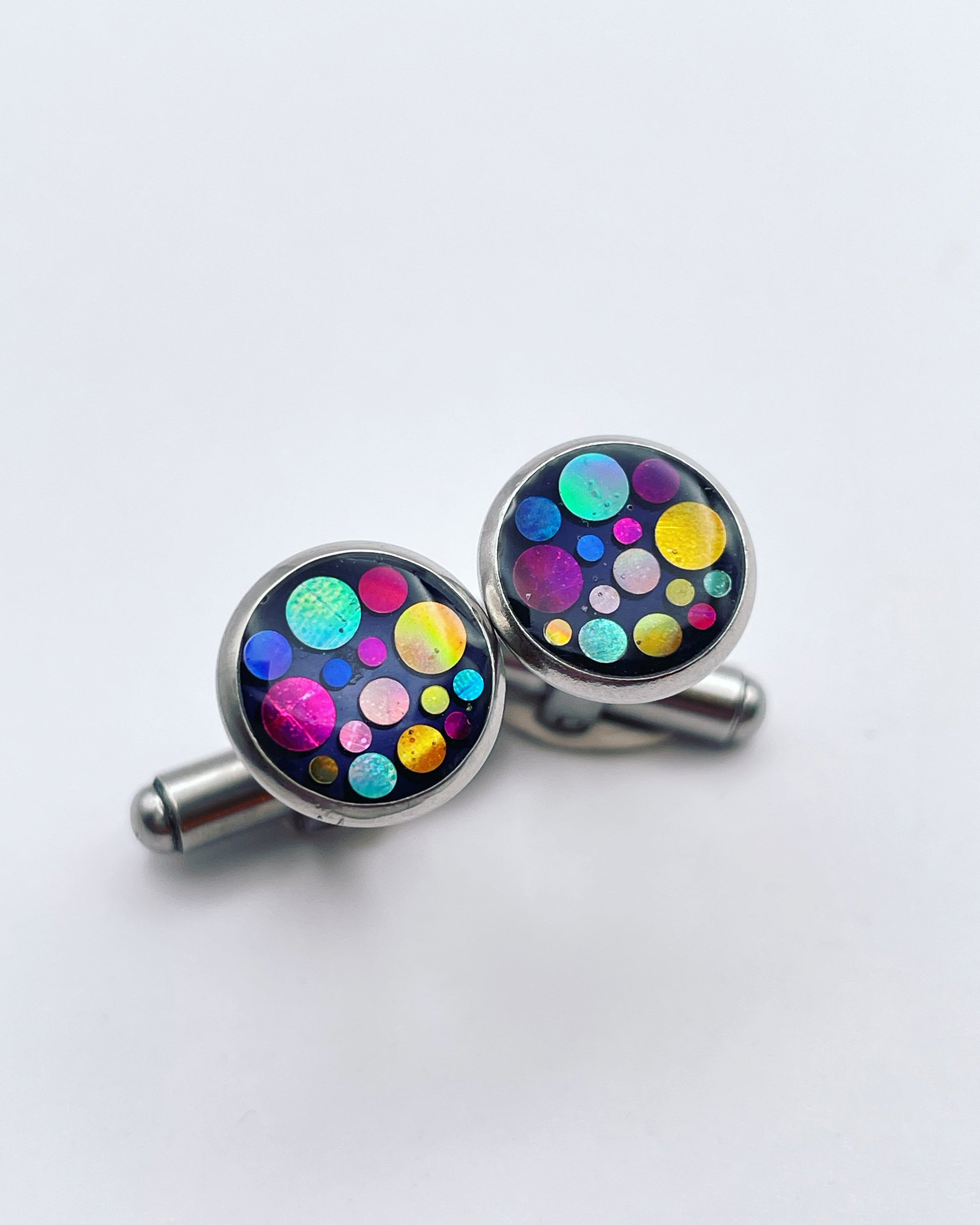 A pair of very elegant and sparkly mini cufflinks handmade with mini holographic sequins embedded in black lacquer. These pieces are inspired by Disco balls! The tiny iridescent sequins change colour and shine in the light for a very refined and festive look! Each piece is carefully handcrafted by me at my workshop in London UK.