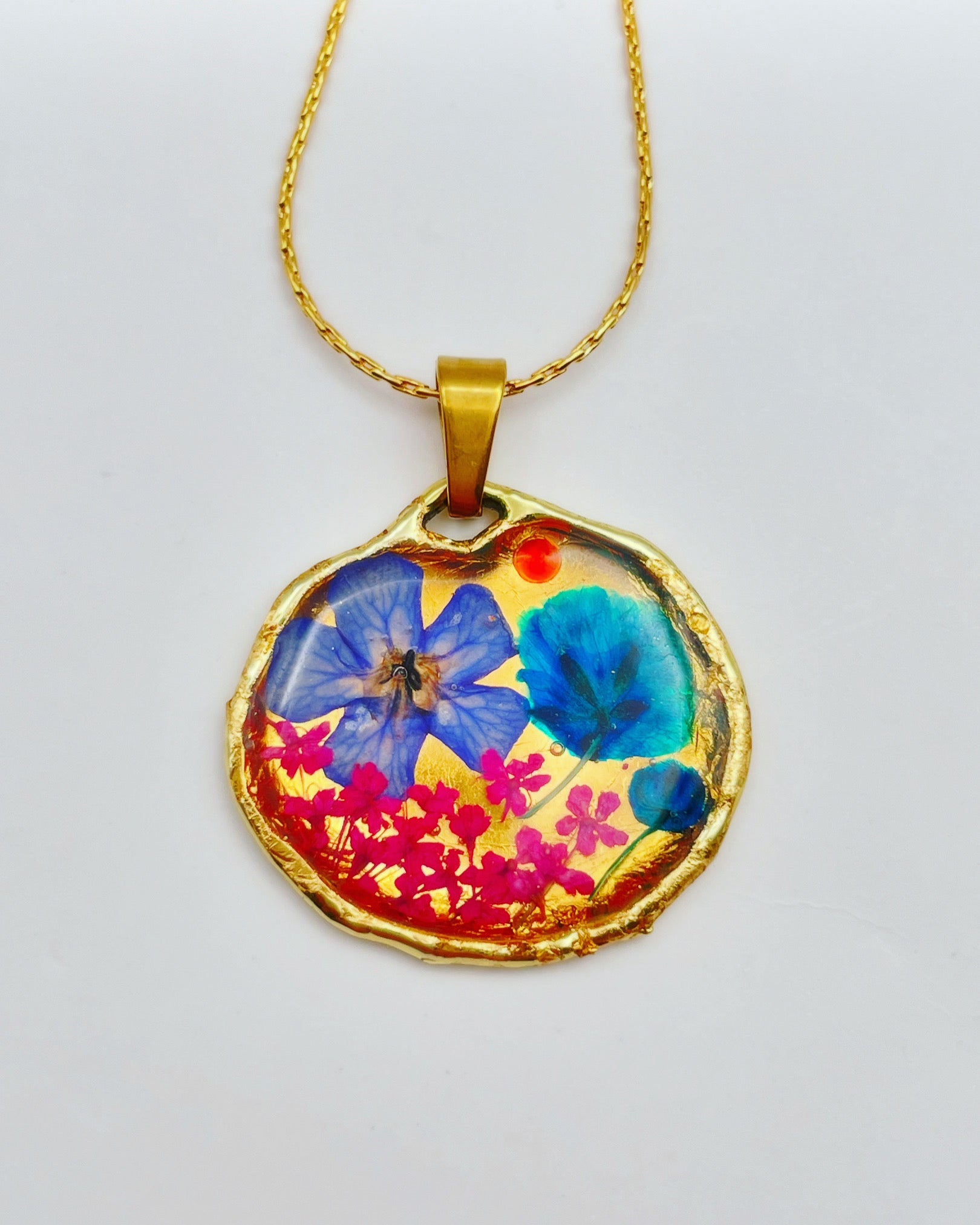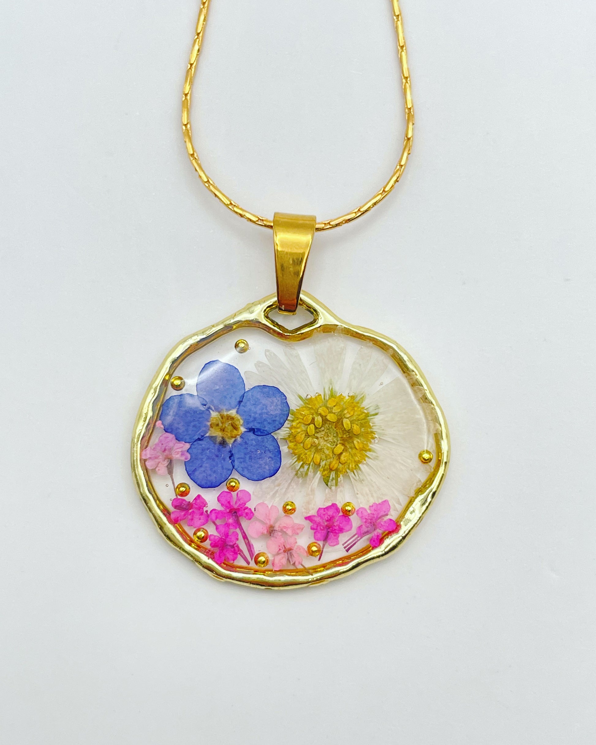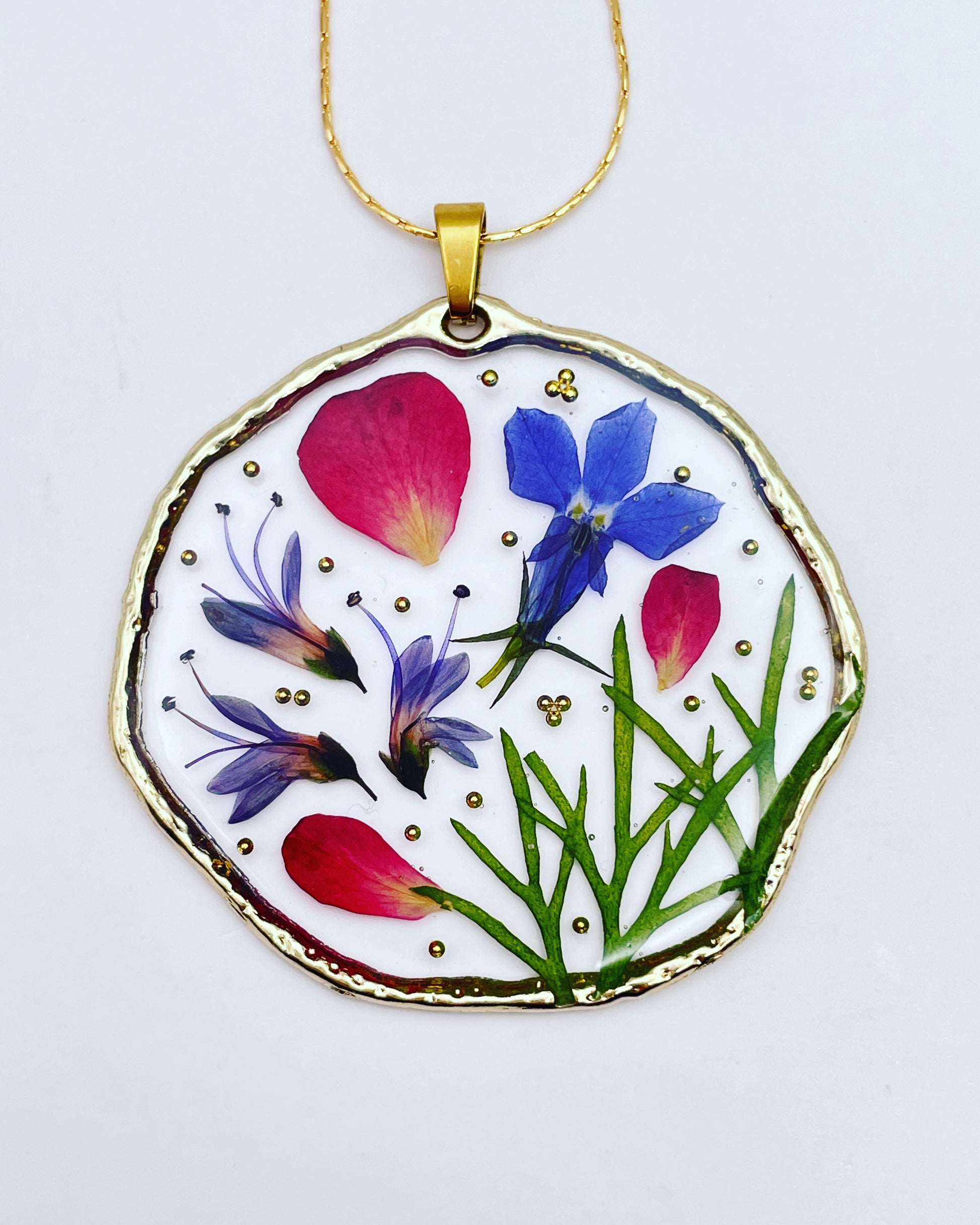 This customisable pendant necklace is handmade with real flowers, crystals and gold beads in resin. Most of the flowers are collected during my walks and pressed at my workshop in London UK. Each piece is carefully handcrafted by me.