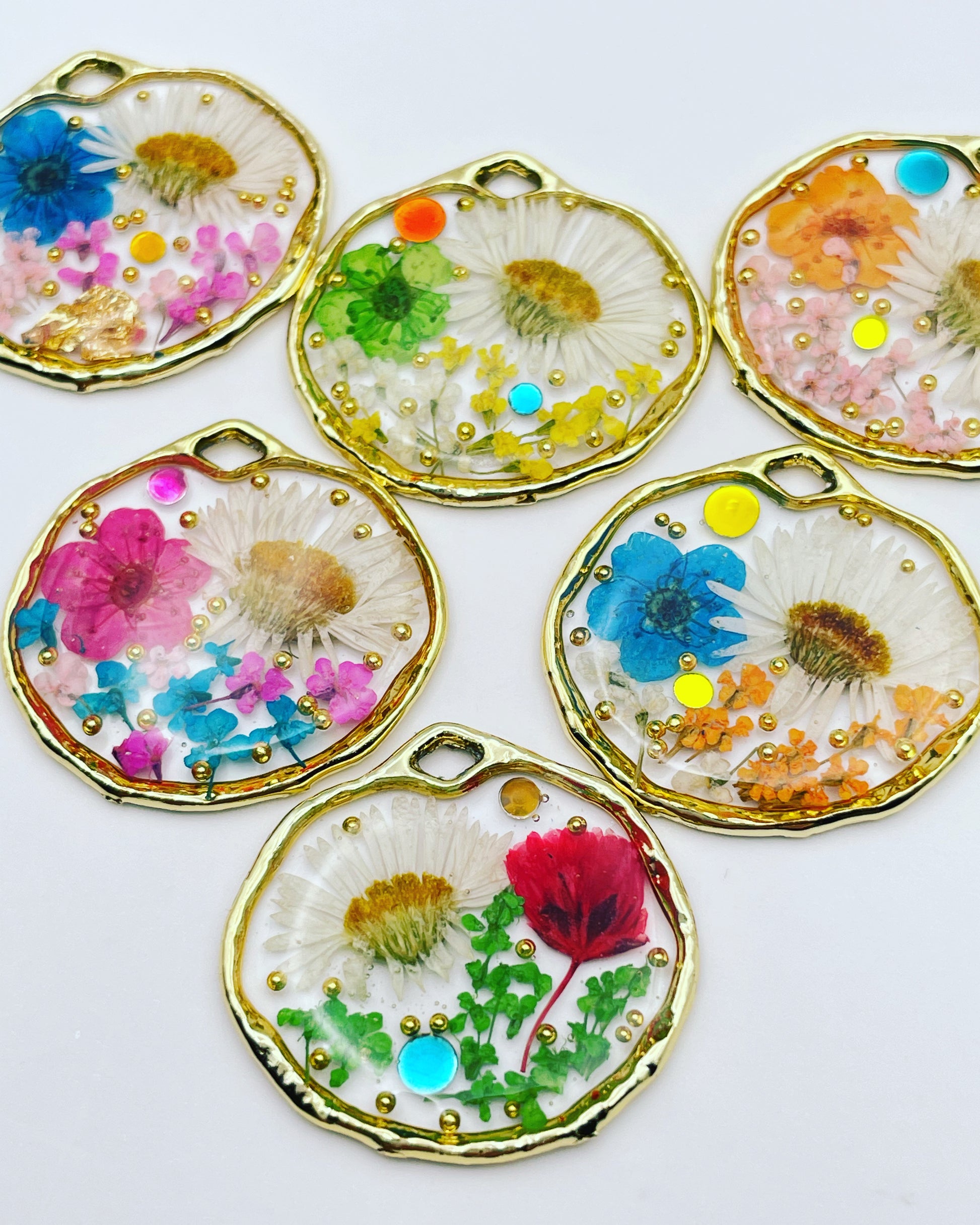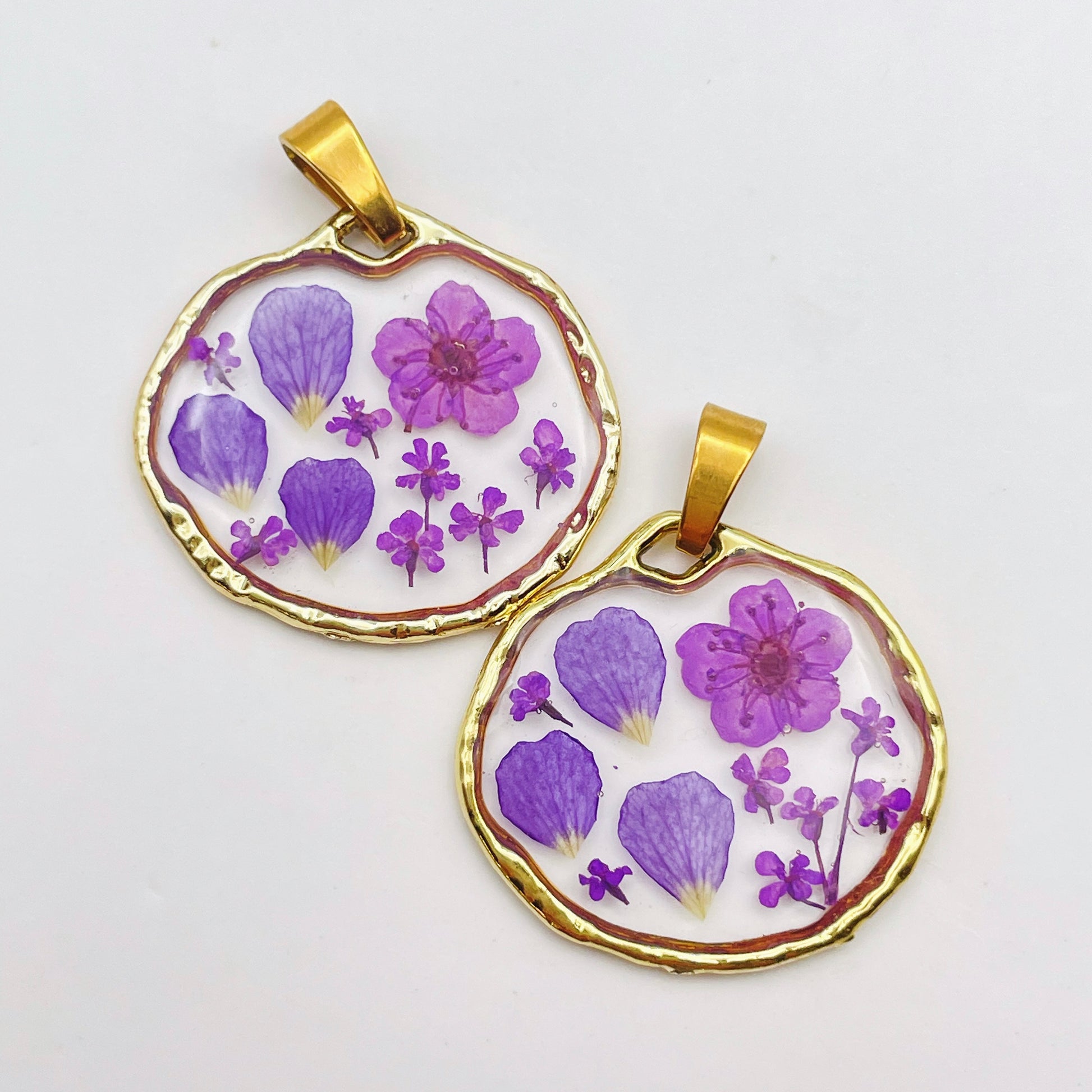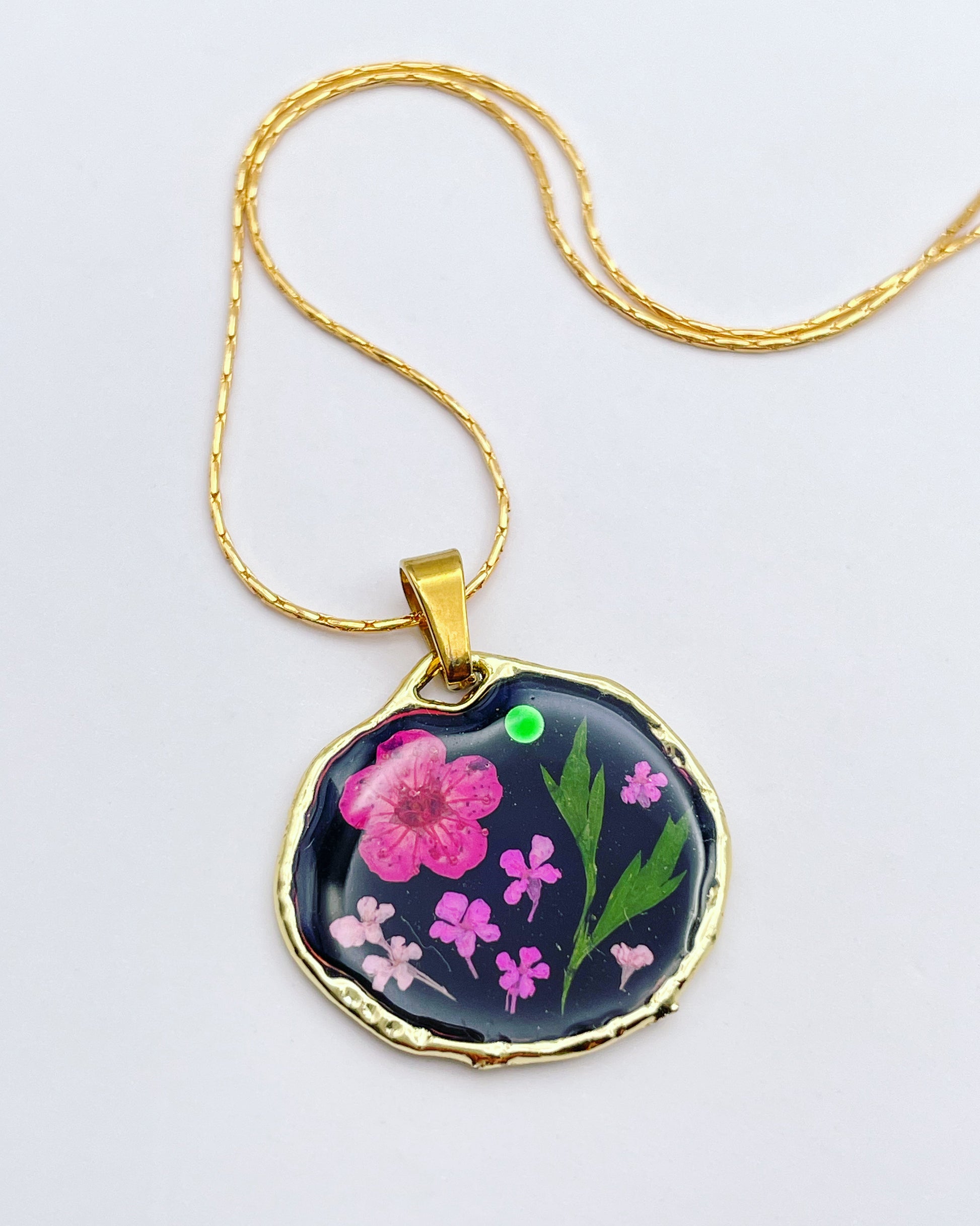 This customisable pendant necklace is handmade with real flowers, crystals and gold beads in resin. Most of the flowers are collected during my walks and pressed at my workshop in London UK. Each piece is carefully handcrafted by me.
