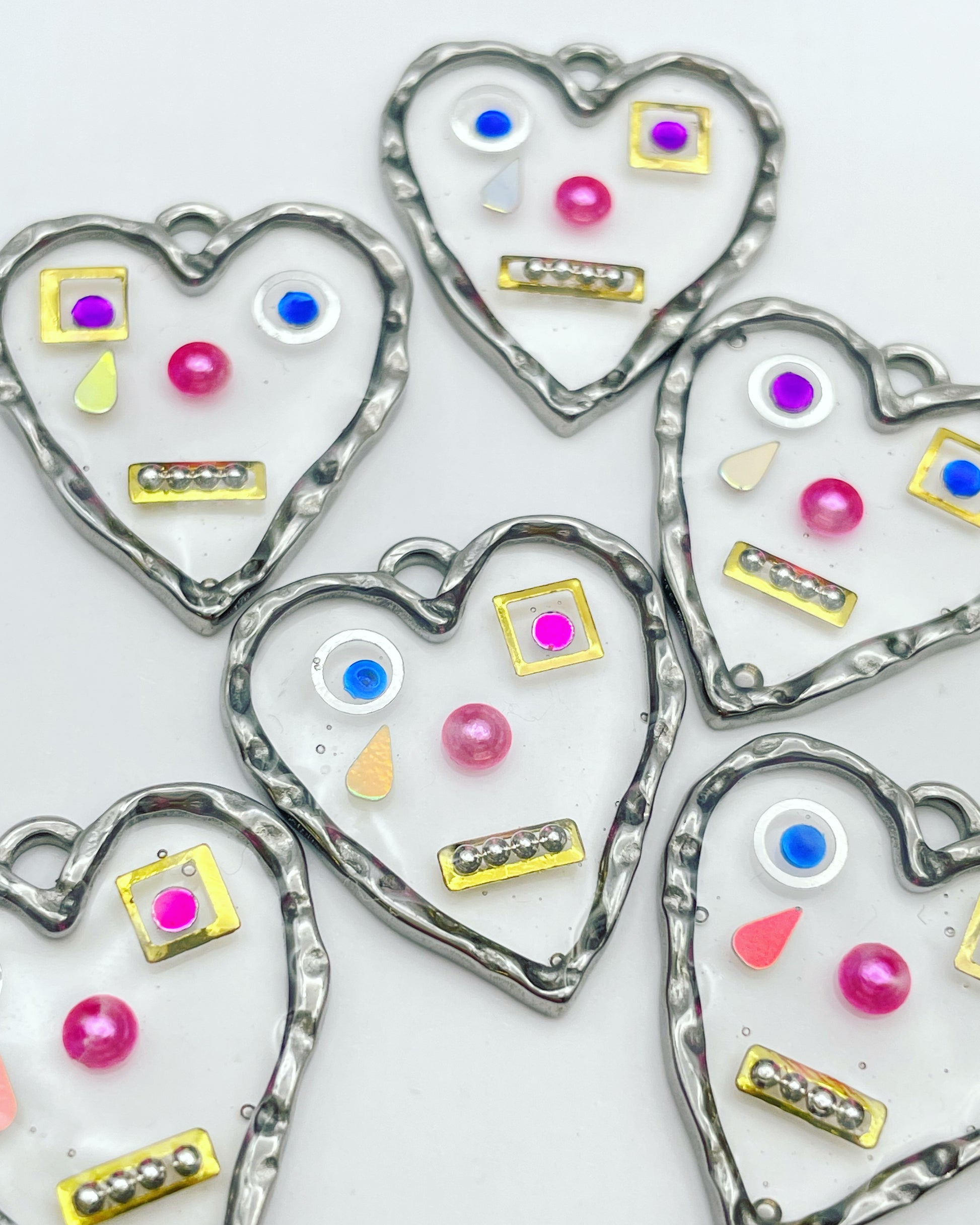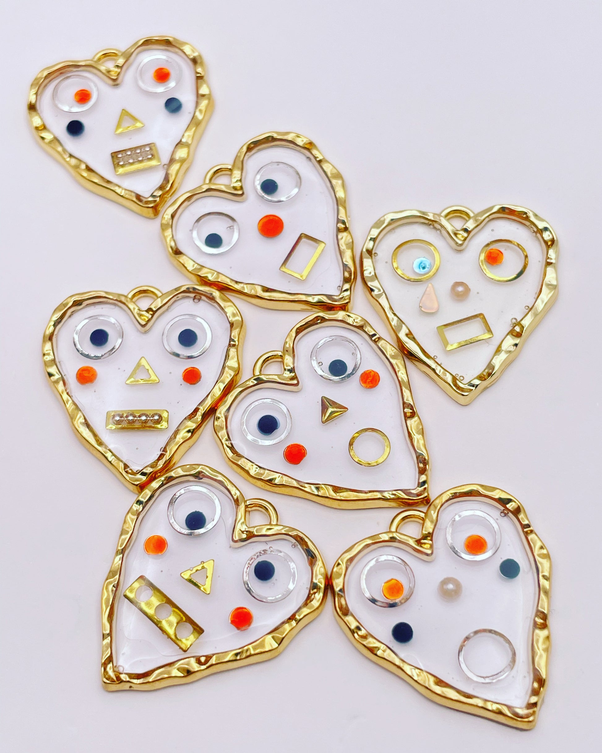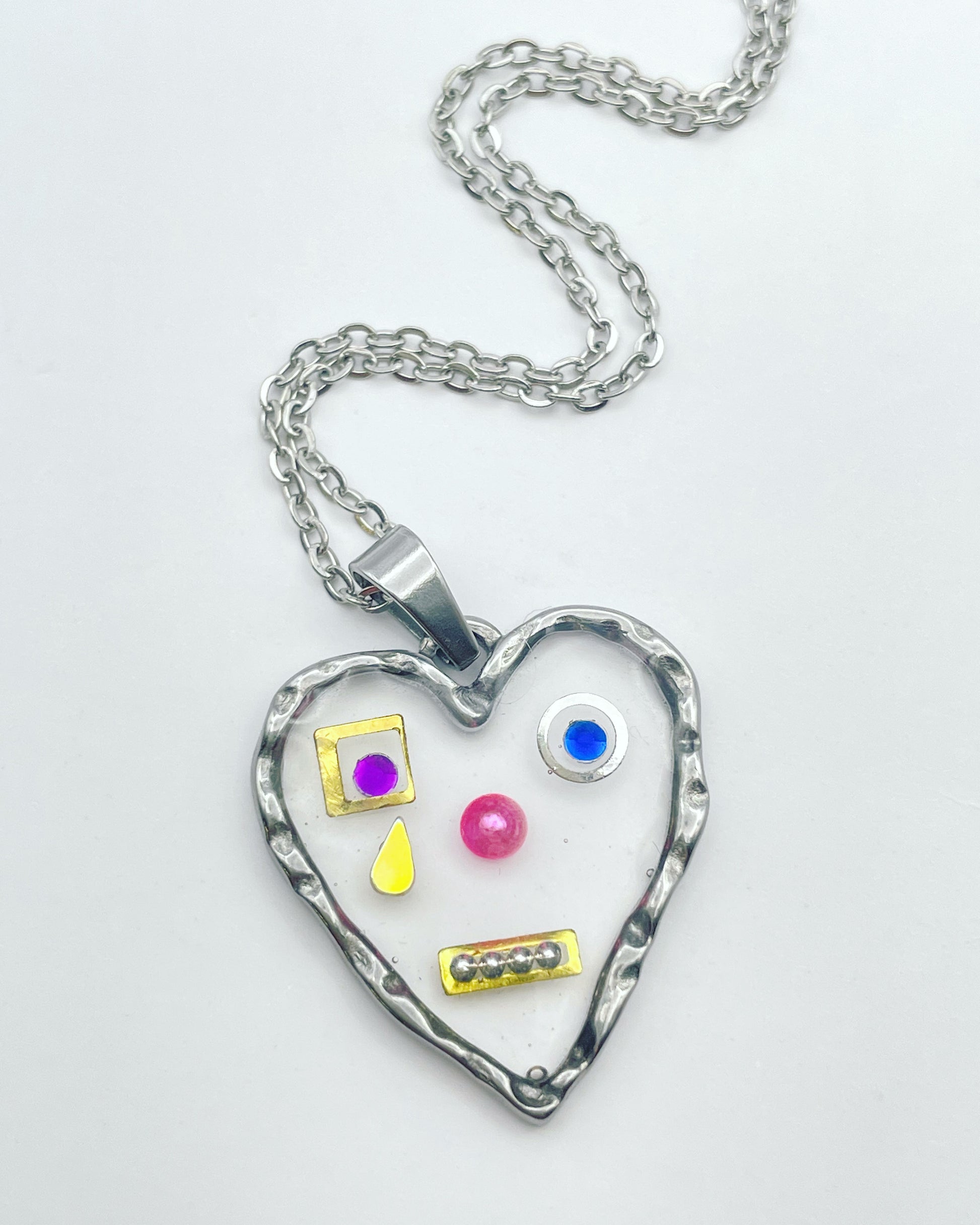 A very kawaii heart pendant necklace handmade with mini pearls, beads, crystals and studs embedded in non-toxic resin. My inspiration for this collection is Cute Robots! I want my pieces to show a lot of personality and cuteness. They are perfect for quirky people who want to bring a bit of playfulness and colour in their daily life. They will go with any outfit since they are fun yet very refined.