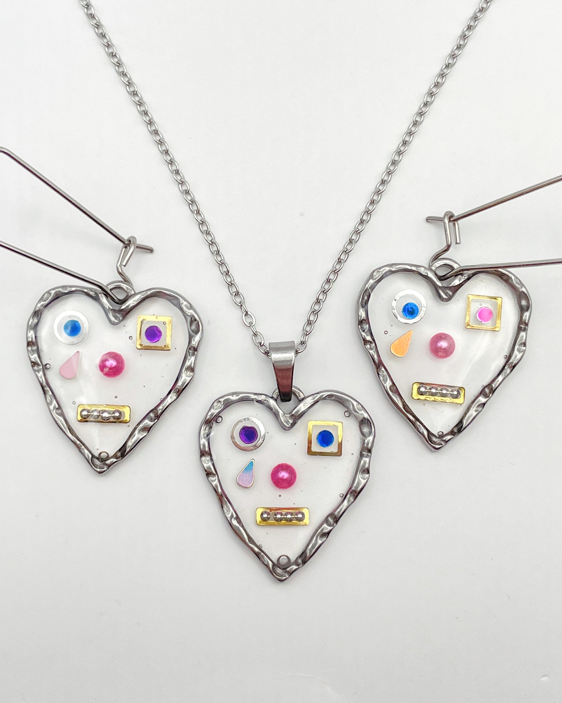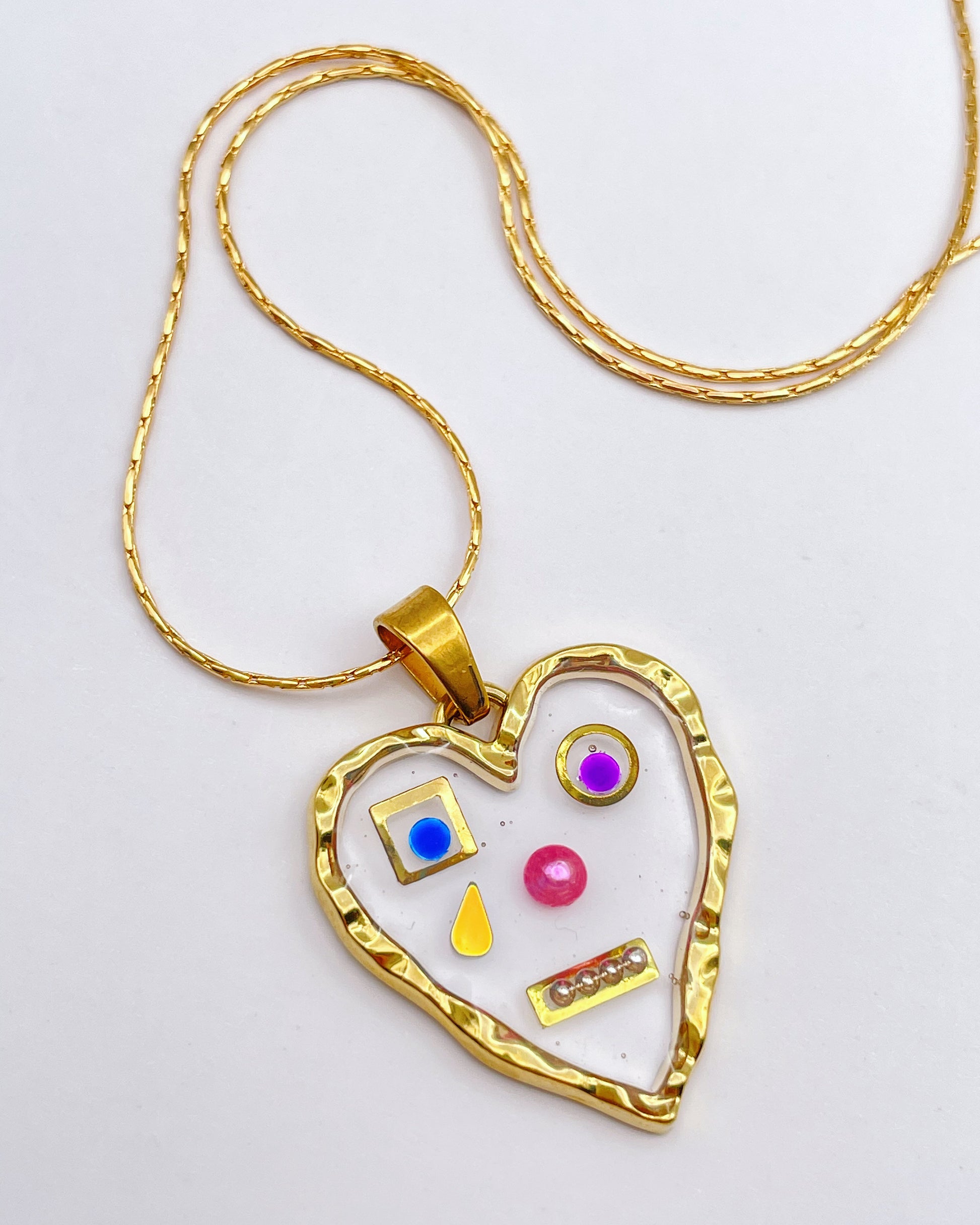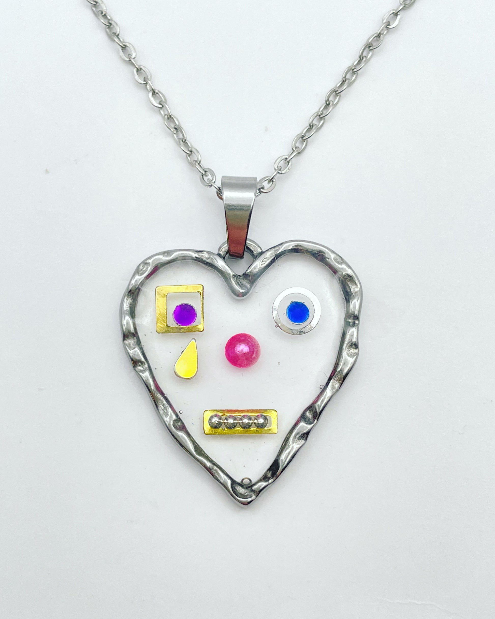 A very kawaii heart pendant necklace handmade with mini pearls, beads, crystals and studs embedded in non-toxic resin. My inspiration for this collection is Cute Robots! I want my pieces to show a lot of personality and cuteness. They are perfect for quirky people who want to bring a bit of playfulness and colour in their daily life. They will go with any outfit since they are fun yet very refined.