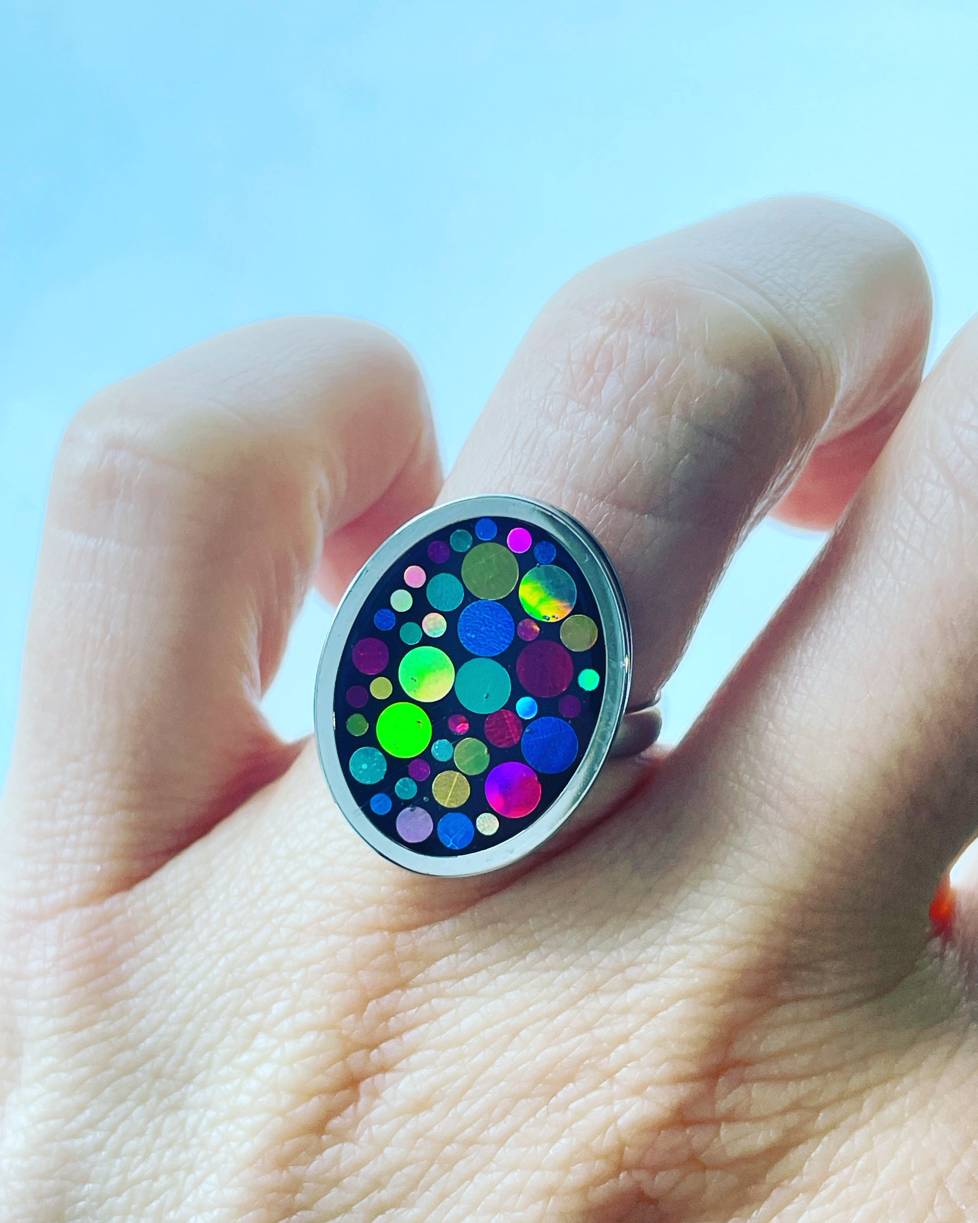 This fabulous sparkly cocktail ring is handmade with mini hollographic sequins in black lacquer. My inspiration for this collection is Disco balls! These pieces are perfect for festive occasions or if you want to bring extra sparkle into your daily life. They will go with any outfit since they are fun and very elegant.