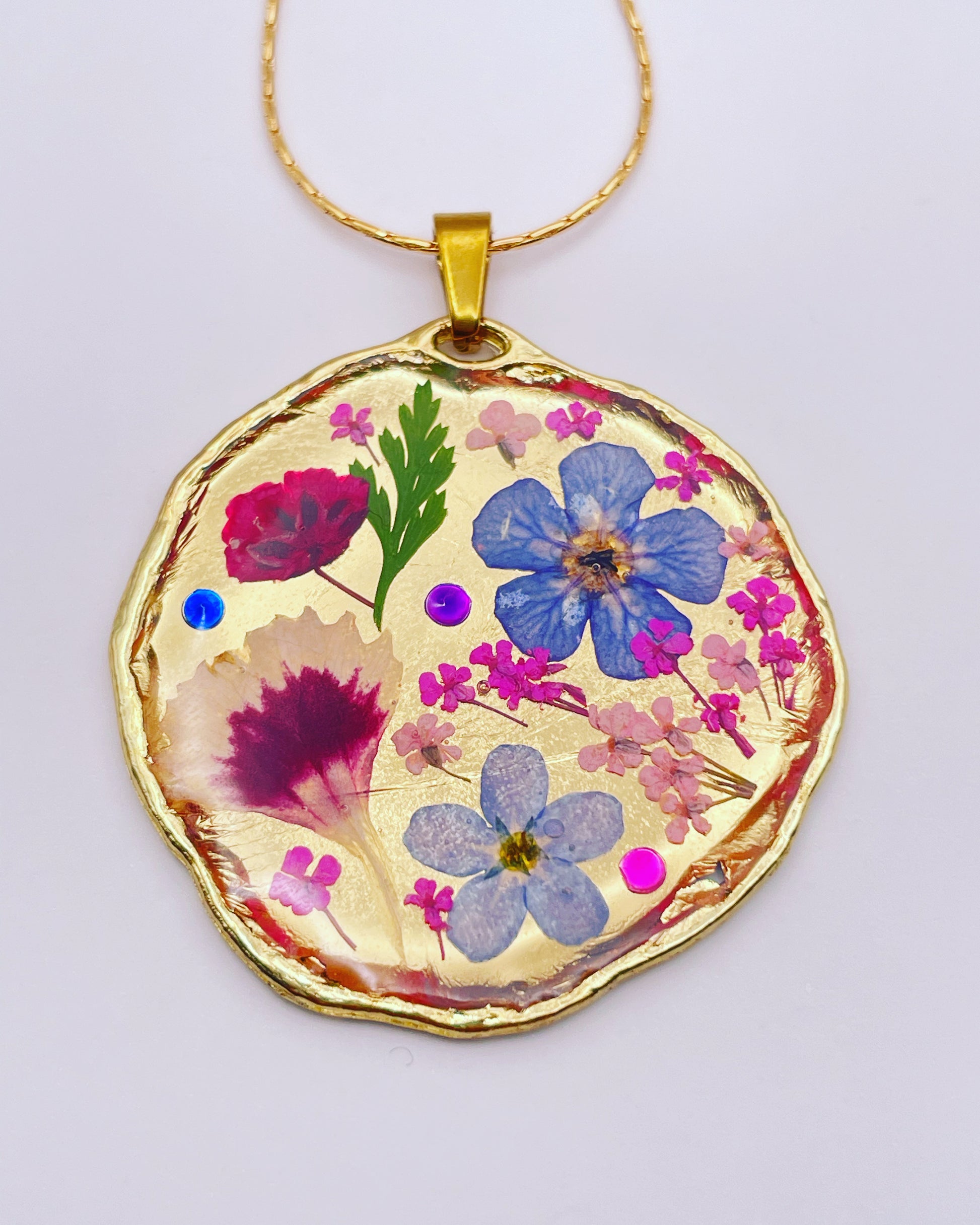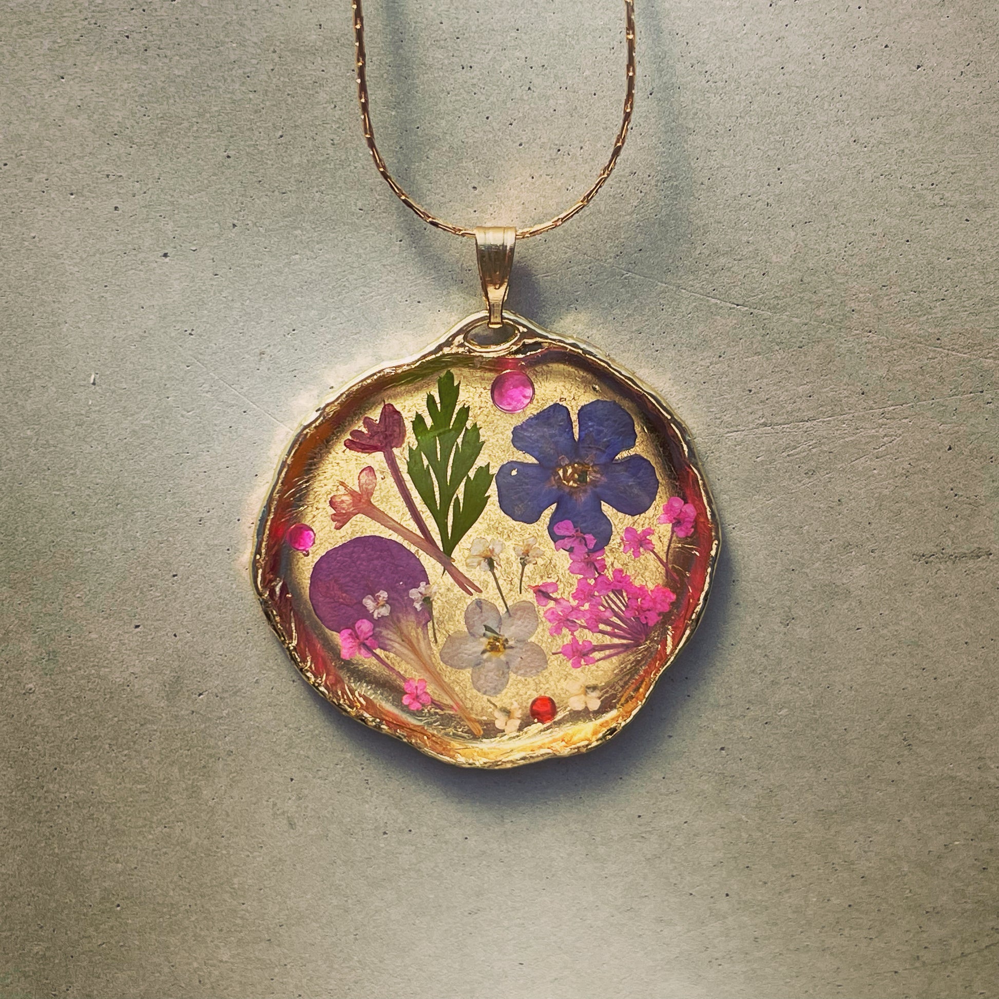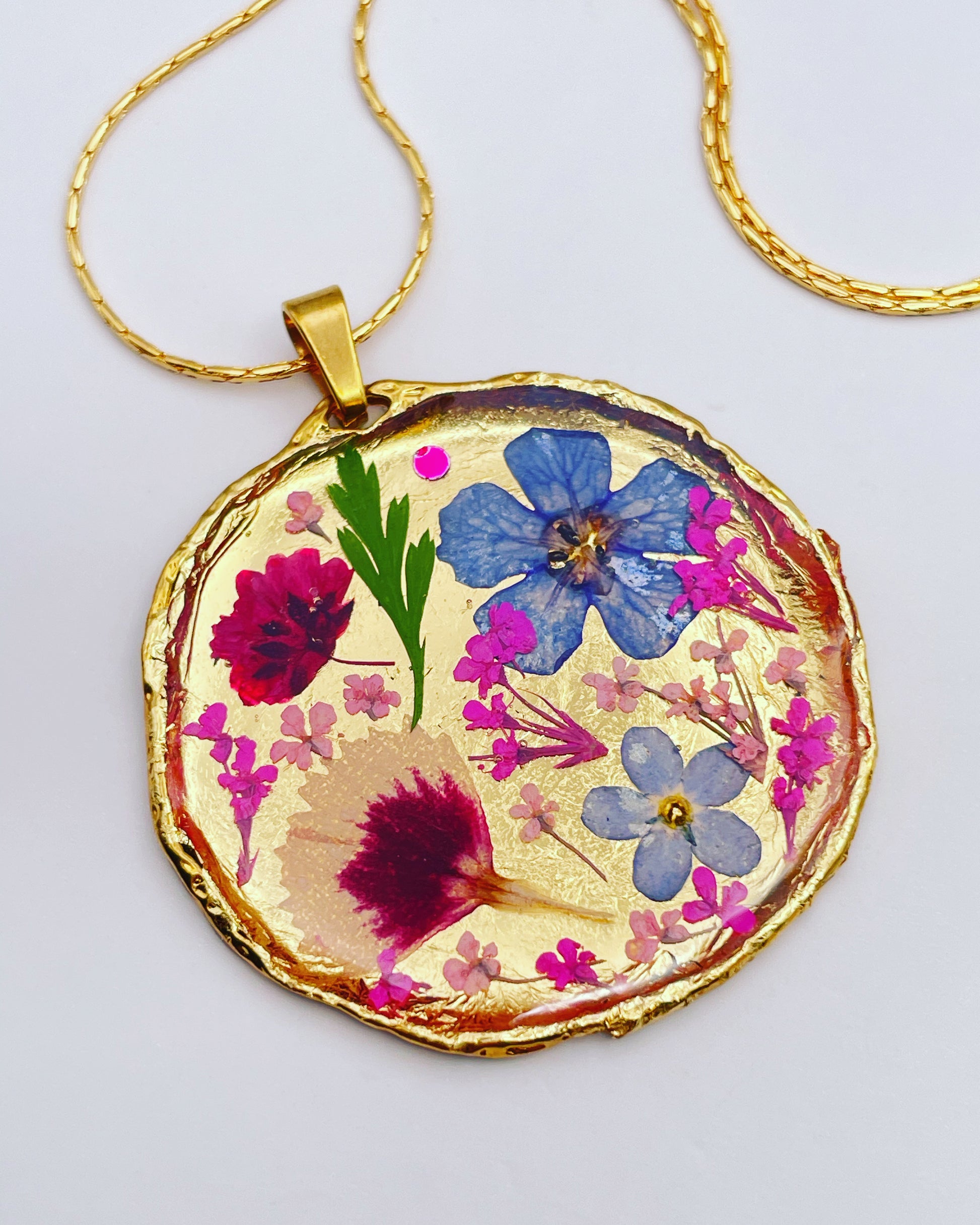 A beautiful statement pendant necklace handmade with real Gypsophila and forget-me-nots in resin with a shinny gold leaf background. Most of the flowers are collected during my walks and pressed/dyed at my workshop in London UK. My inspiration for this collection is gold leaf icons. A layer gold leaf applied by hand on the background, which gives the earrings a luxurious and shimmery look.