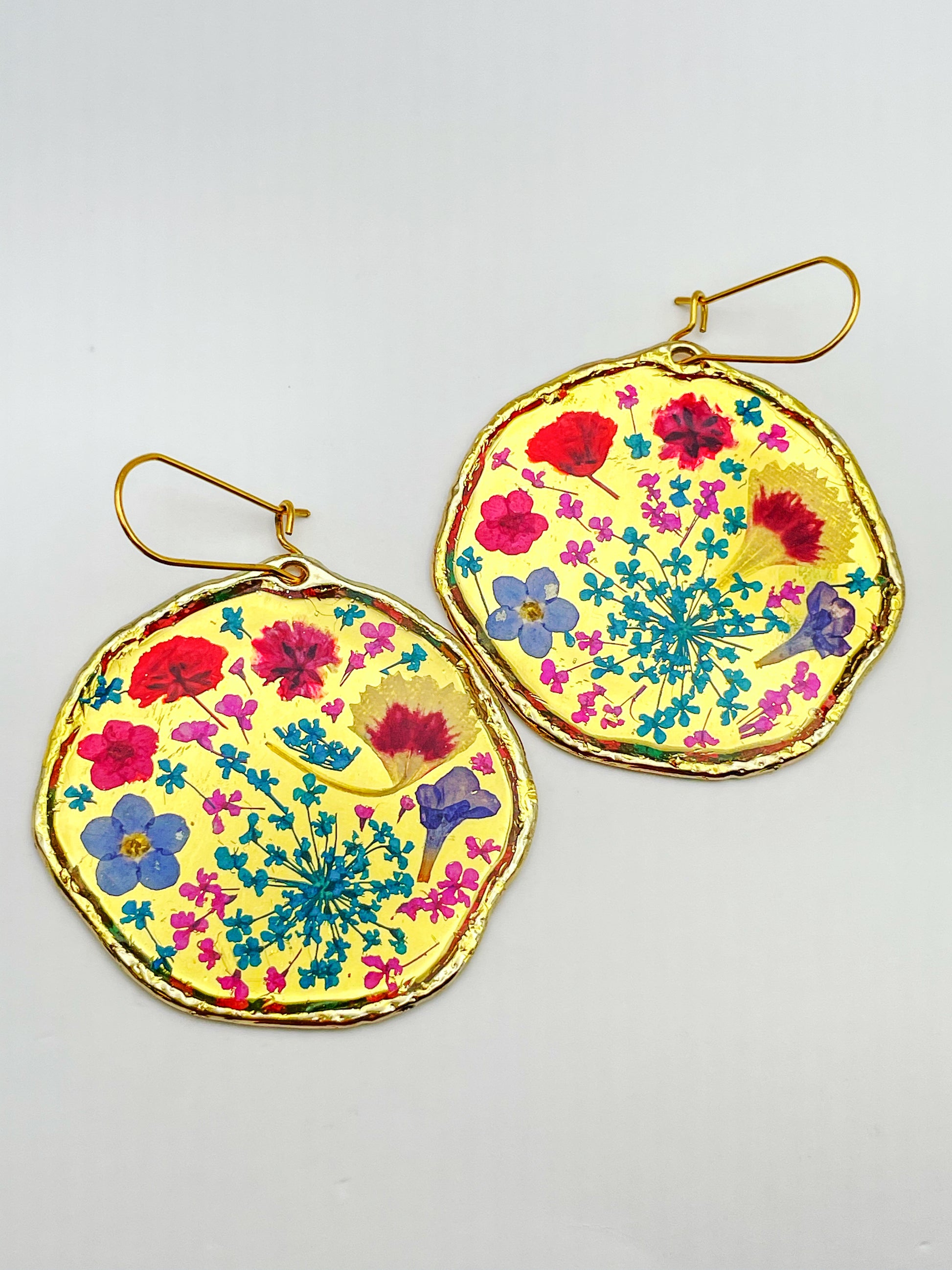 A beautiful pair of statement dangle earrings handmade with real flowers and crystals in resin with a shinny gold leaf background. Most of the flowers are collected during my walks and pressed/dyed at my workshop in London UK. My inspiration for this collection is gold leaf icons. A layer gold leaf applied by hand on the background, which gives the earrings a luxurious and shimmery look.