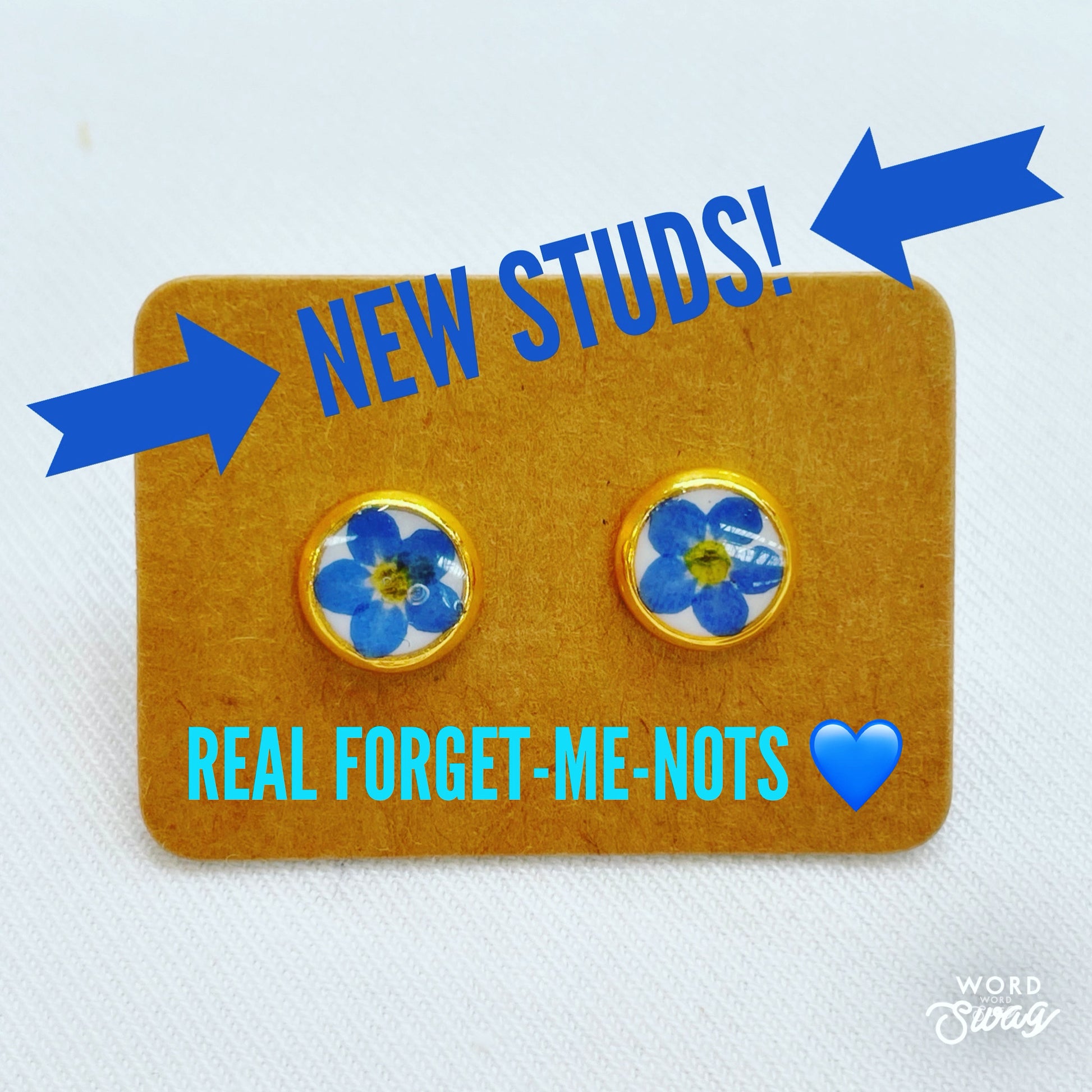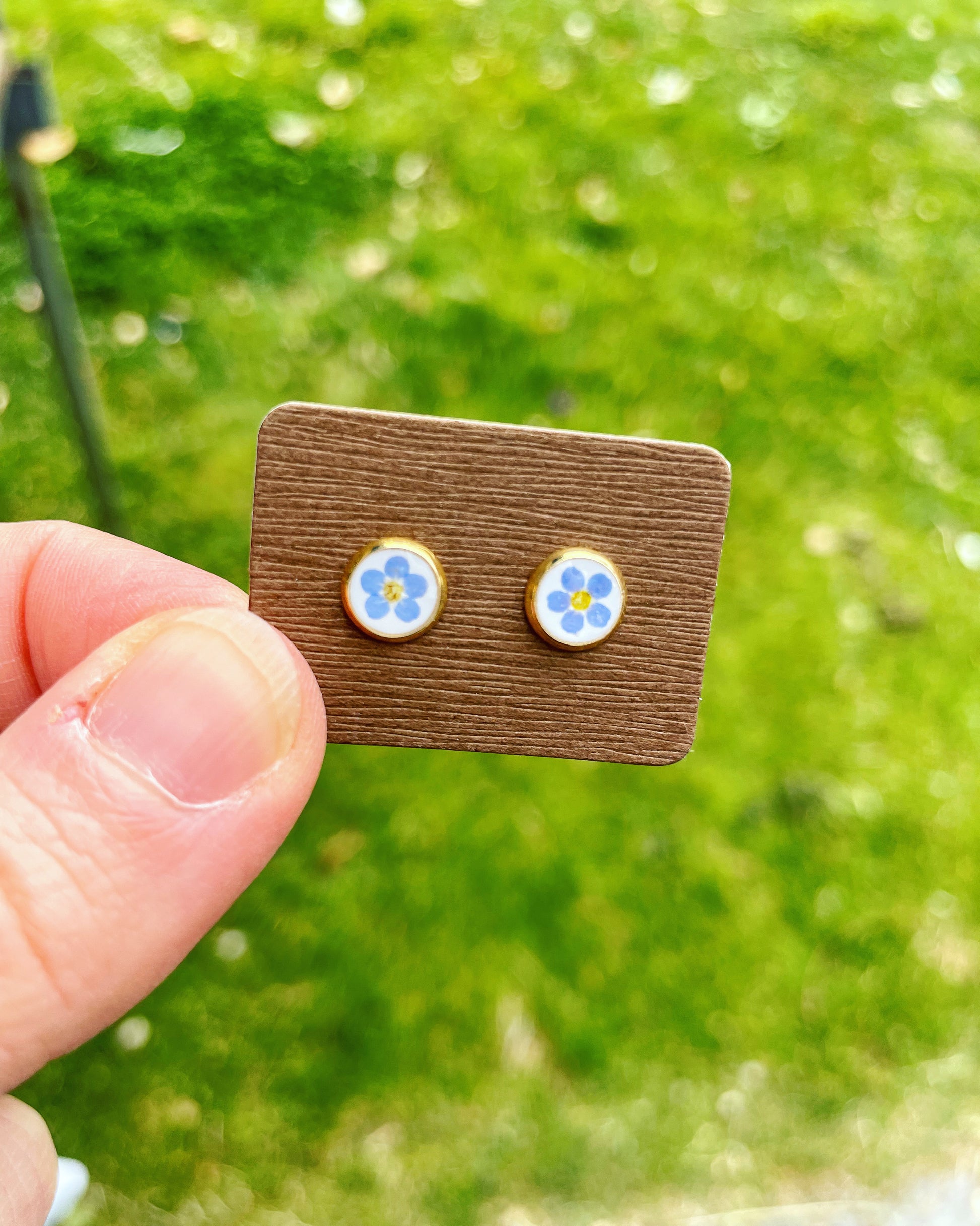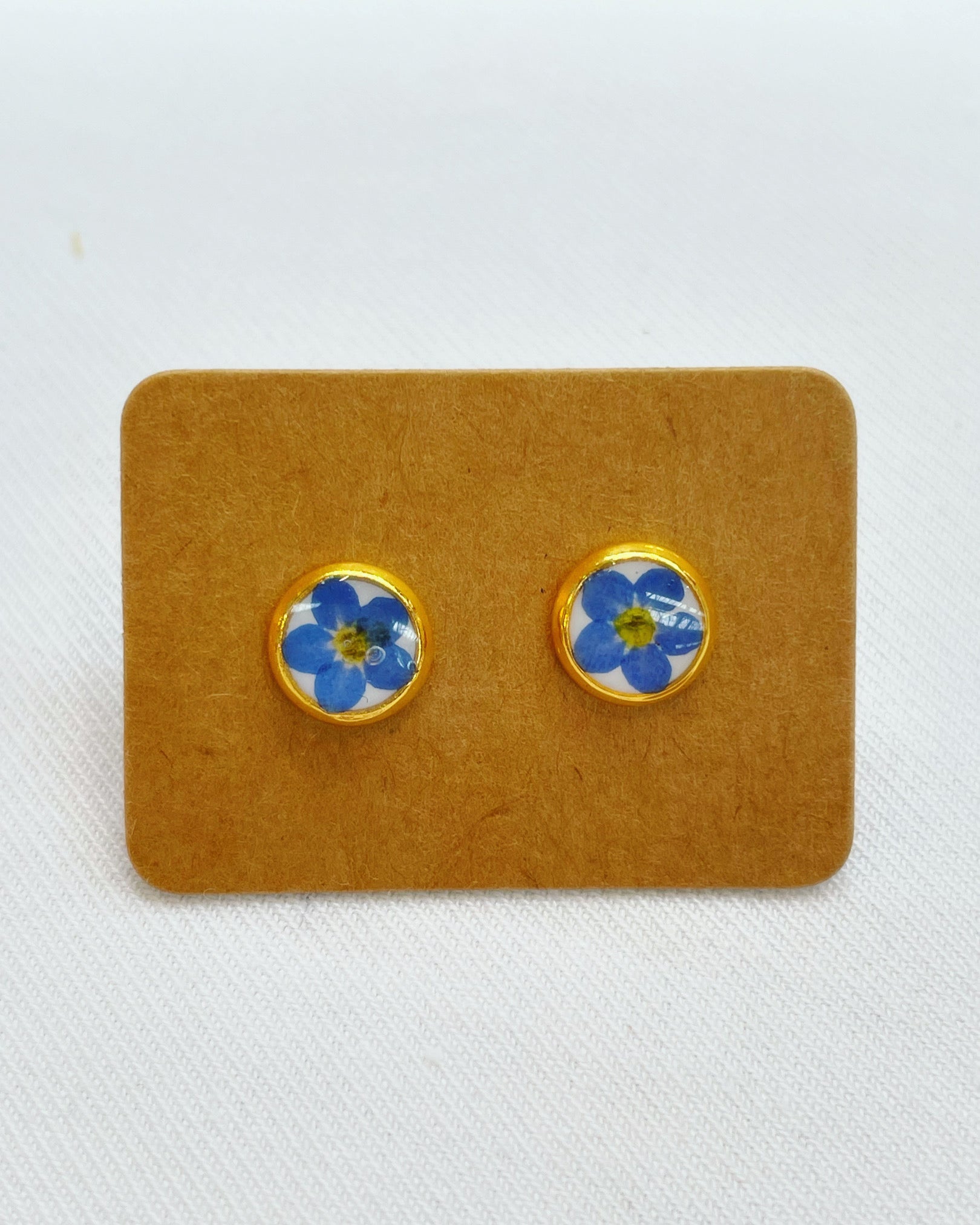 A pair of beautiful mini stud earrings handmade by me with real forget-me-not flowers embedded in white lacquer. Most of the flowers are collected during my walks and pressed/dyed at my workshop in London UK. Each piece is carefully handcrafted by me.
