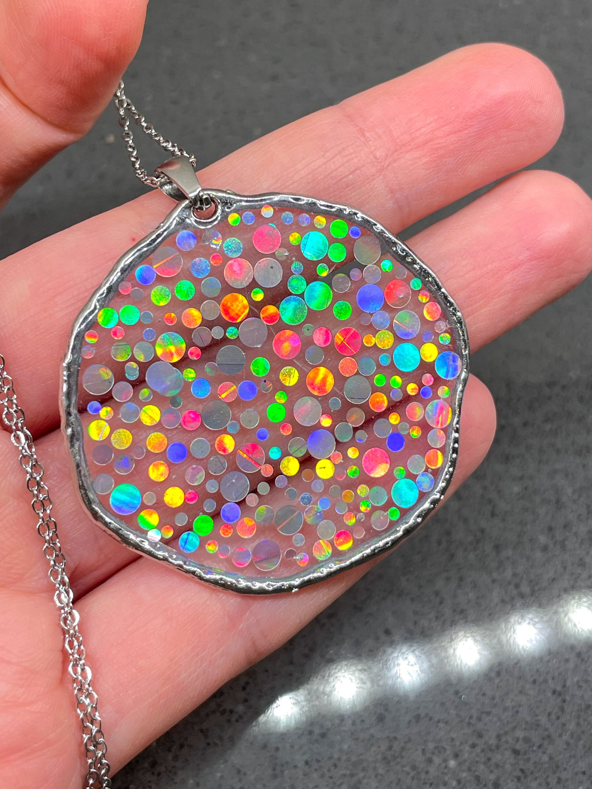 Sparkly statement pendant necklace handmade with tiny colourful sequins in resin. My inspiration for this collection is Disco balls! The tiny iridescent sequins change colour and shine in the light for a very refined and festive look. Each piece is carefully handcrafted by me at my workshop in London UK.