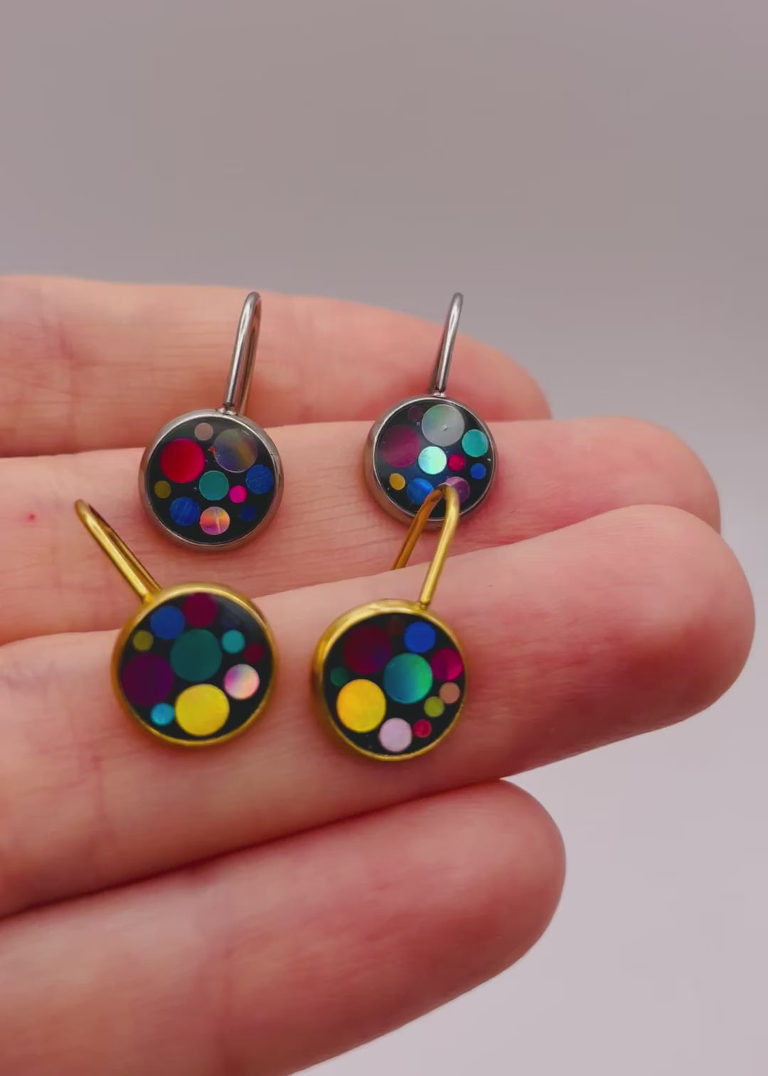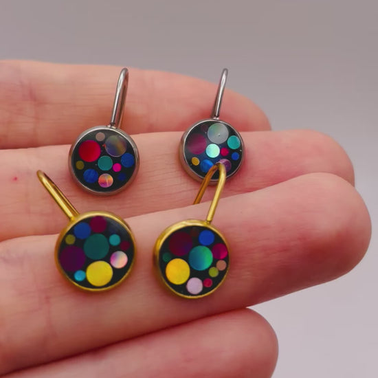 Mini disco drop earrings with colourful sparkles in black lacquer