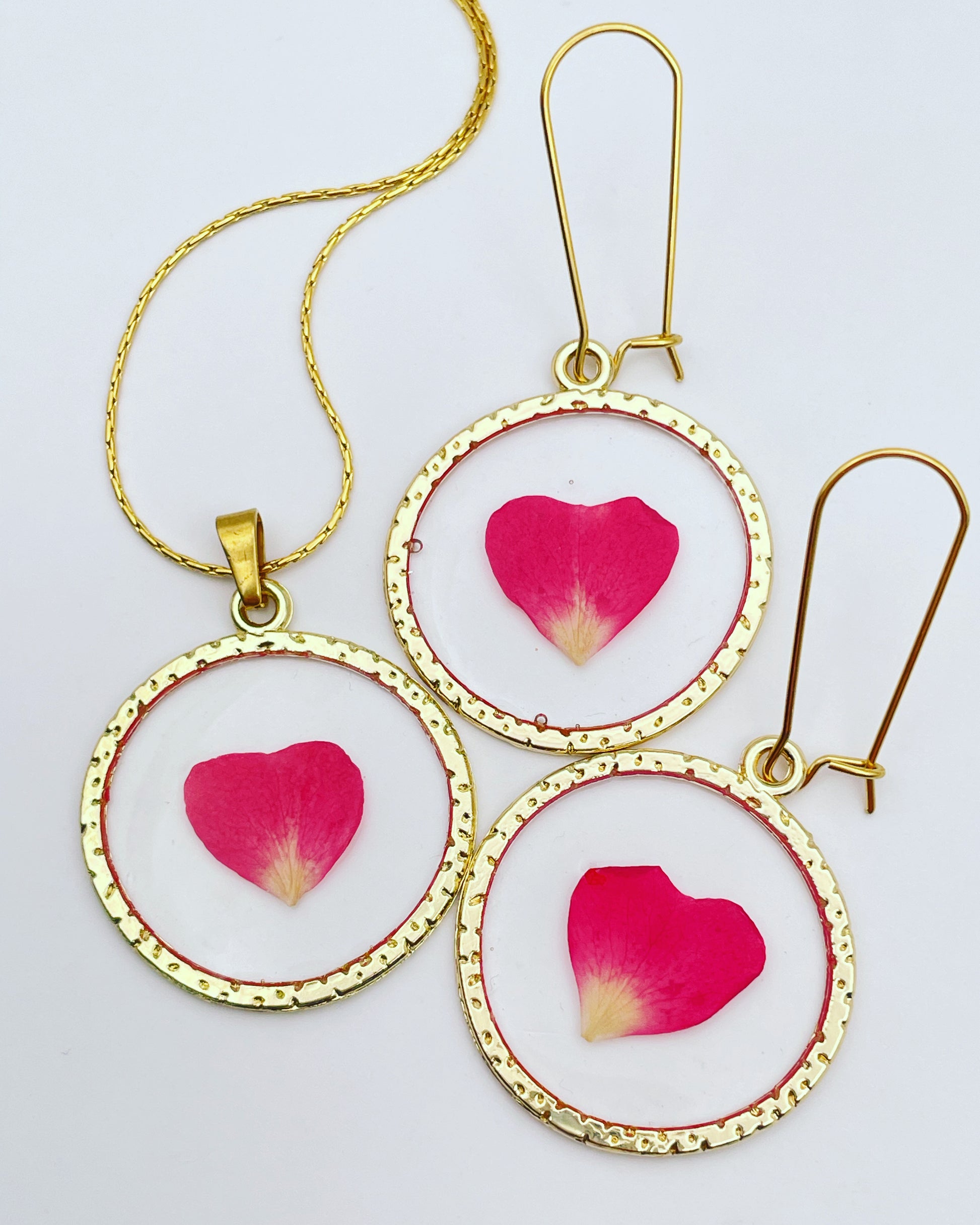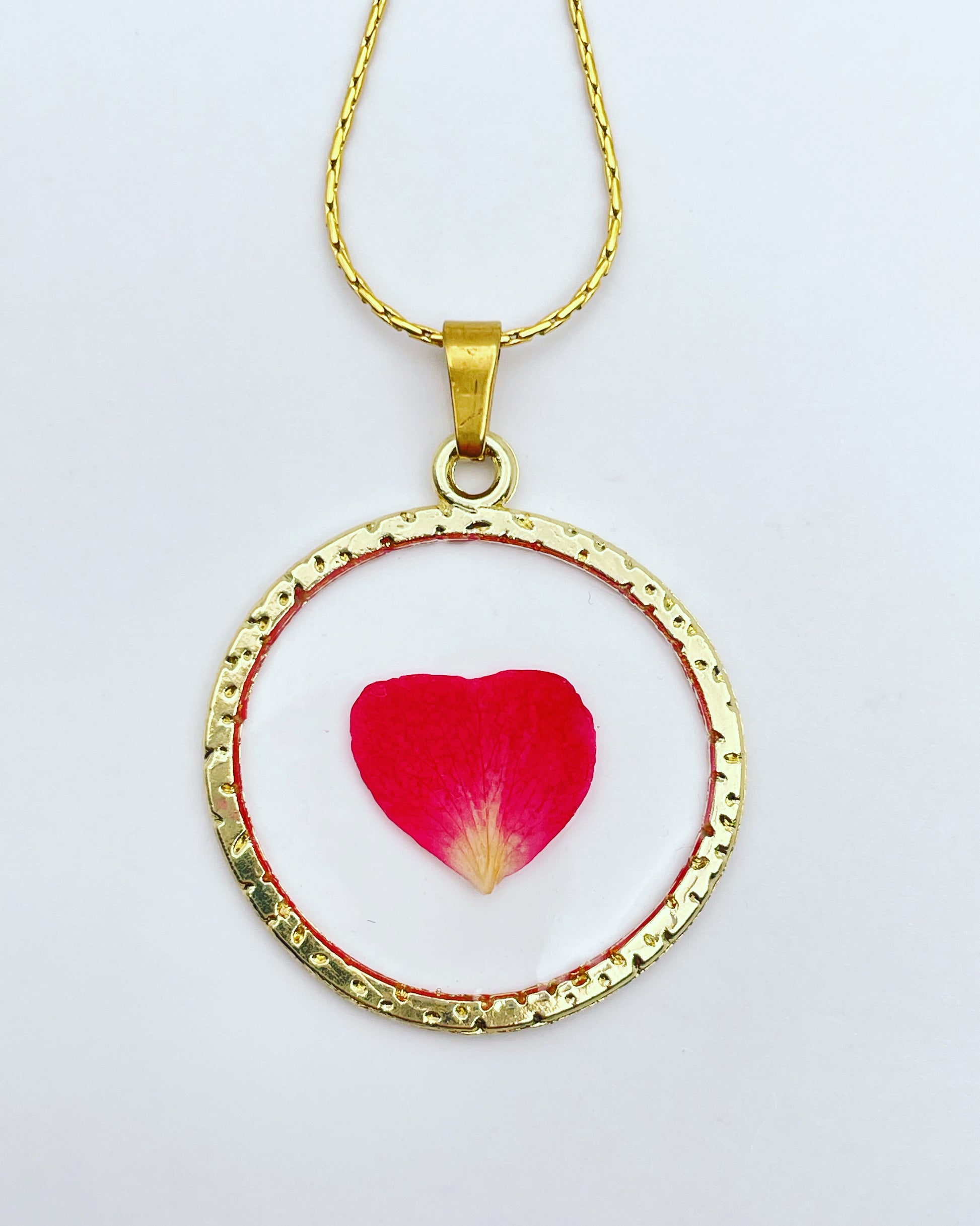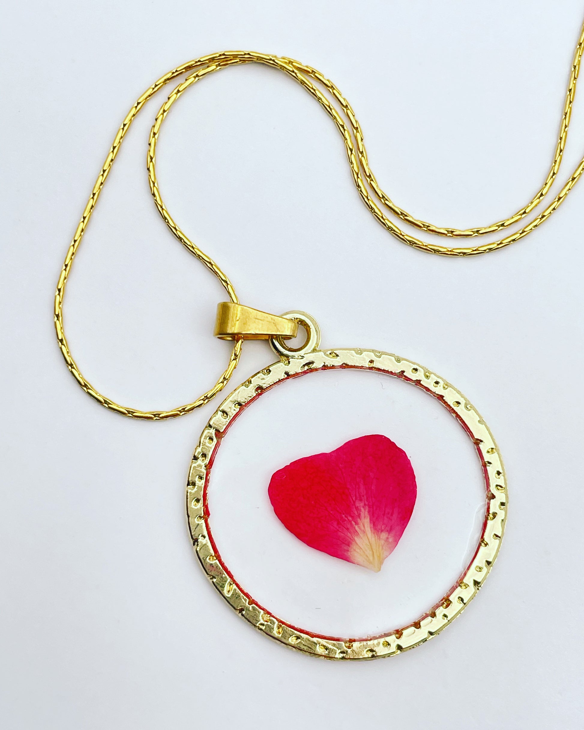 This beautiful statement pendant necklace is handmade with real rose flowers in resin. Most of the flowers are collected during my walks and pressed/dyed at my workshop in London, UK. Each piece is carefully handcrafted by me.