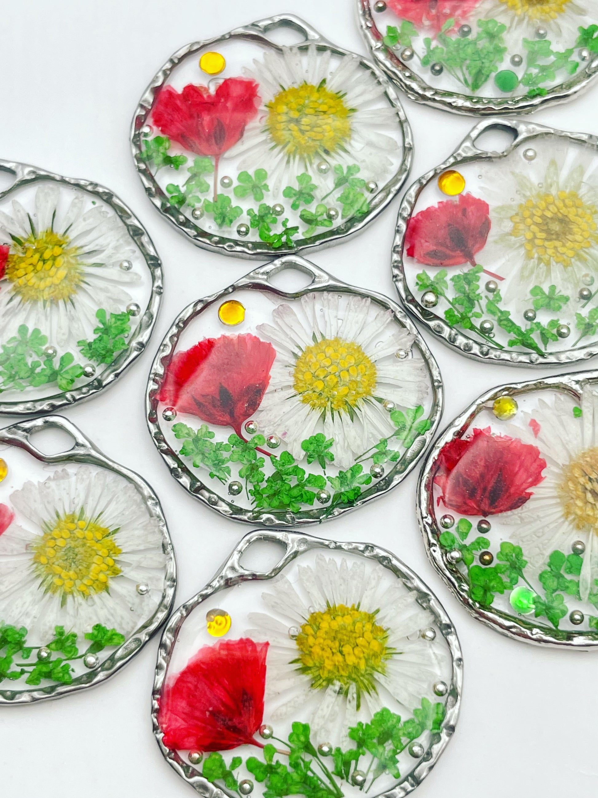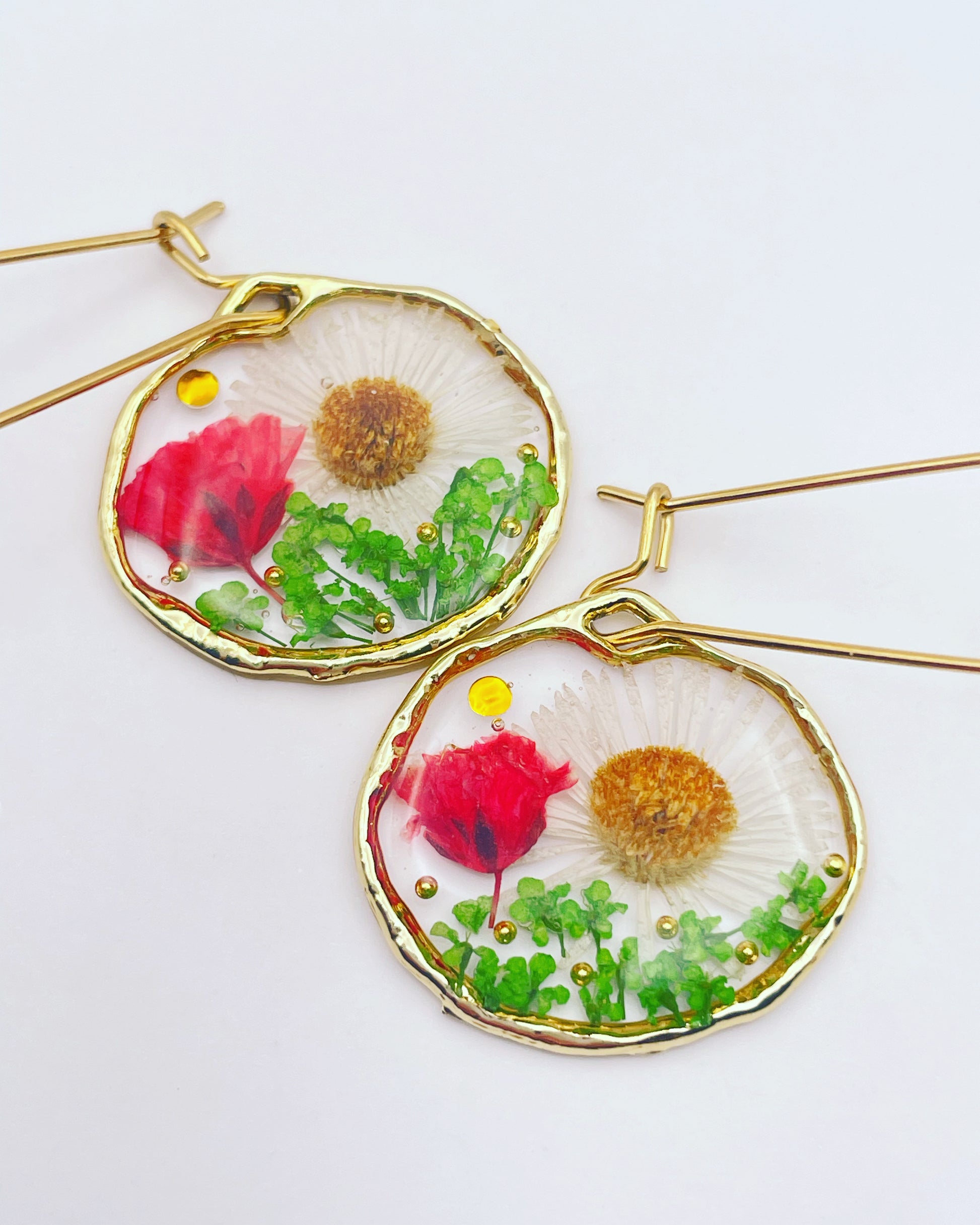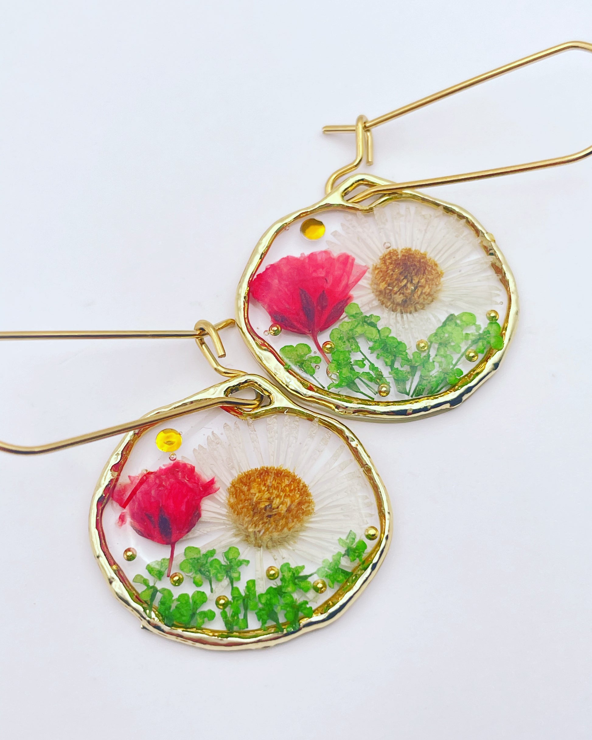 These beautiful statement dangle earrings are handmade with real flowers, crystals and gold beads in resin. Most of the flowers are collected during my walks and pressed/dyed at my workshop in London UK. Each piece is carefully handcrafted by me.
