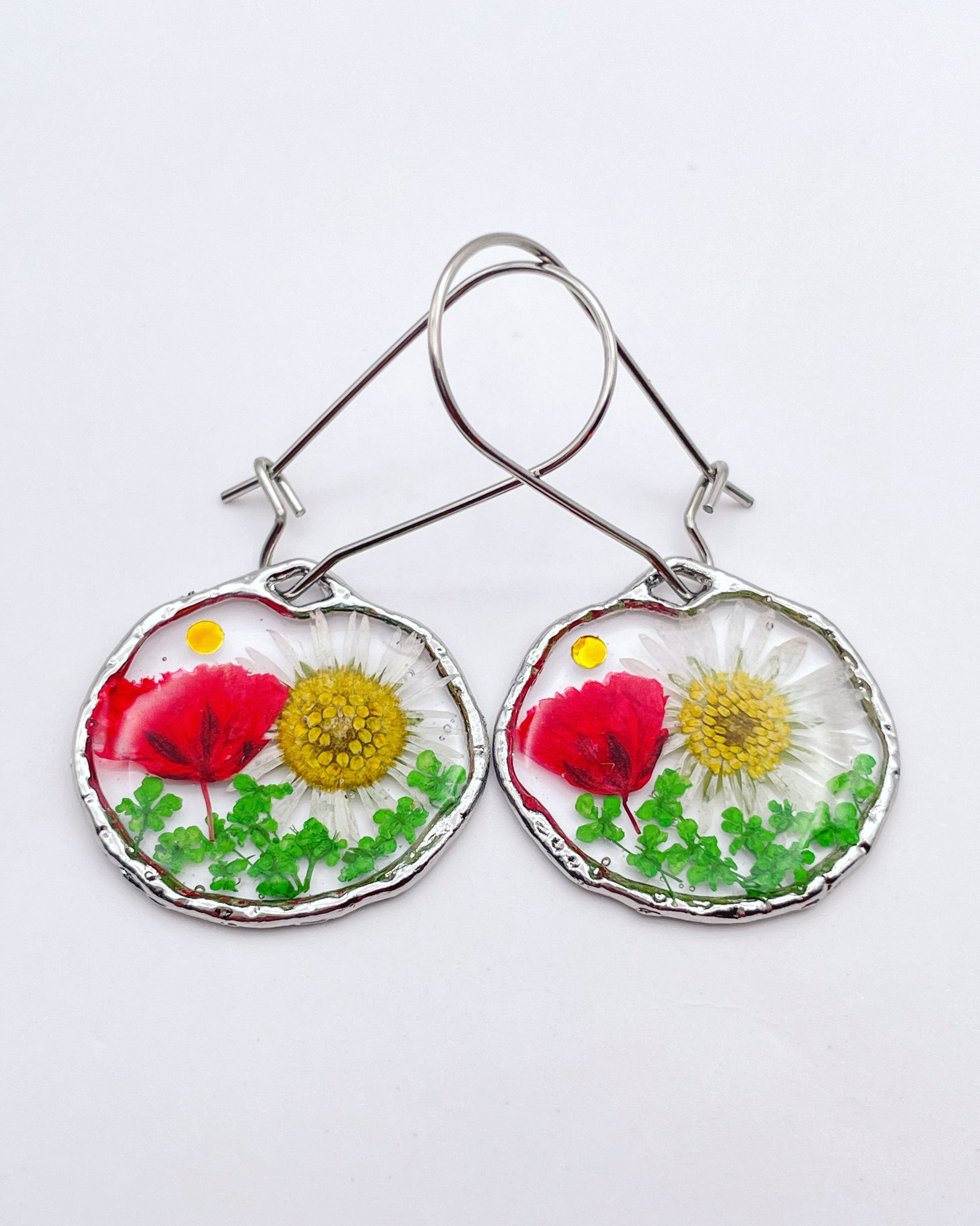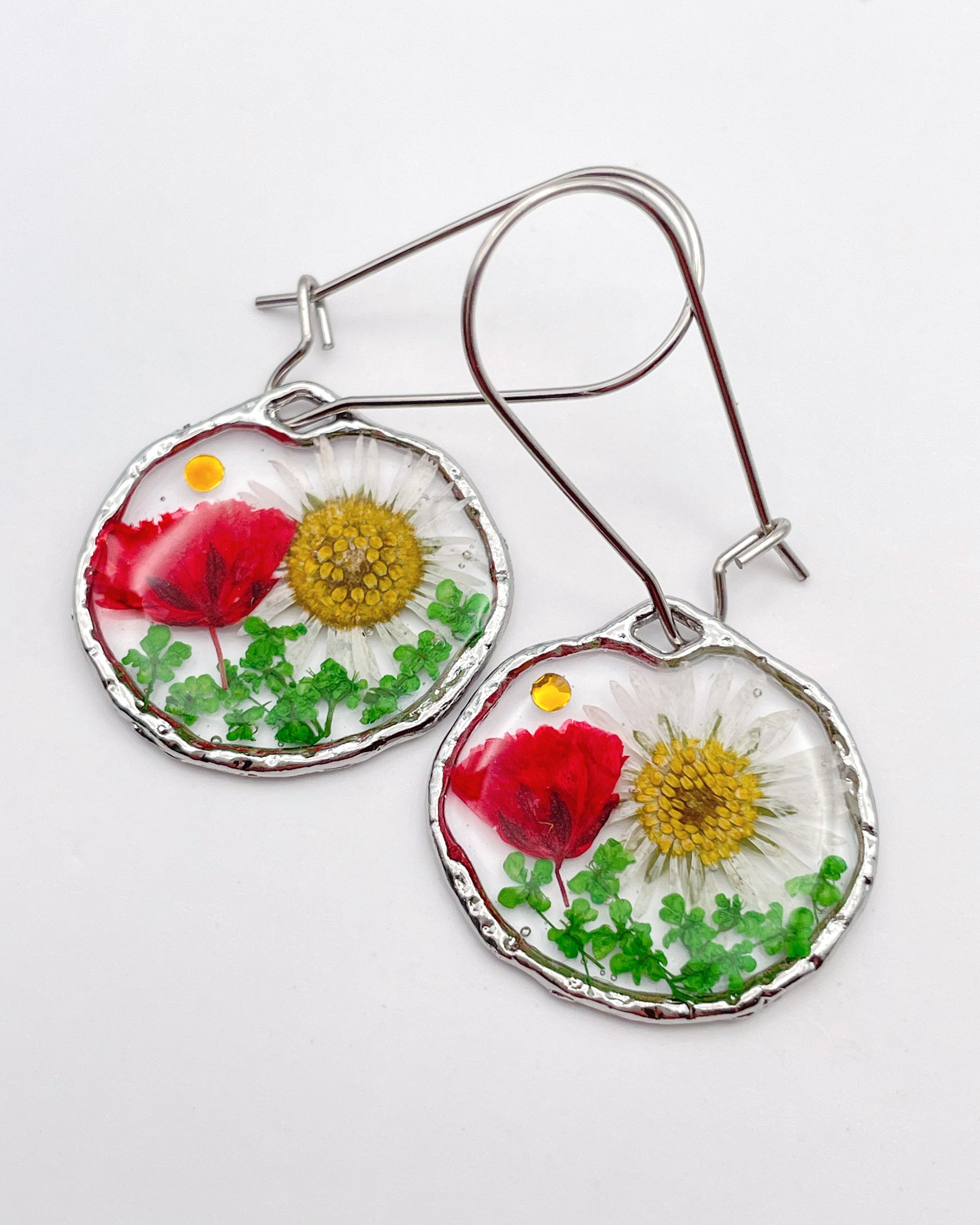 Dangle earrings with poppies and Daisies in gold or silver