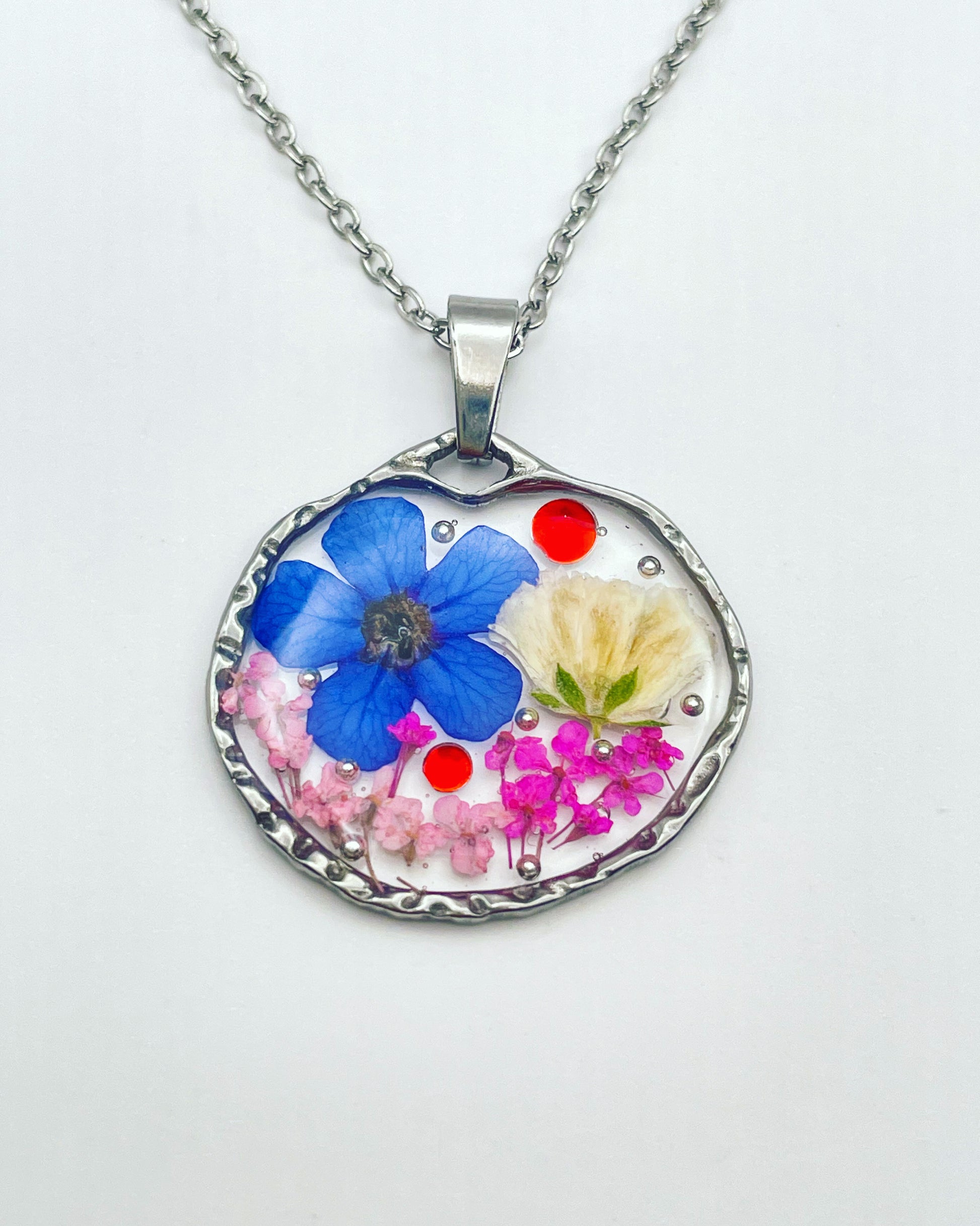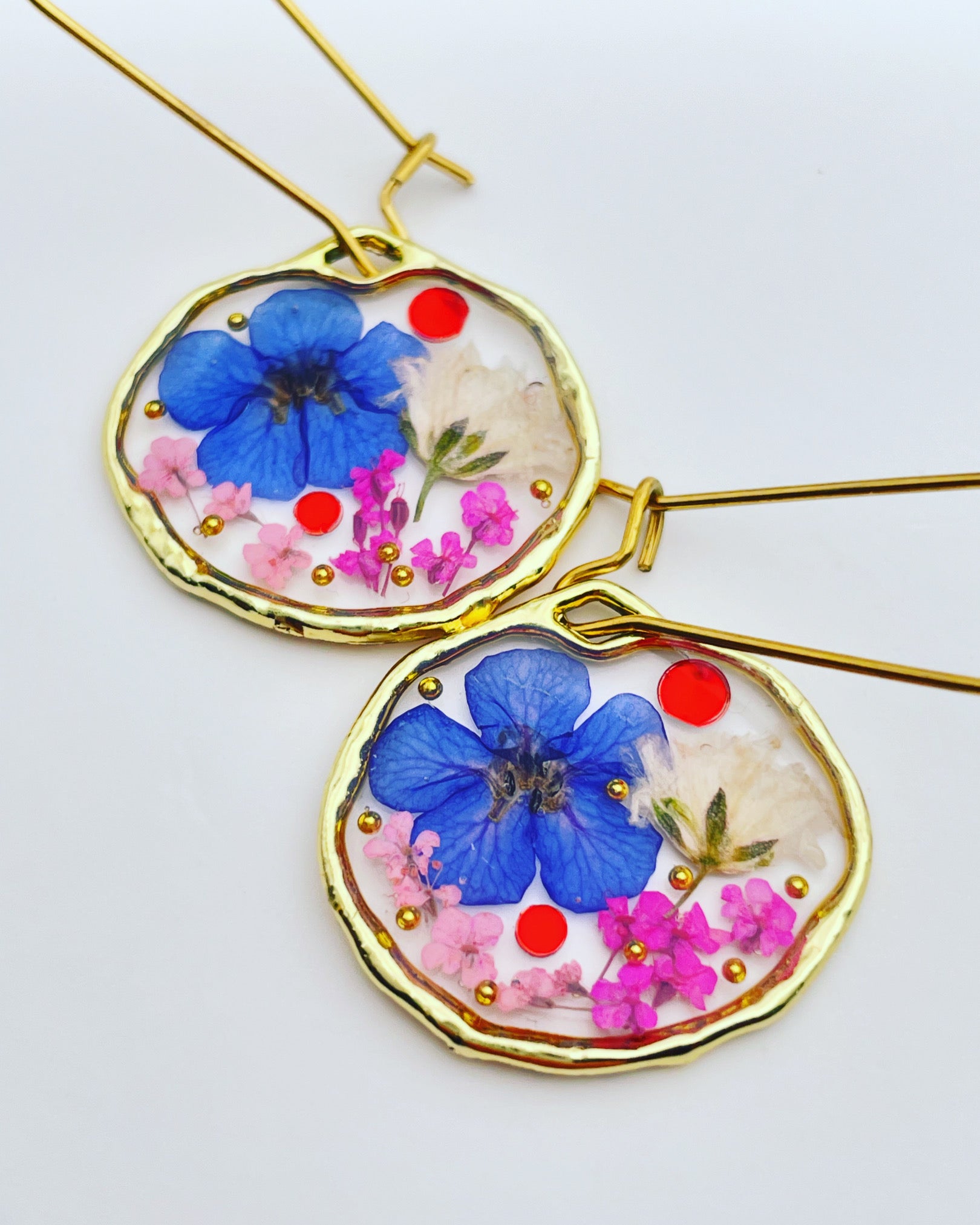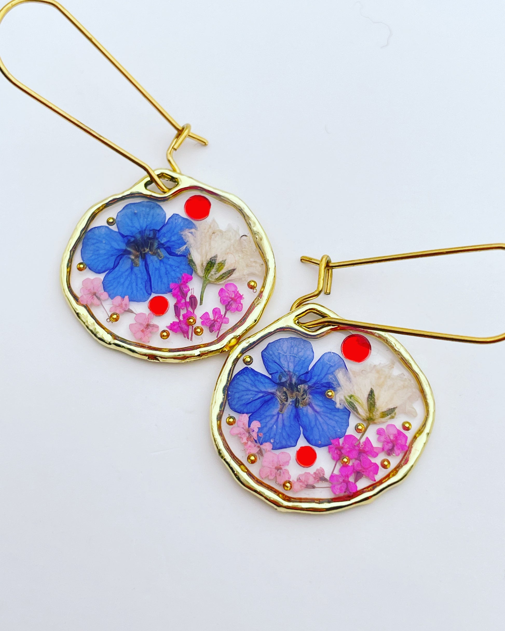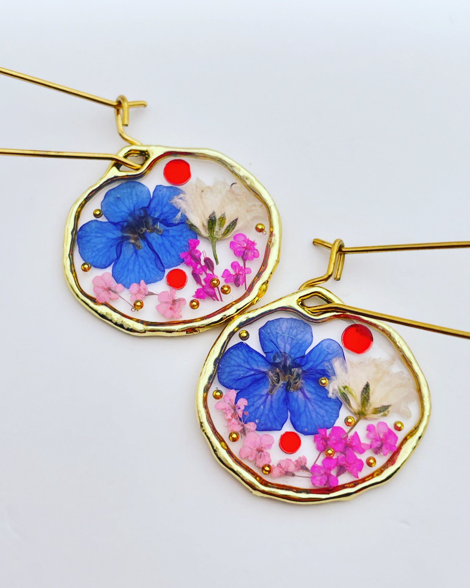 These beautiful statement dangle earrings are handmade with real flowers, crystals and gold beads in resin. Most of the flowers are collected during my walks and pressed/dyed at my workshop in London UK. Each piece is carefully handcrafted by me.