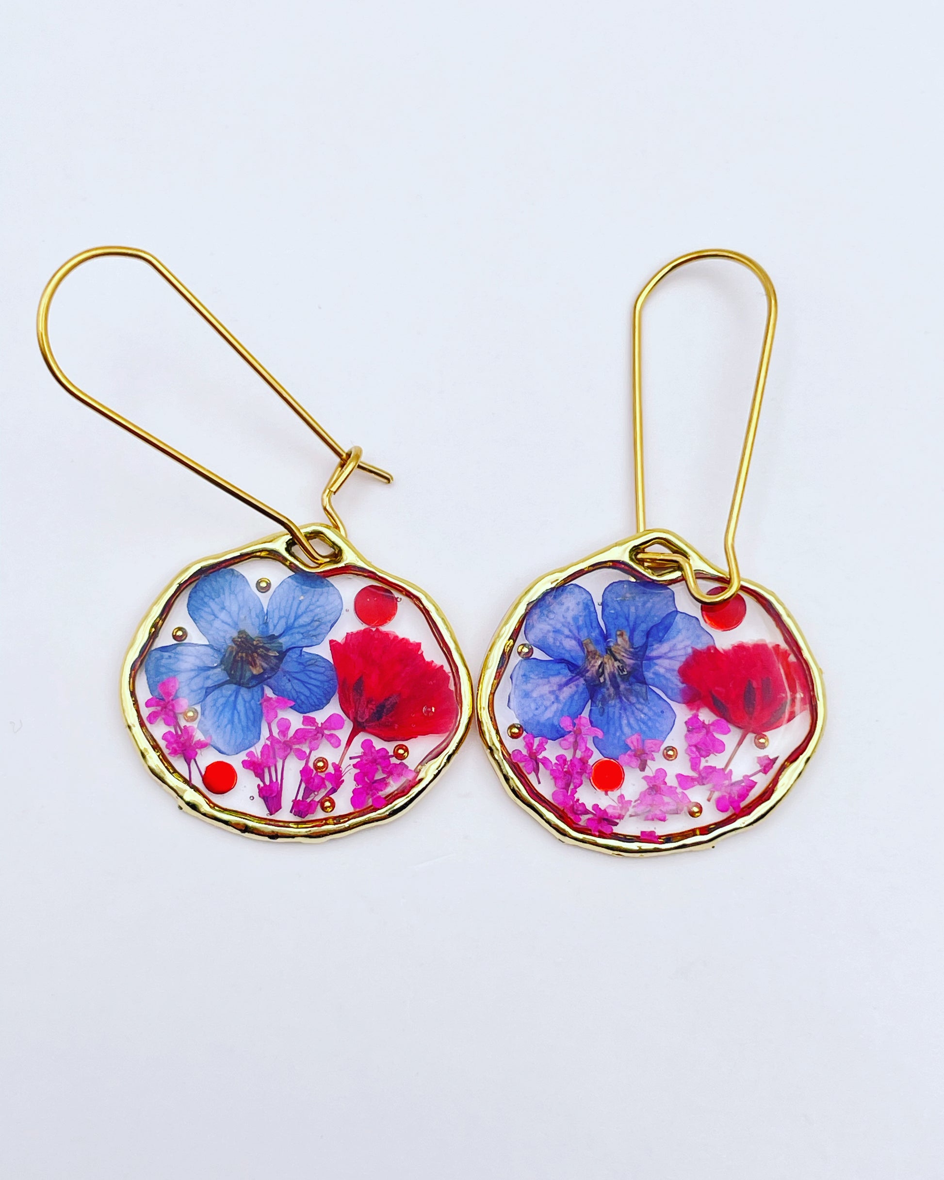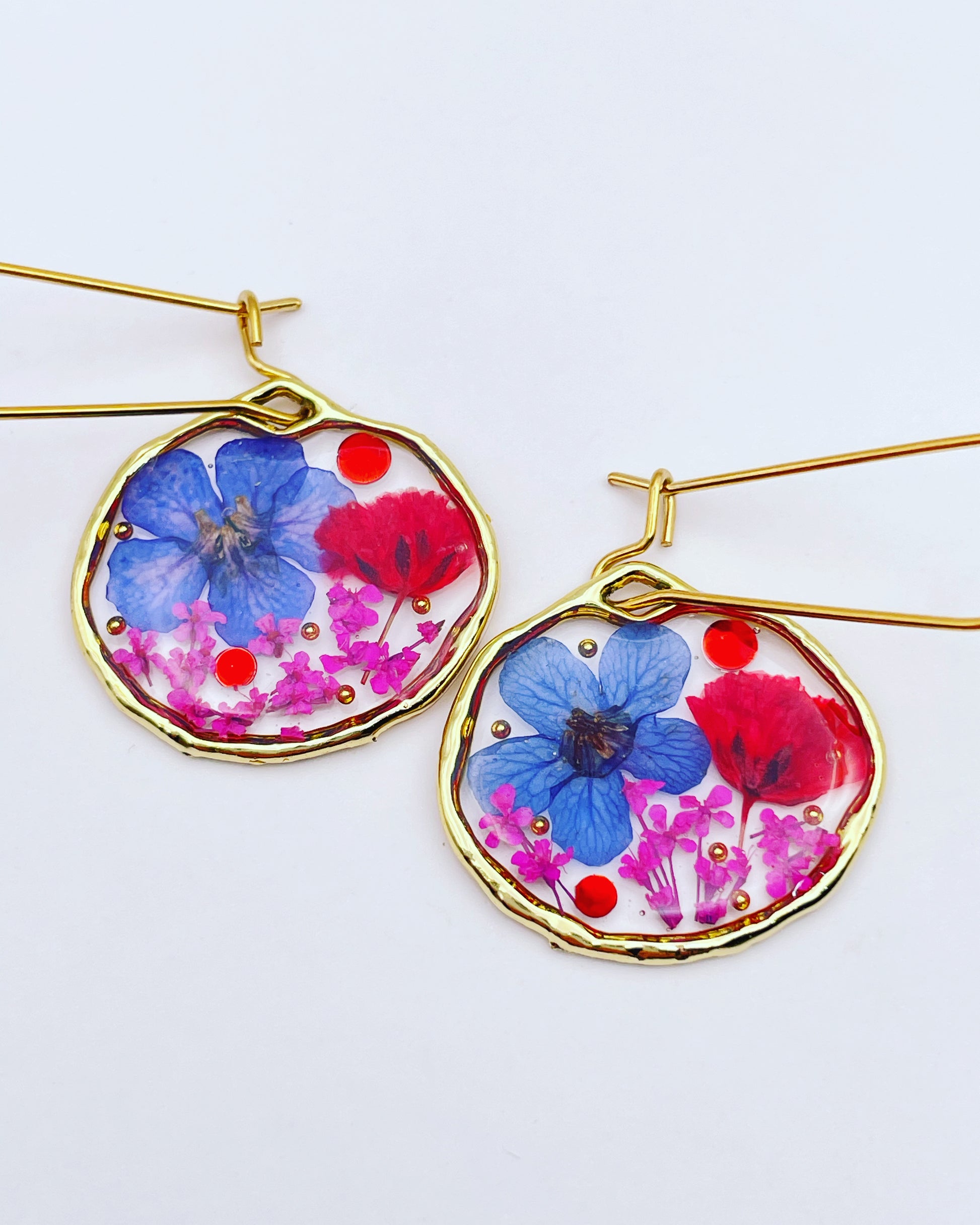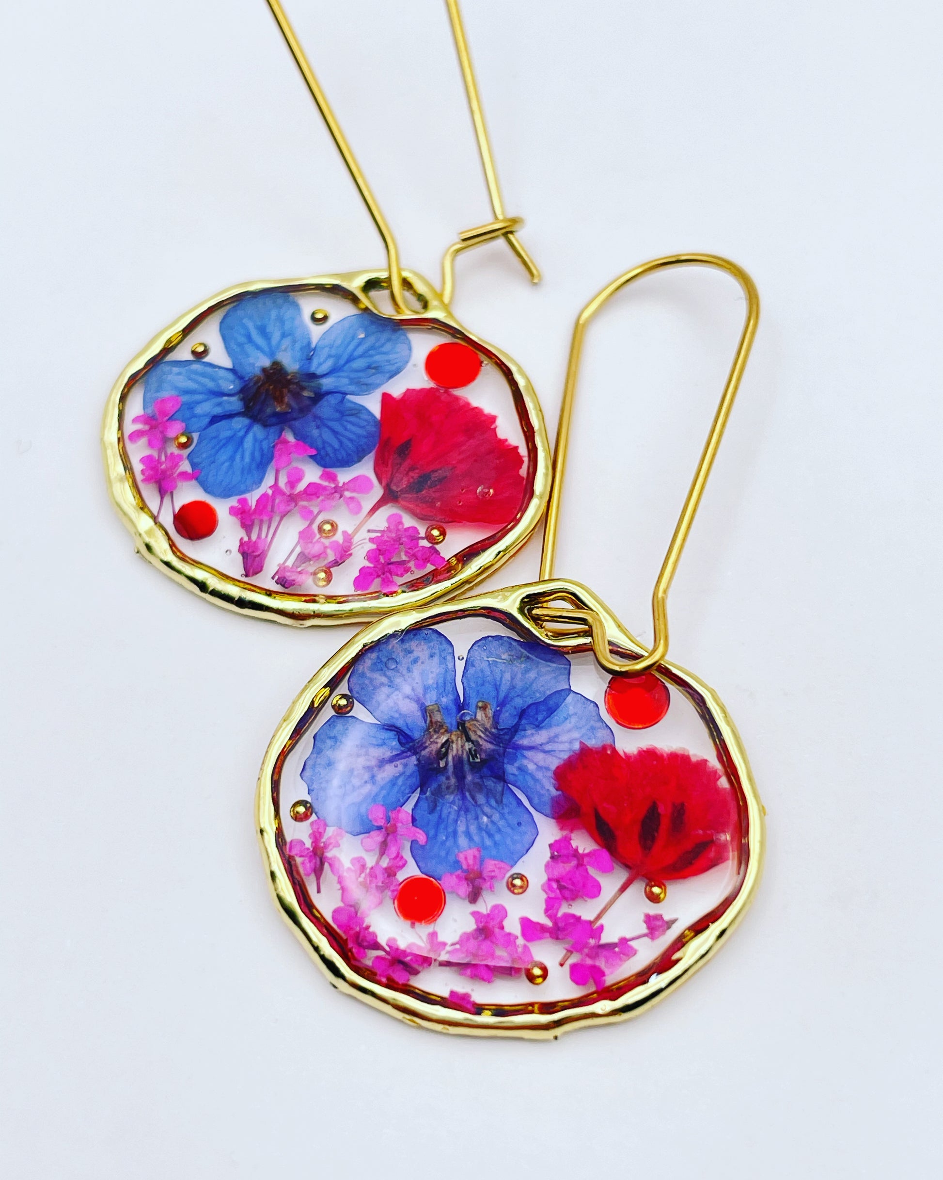 These beautiful statement dangle earrings are handmade with real flowers, crystals and gold beads in resin. Most of the flowers are collected during my walks and pressed/dyed at my workshop in London UK. Each piece is carefully handcrafted by me.