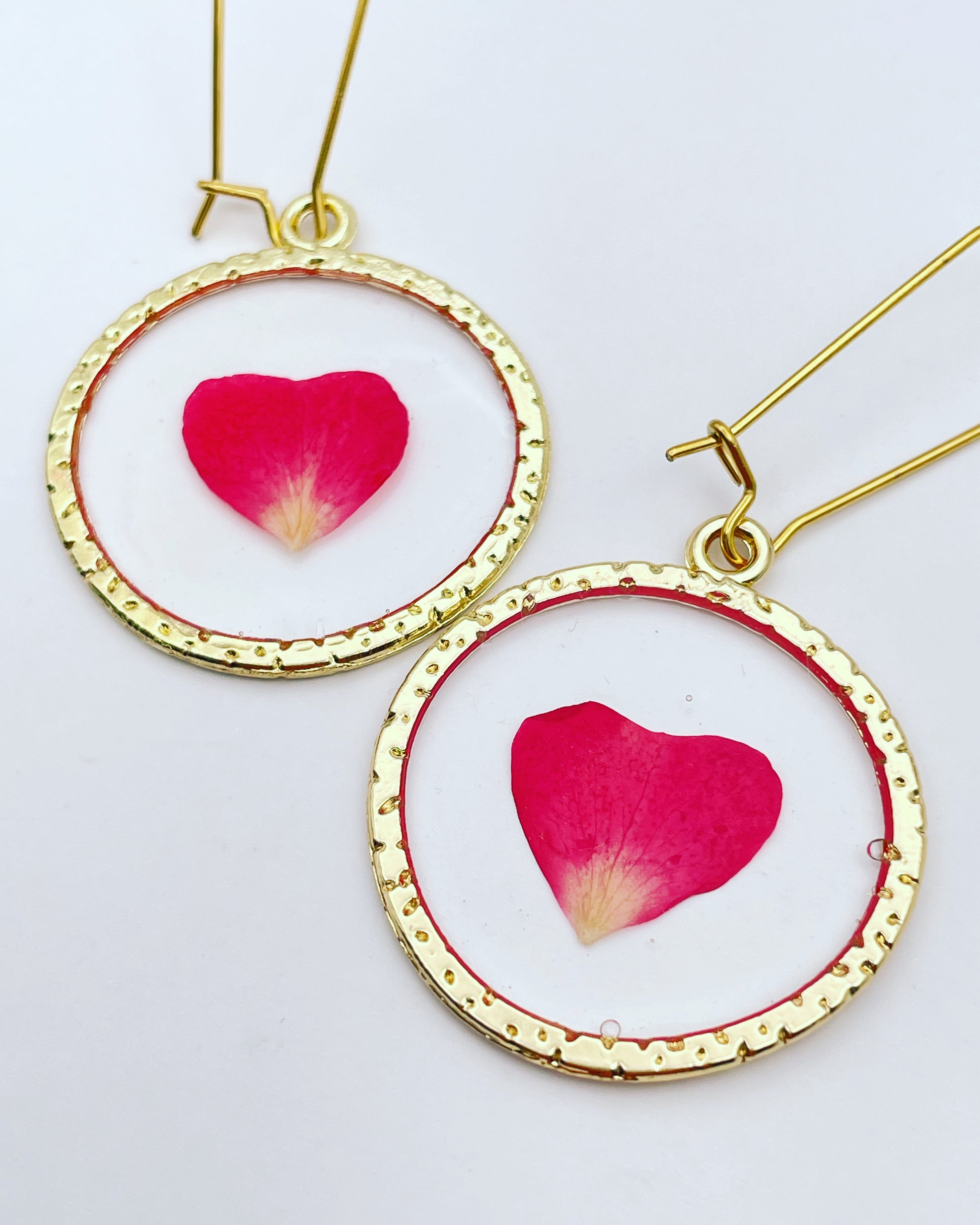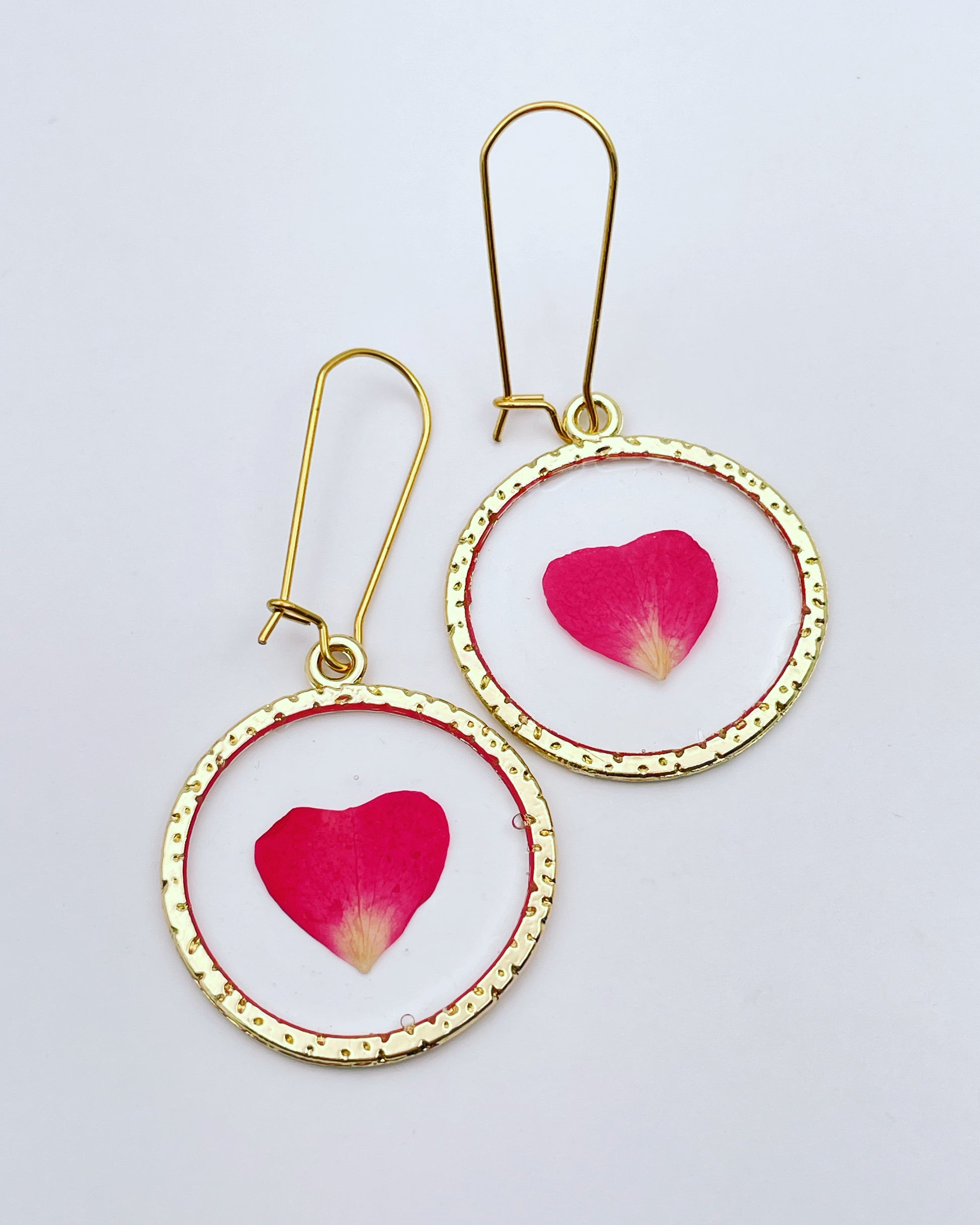 Gold dangle earrings with real red rose petal