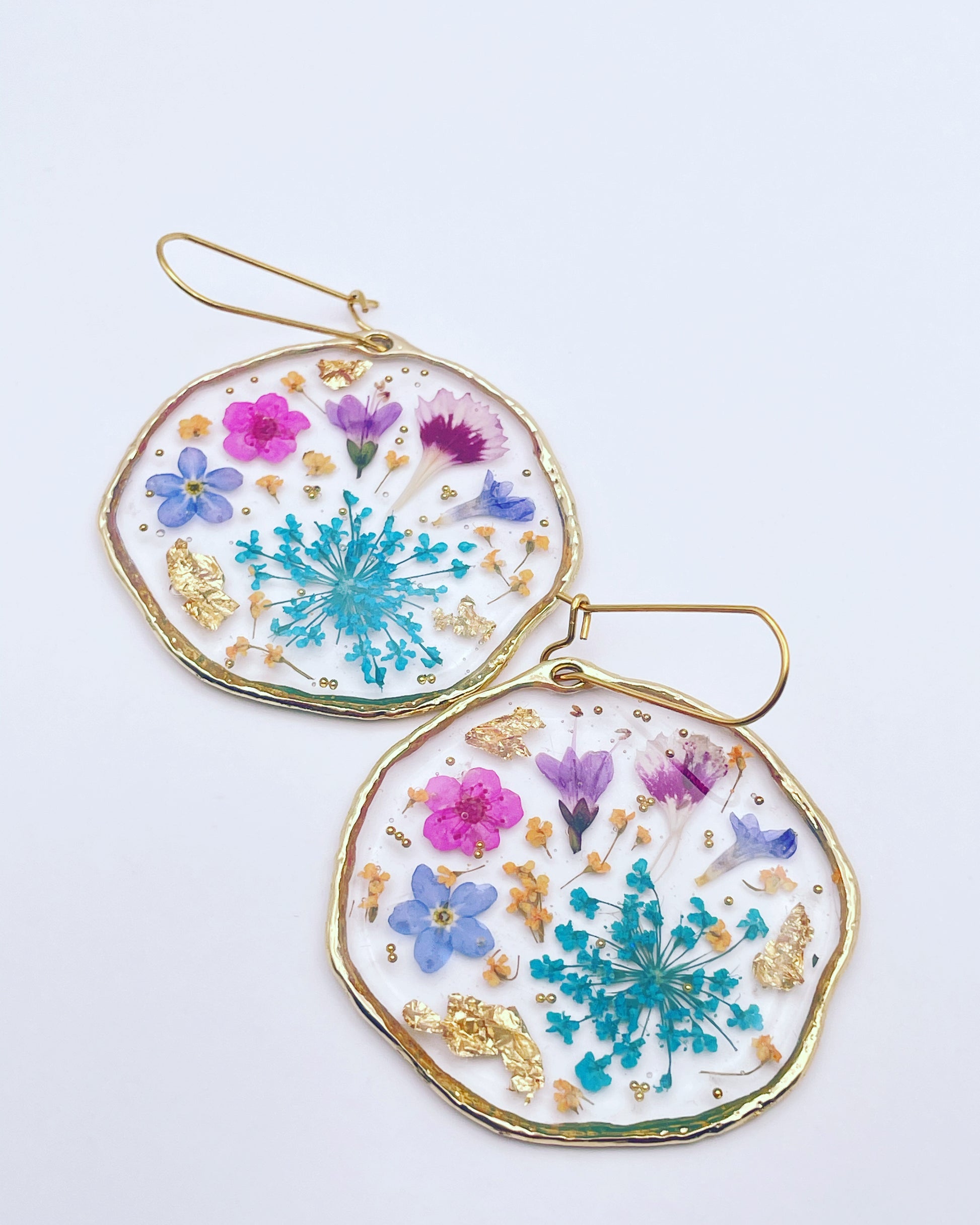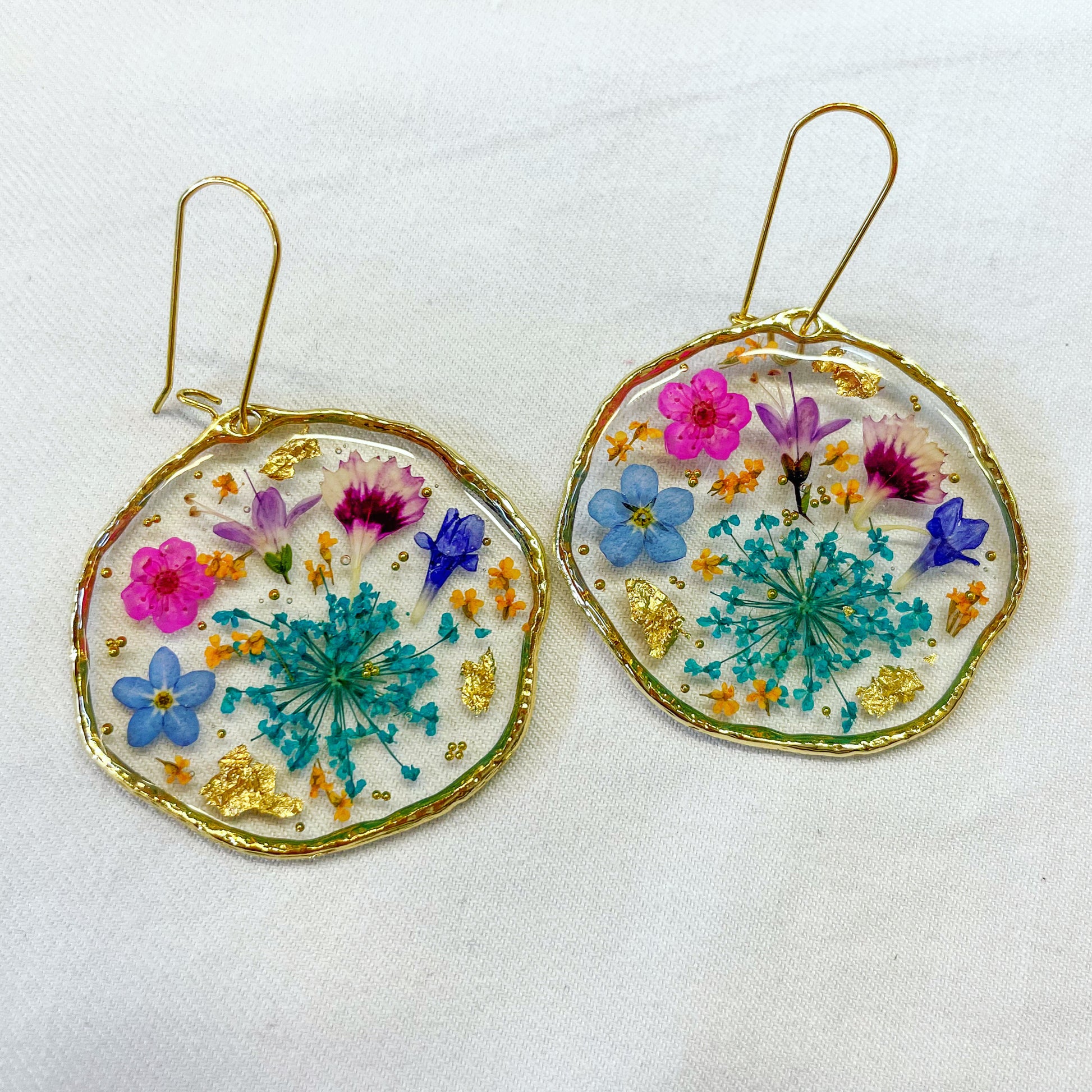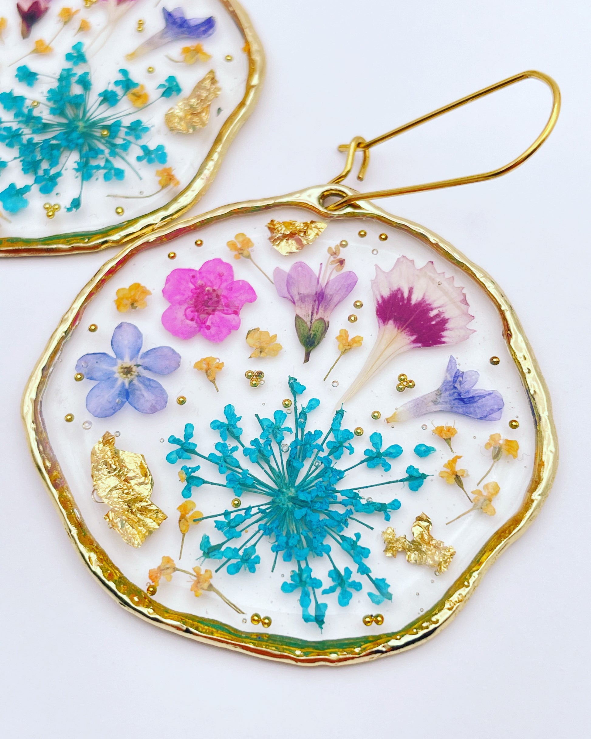These beautiful statement dangle earrings are handmade with real flowers, crystals and gold beads in resin. Most of the flowers are collected during my walks and pressed/dyed at my workshop in London UK. Each piece is carefully handcrafted by me.