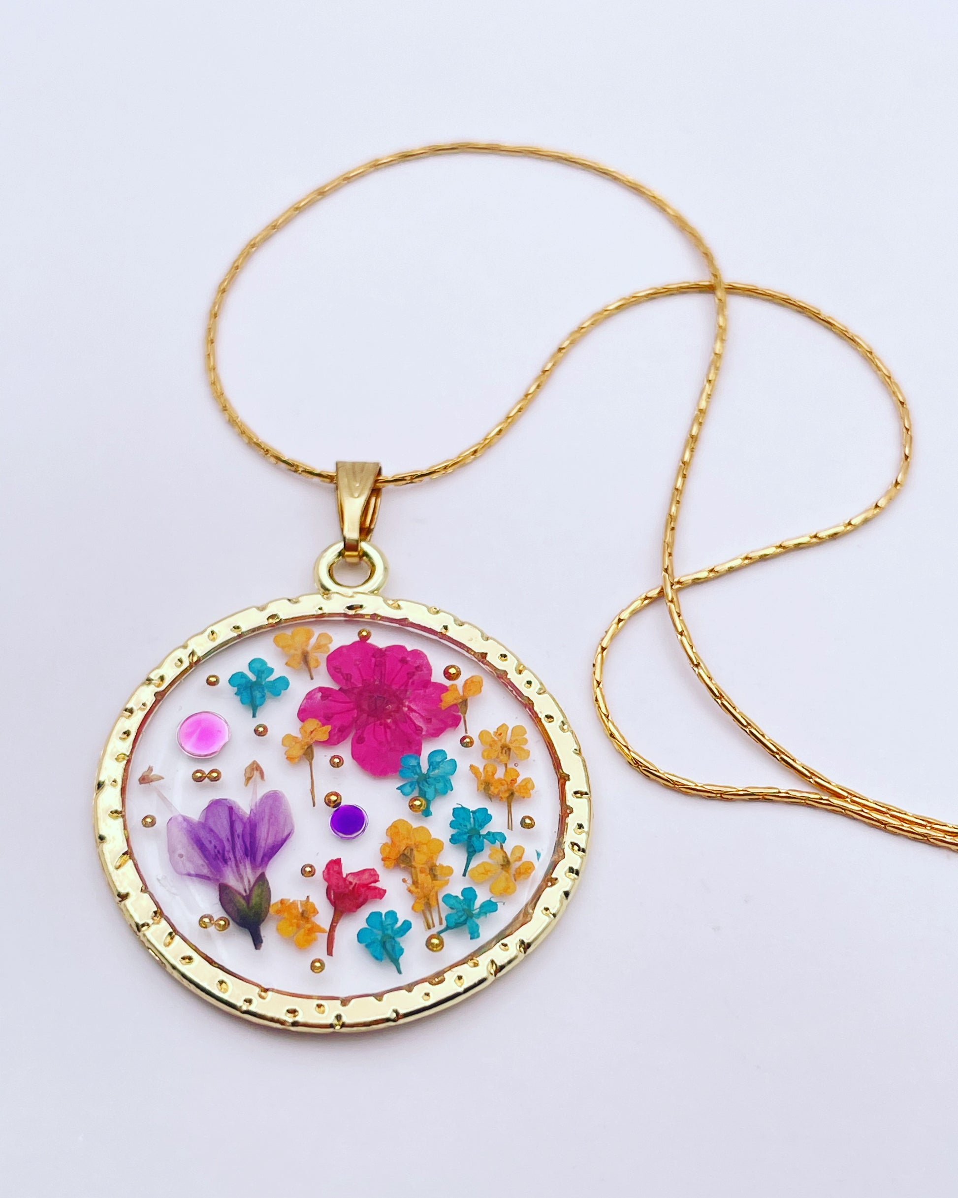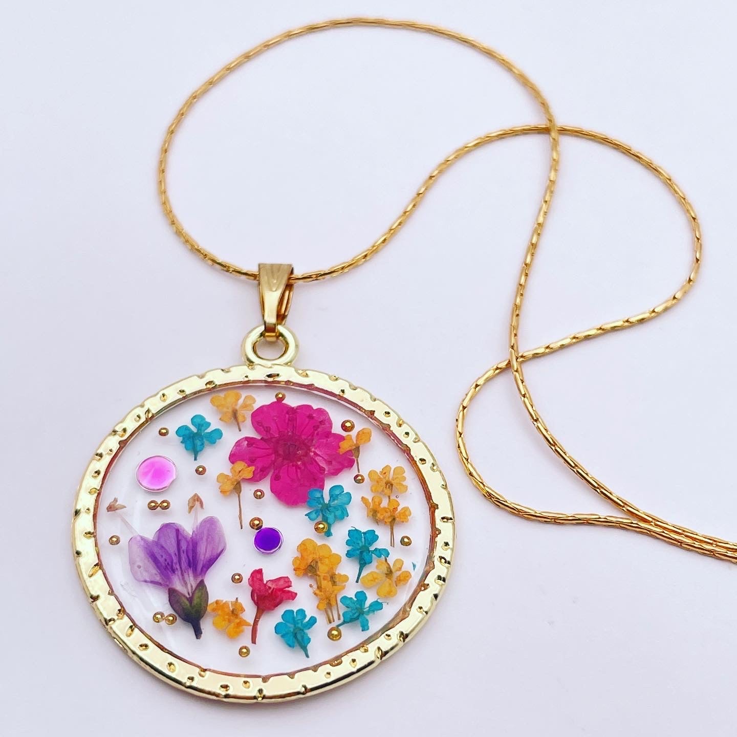 This beautiful statement pendant necklace is handmade with real flowers, crystals and gold beads in resin. Most of the flowers are collected during my walks and pressed/dyed at my workshop in London, UK. Each piece is carefully handcrafted by me.