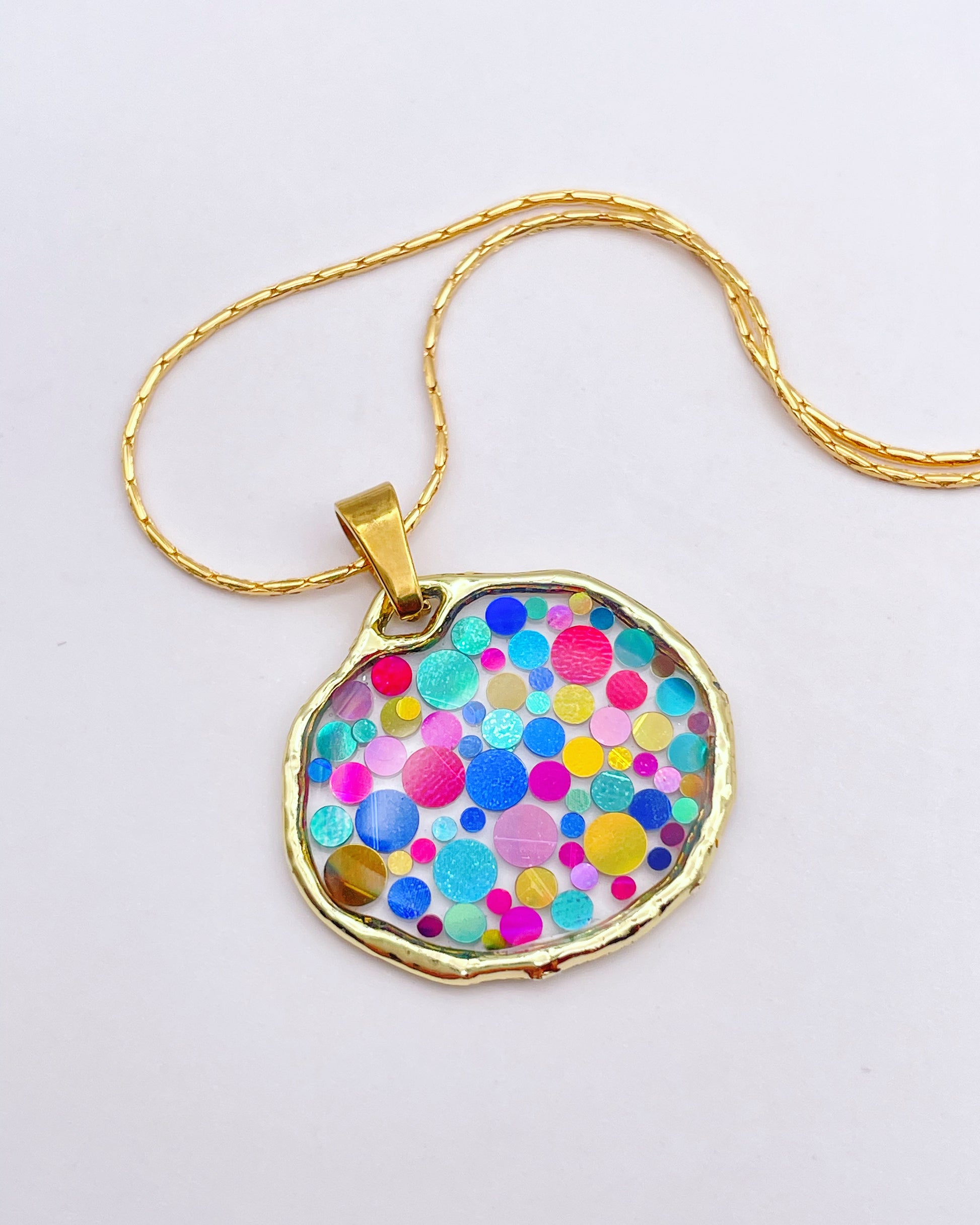 Sparkly pendant necklace handmade with tiny colourful sequins in resin. My inspiration for this collection is Disco balls! The tiny iridescent sequins change colour and shine in the light for a very refined and festive look. Each piece is lovingly handcrafted by me at my workshop in London UK.