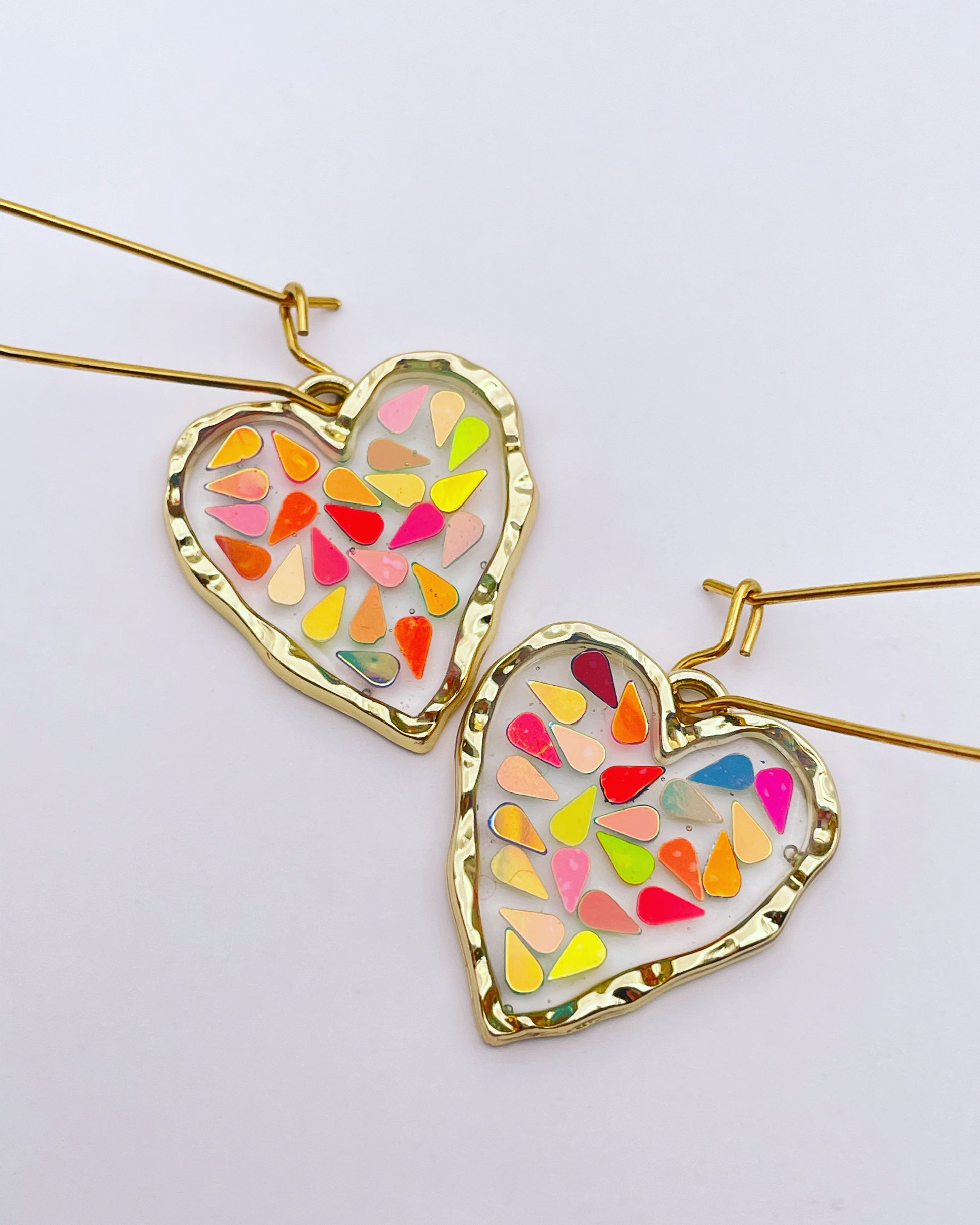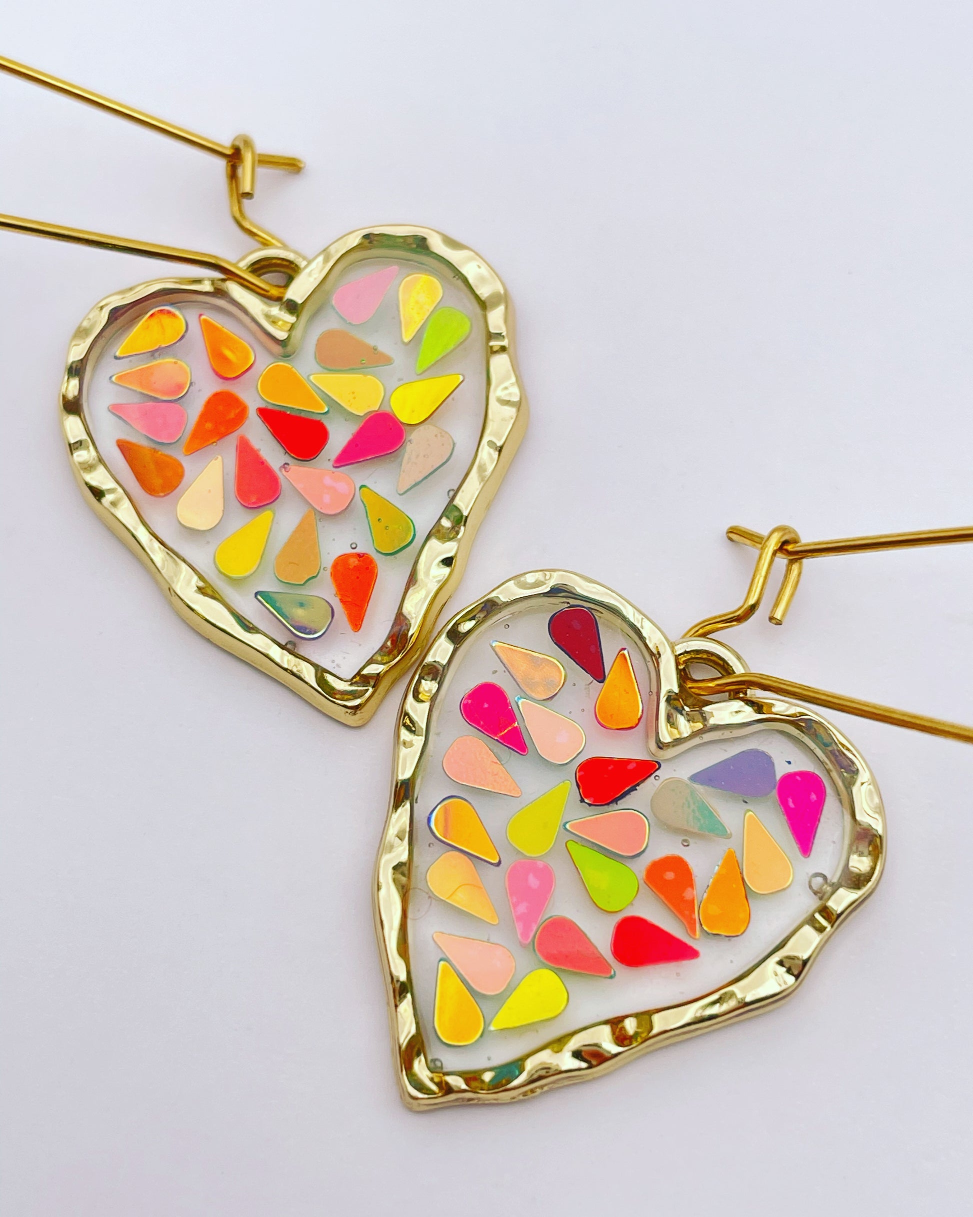 Sparkly disco dangle heart earrings handmade with tiny colourful sequins in resin. My inspiration for this collection is Disco balls! The tiny iridescent sequins change colour and shine in the light for a very refined and festive look. Each piece is lovingly handcrafted by me at my workshop in London UK.