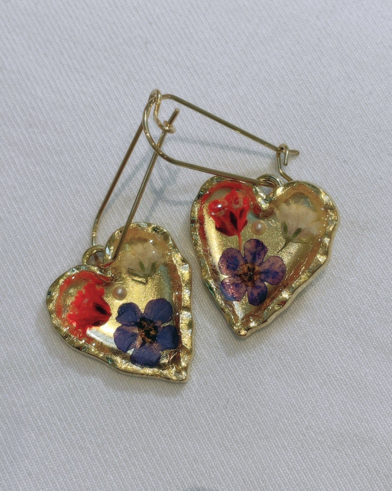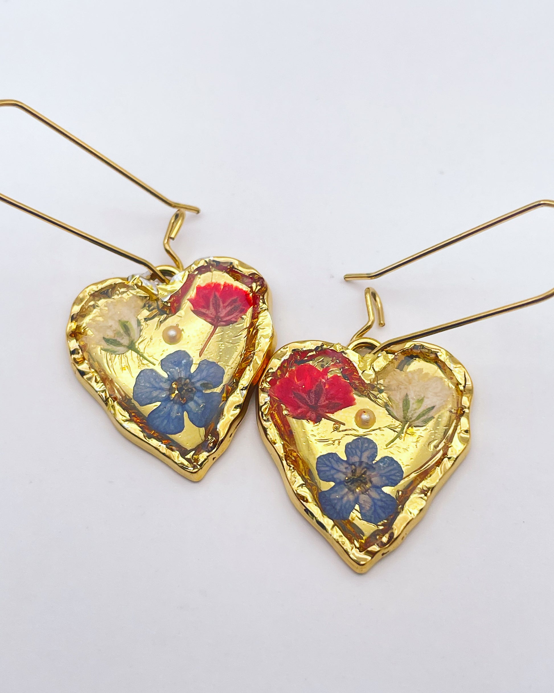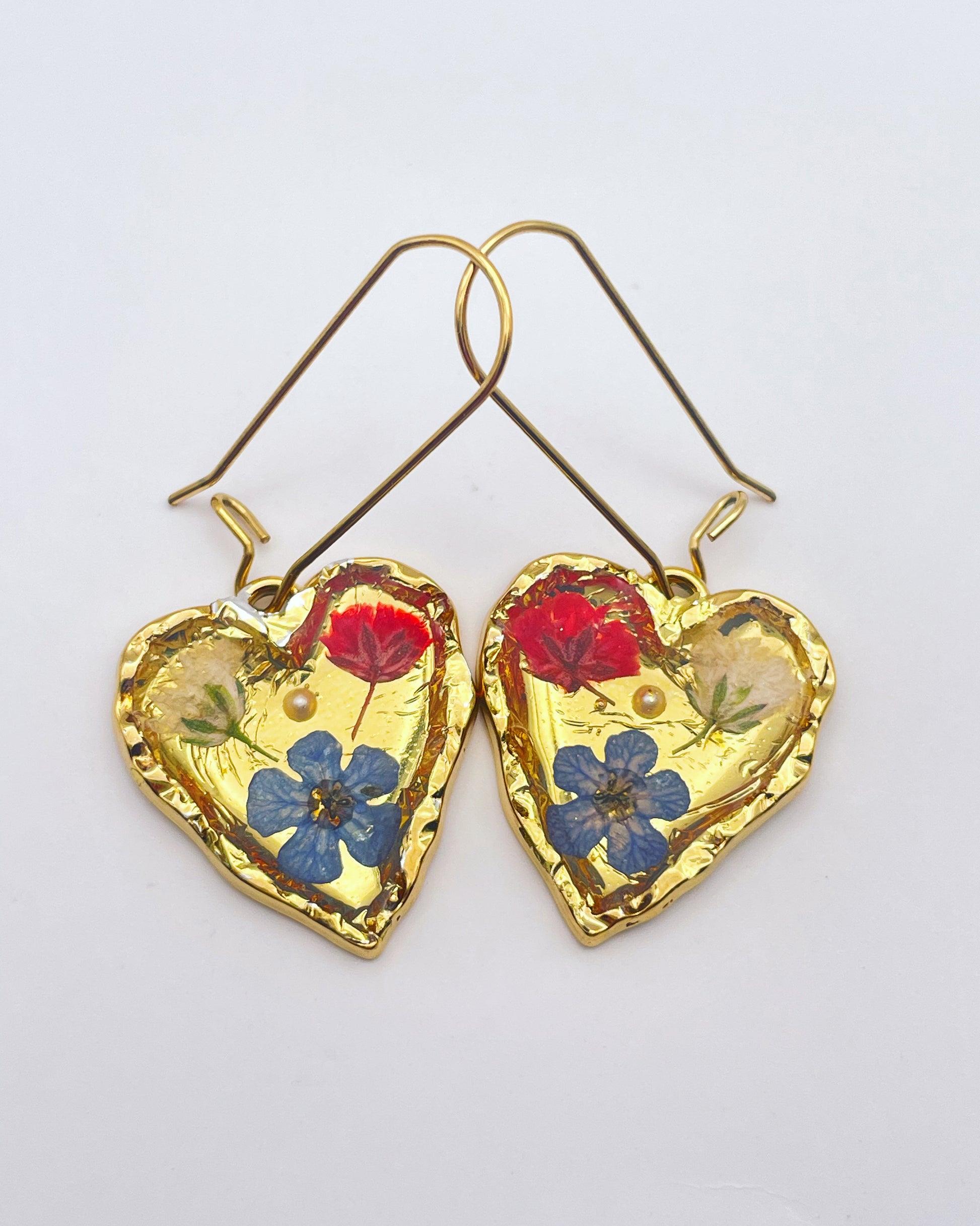 A beautiful pair of heart dangle earrings handmade with real flowers and crystals in resin with a shinny gold leaf background. Most of the flowers are collected during my walks and pressed/dyed at my workshop in London UK. My inspiration for this collection is gold leaf icons. A layer gold leaf applied by hand on the background, which gives the earrings a luxurious and shimmery look.