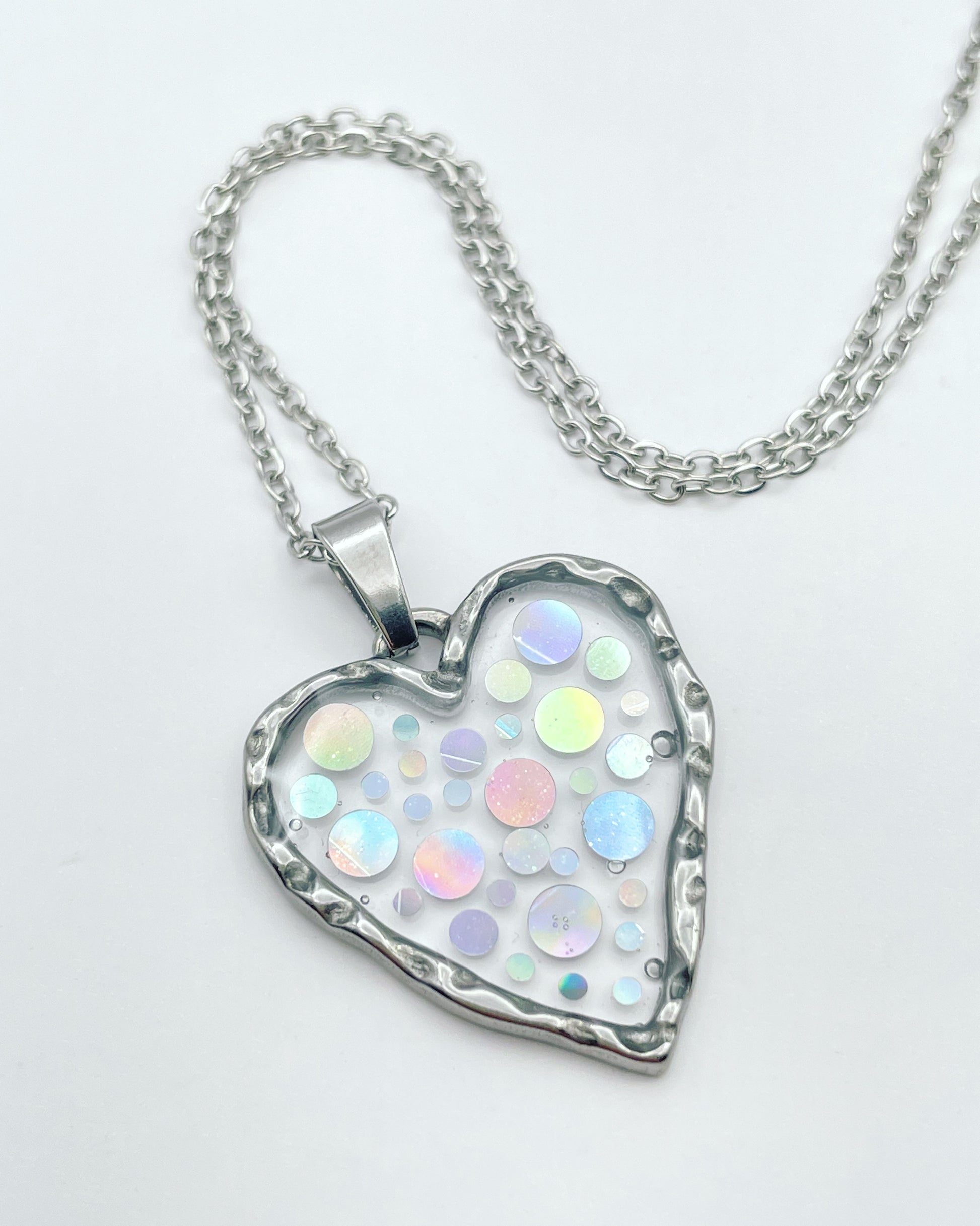 Sparkly disco heart pendant necklace handmade with tiny silver sequins in resin. My inspiration for this collection is Disco balls. The tiny iridescent sequins change colour and shine in the light for a very refined and festive look! Each piece is carefully handcrafted by me at my workshop in London UK.