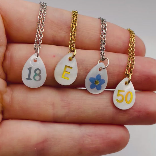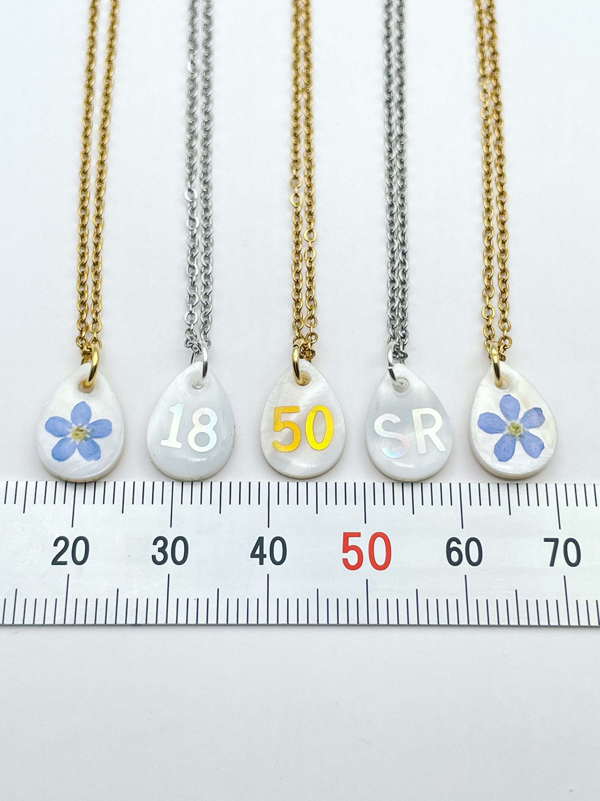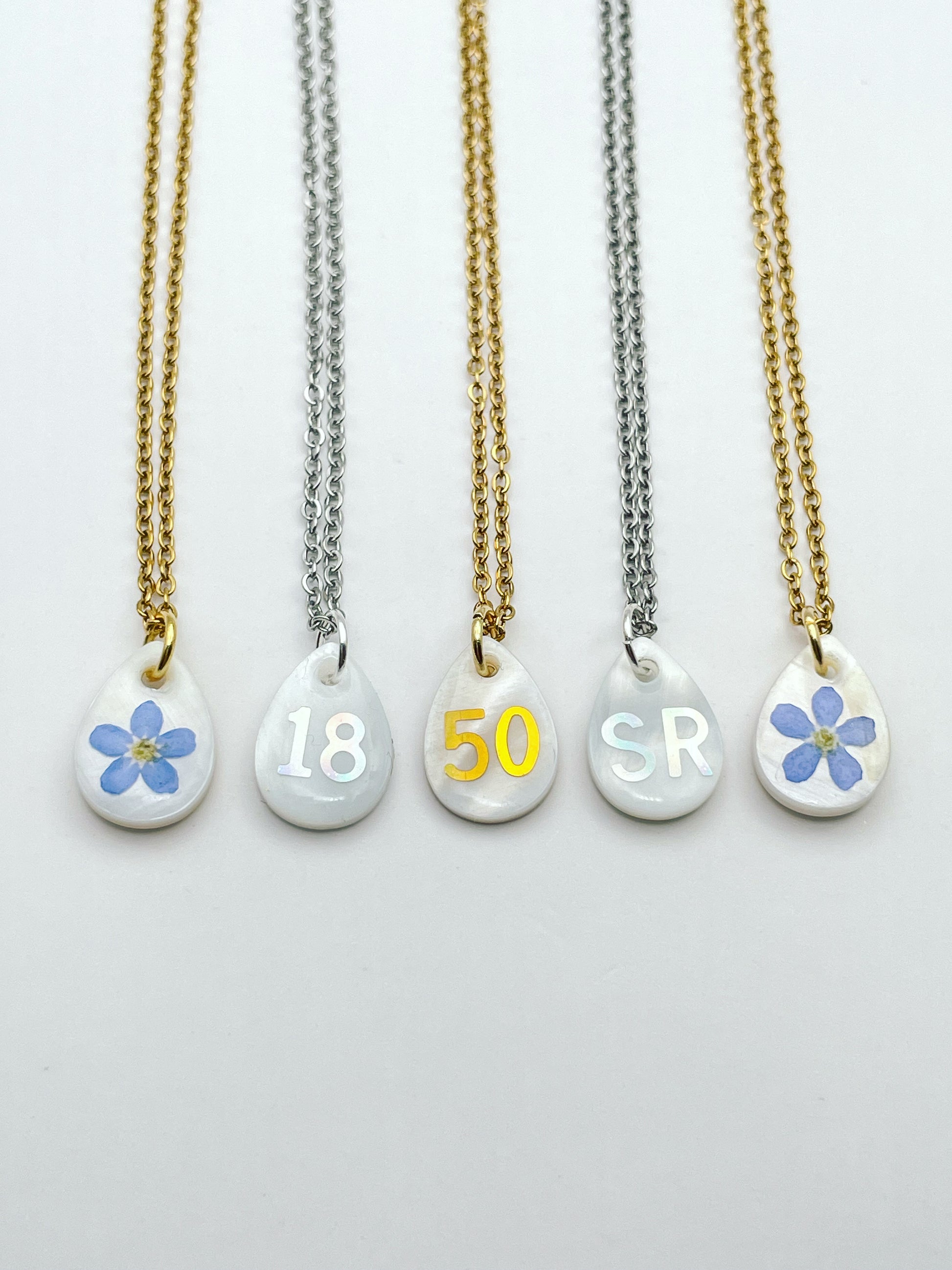 Personalised pendant necklace handmade with a real forget-me-not flower on one side and letters and/or numbers on the other side. The teardrop background is carved in real mother-of-pearl. I collect the forget-me-not flowers around London and press them at my workshop.