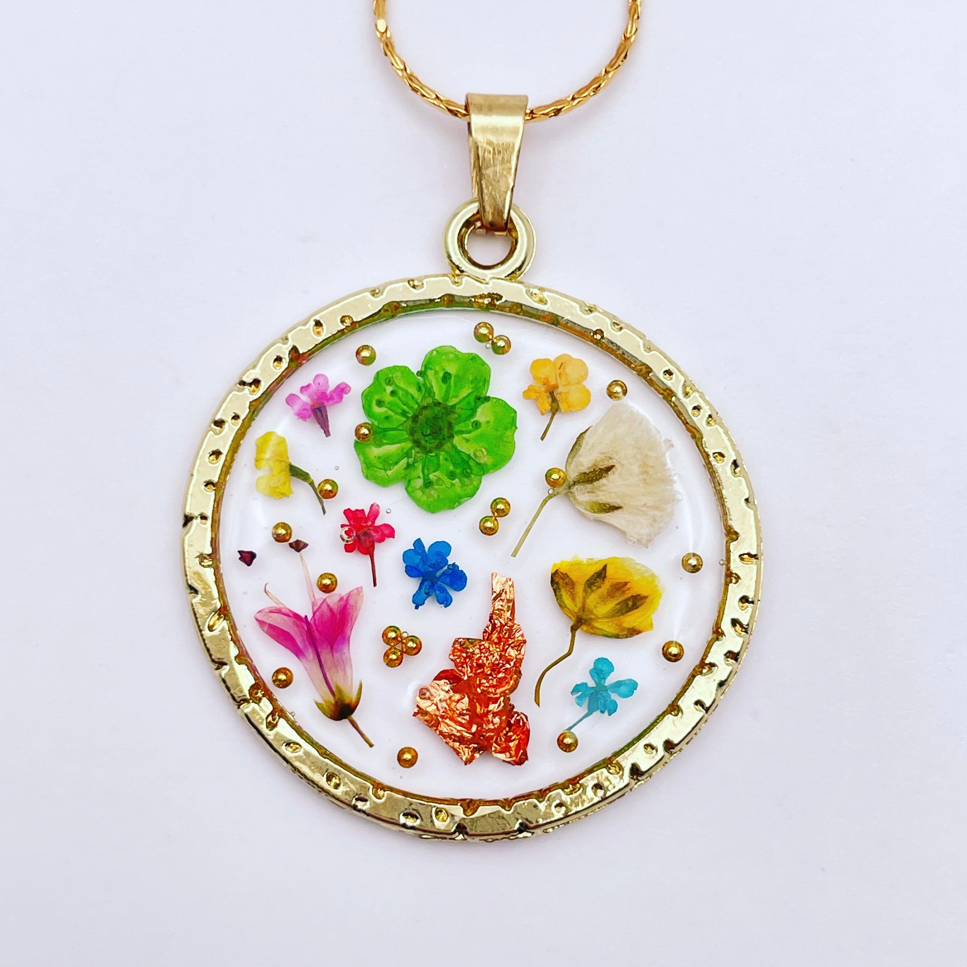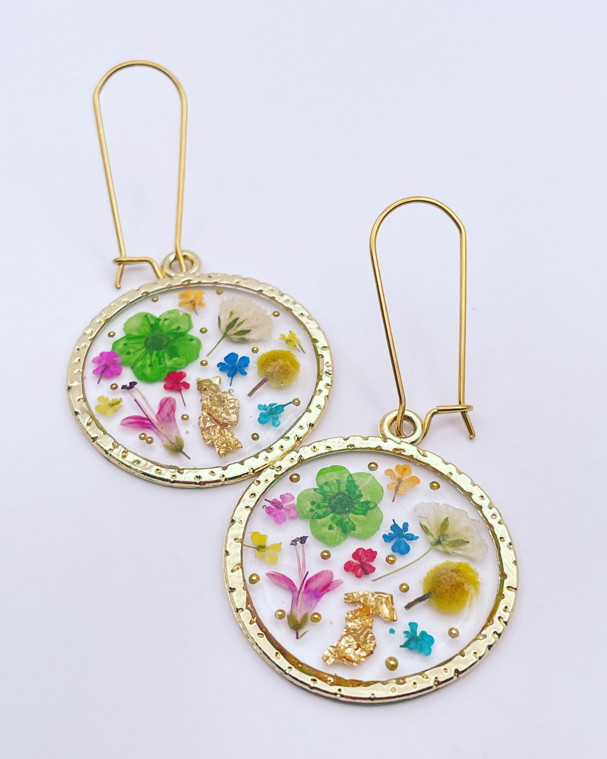 These beautiful statementdangle earrings are handmade with real flowers, crystals and gold beads in resin. Most of the flowers are collected during my walks and pressed/dyed at my workshop in London UK. Each piece is carefully handcrafted by me.
