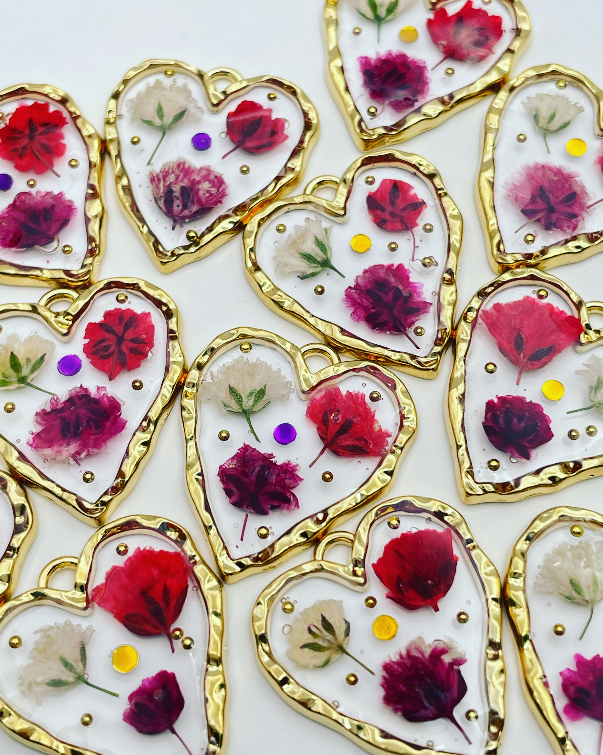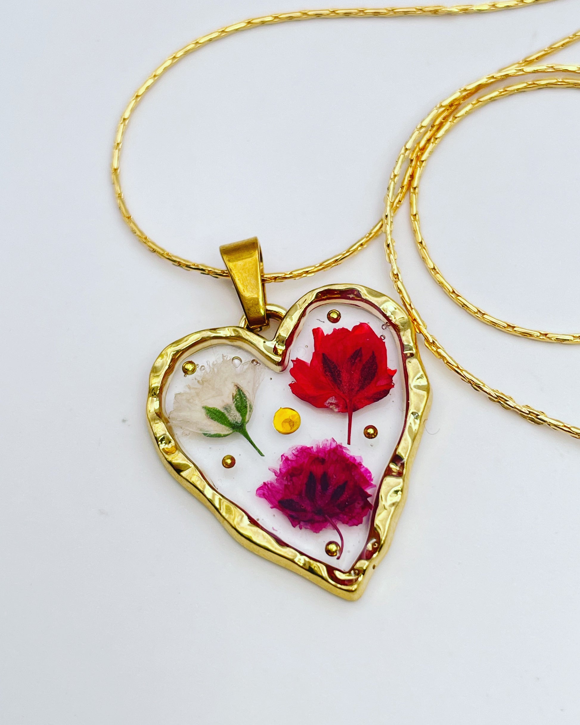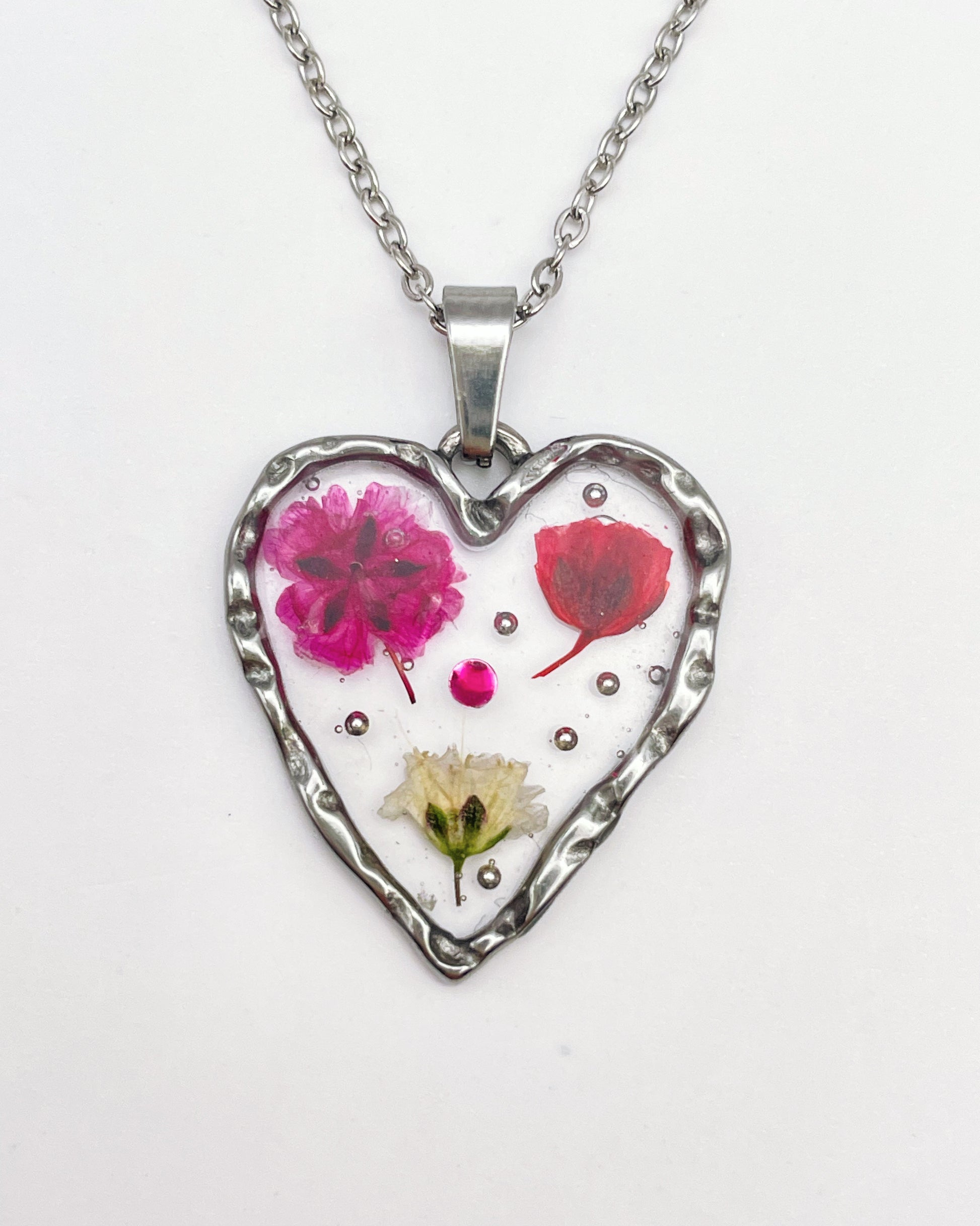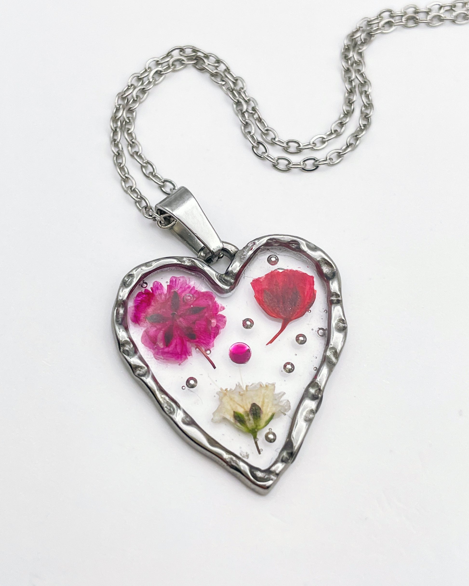 A beautiful heart pendant necklace handmade with real flowers and crystals in non-toxic resin. Most of the flowers are collected during my walks and pressed/dyed at my workshop in London UK. Each piece is carefully handcrafted by me.