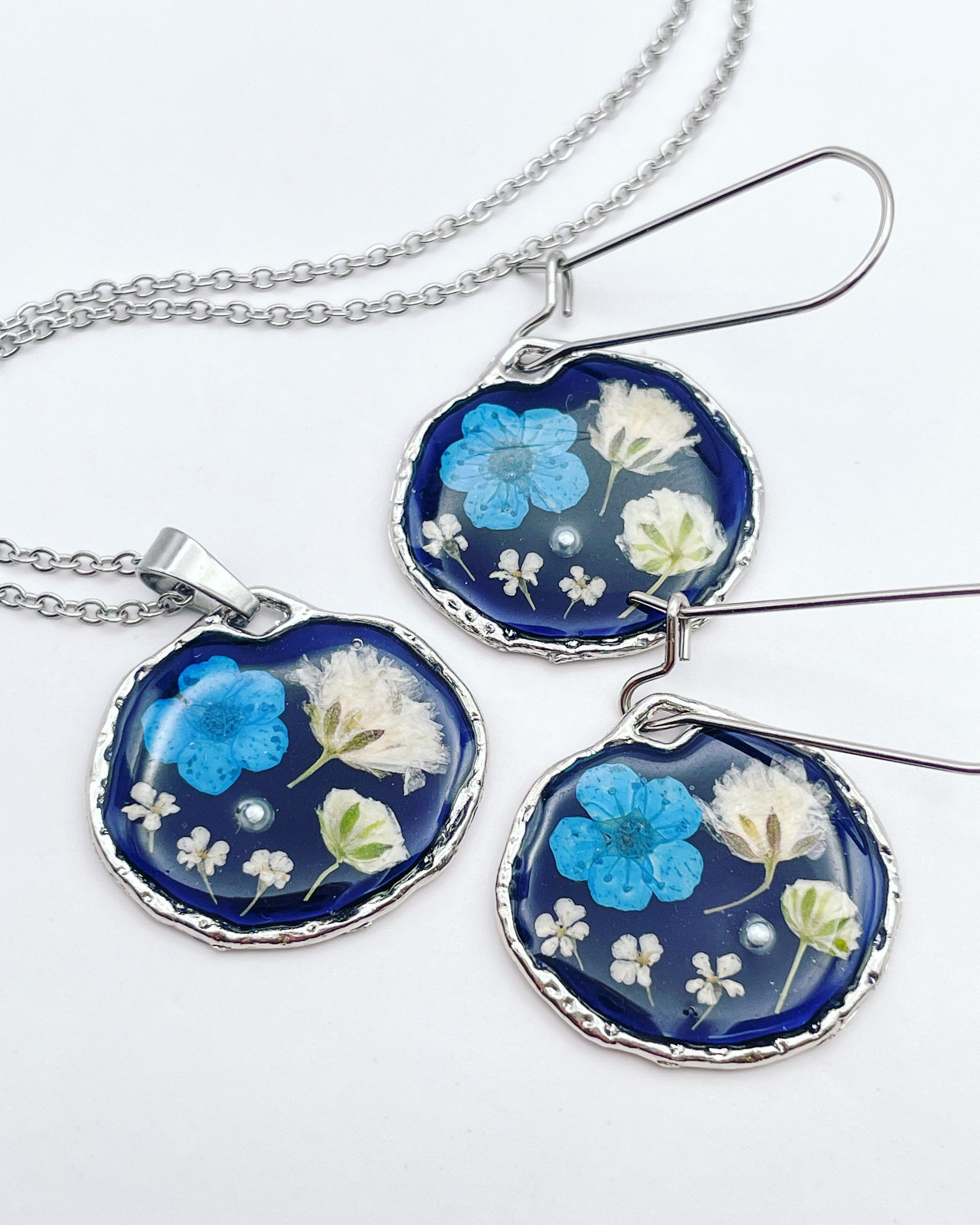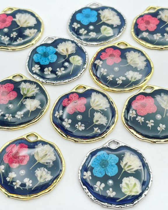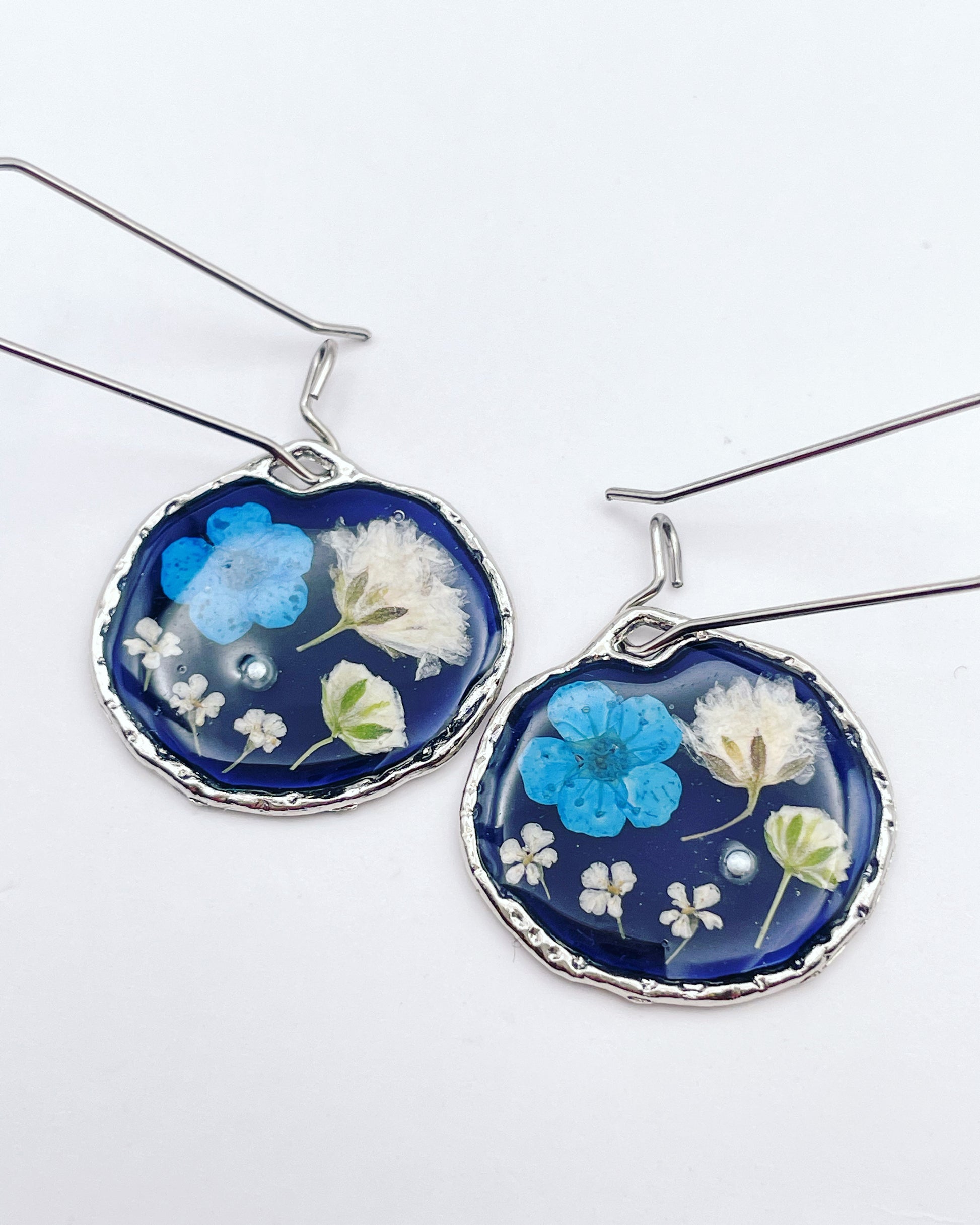 Stunning round dangle earrings handmade with blue and white flowers and pearls in black lacquer. Most of the flowers are collected during my walks and pressed/dyed at my workshop in London UK. My inspiration for this Black Collection is vintage Victorian jewellery and Asian lacquer art. A layer of black resin is applied to the background of the bezel, which gives the pendant a beautiful vintage feel. Each piece is carefully handcrafted by me.