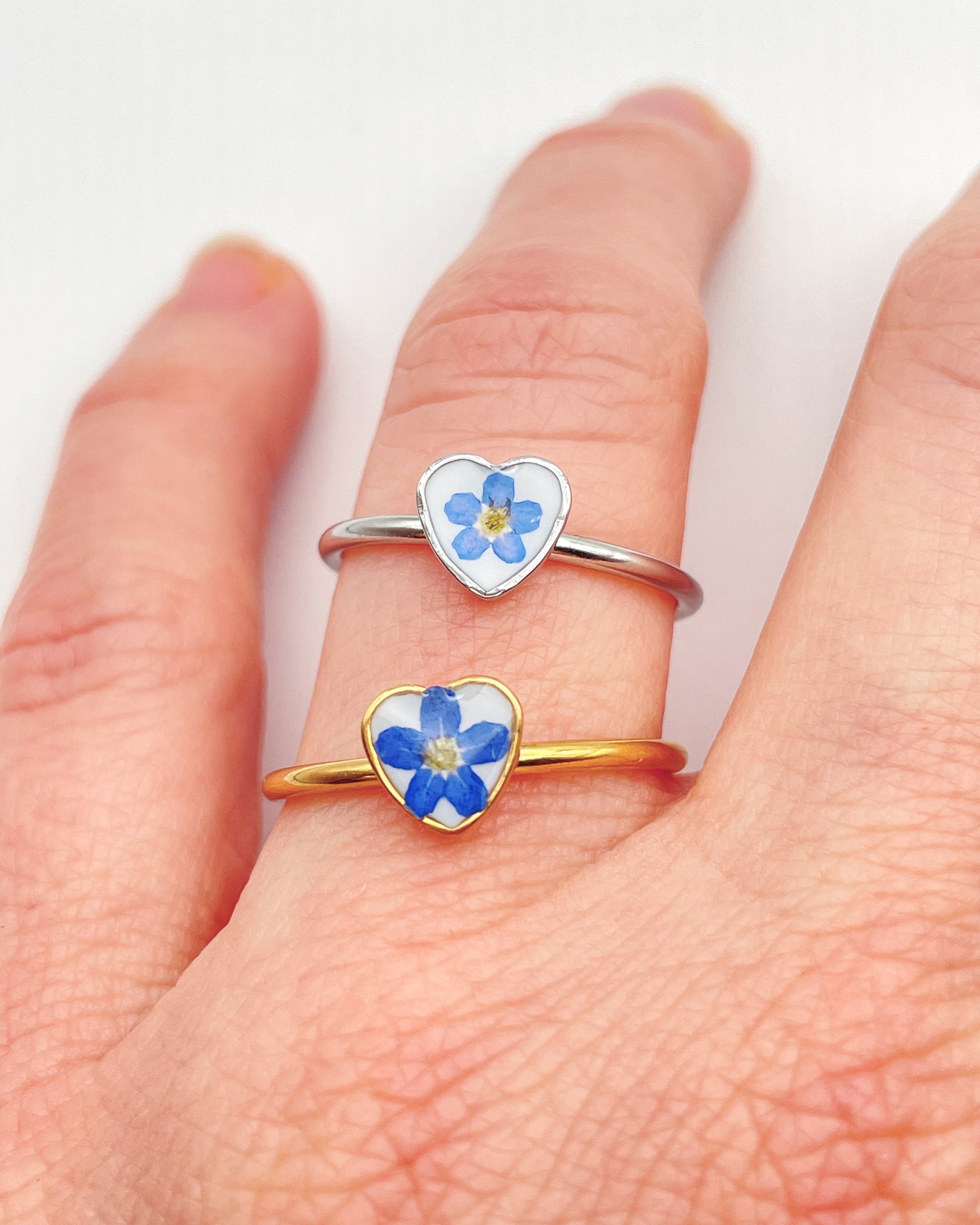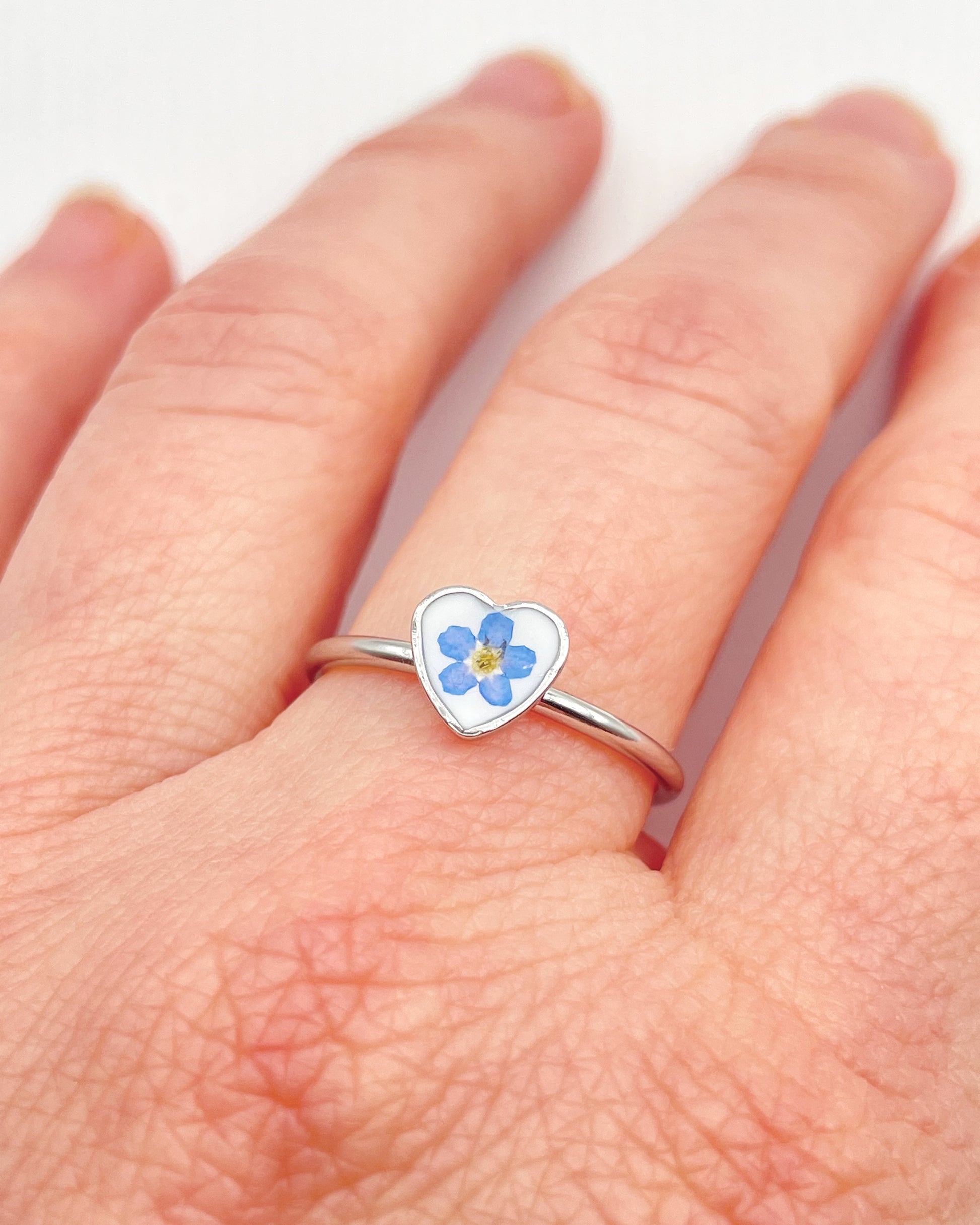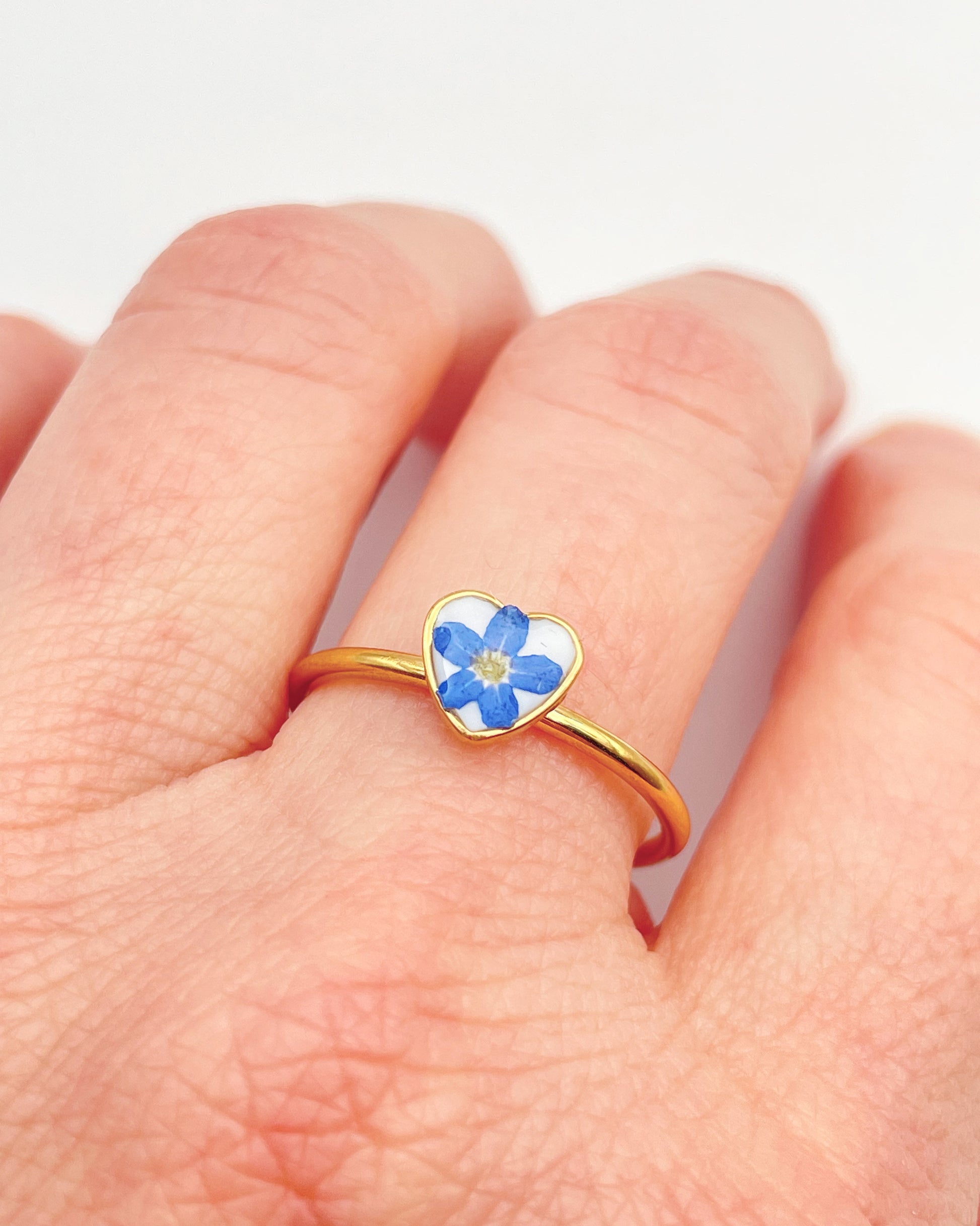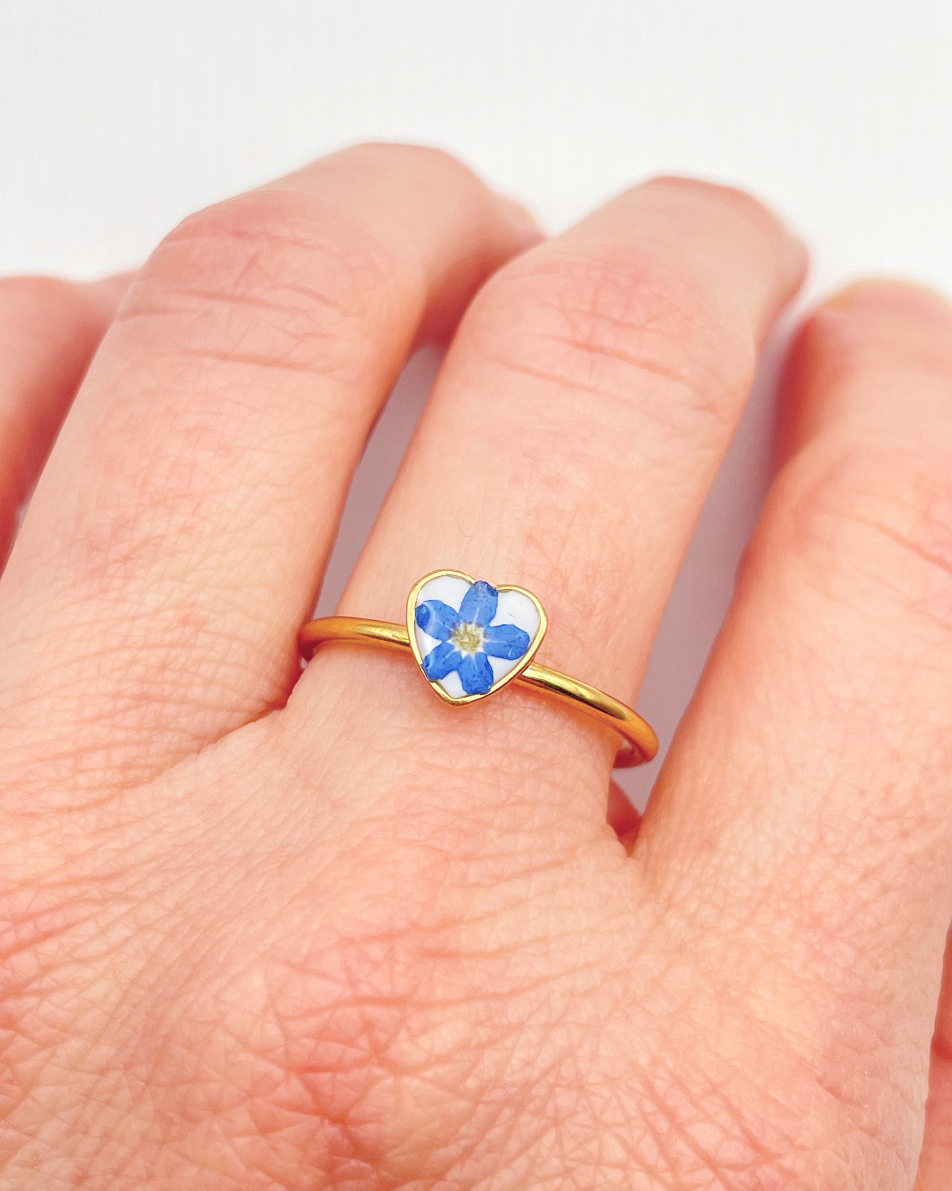 A beautiful and fully adjustable ring handmade with real forget-me-not flowers and in white lacquer. Most of the flowers are collected during my walks and pressed/dyed at my workshop in London. My inspiration is vintage Victorian and sentimental jewellery. A layer of white resin is applied to the background of the bezel, which gives the piece a beautiful vintage feel.