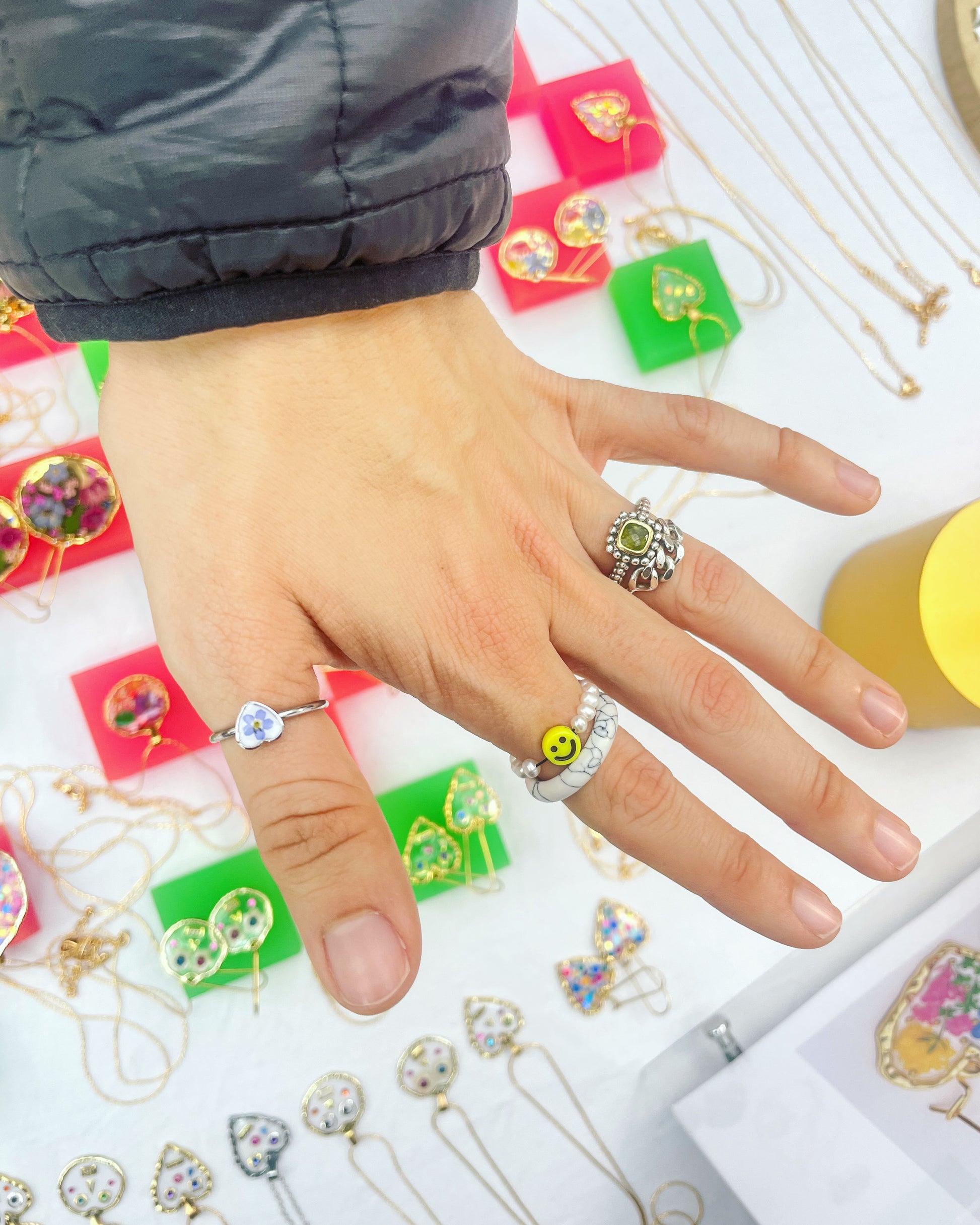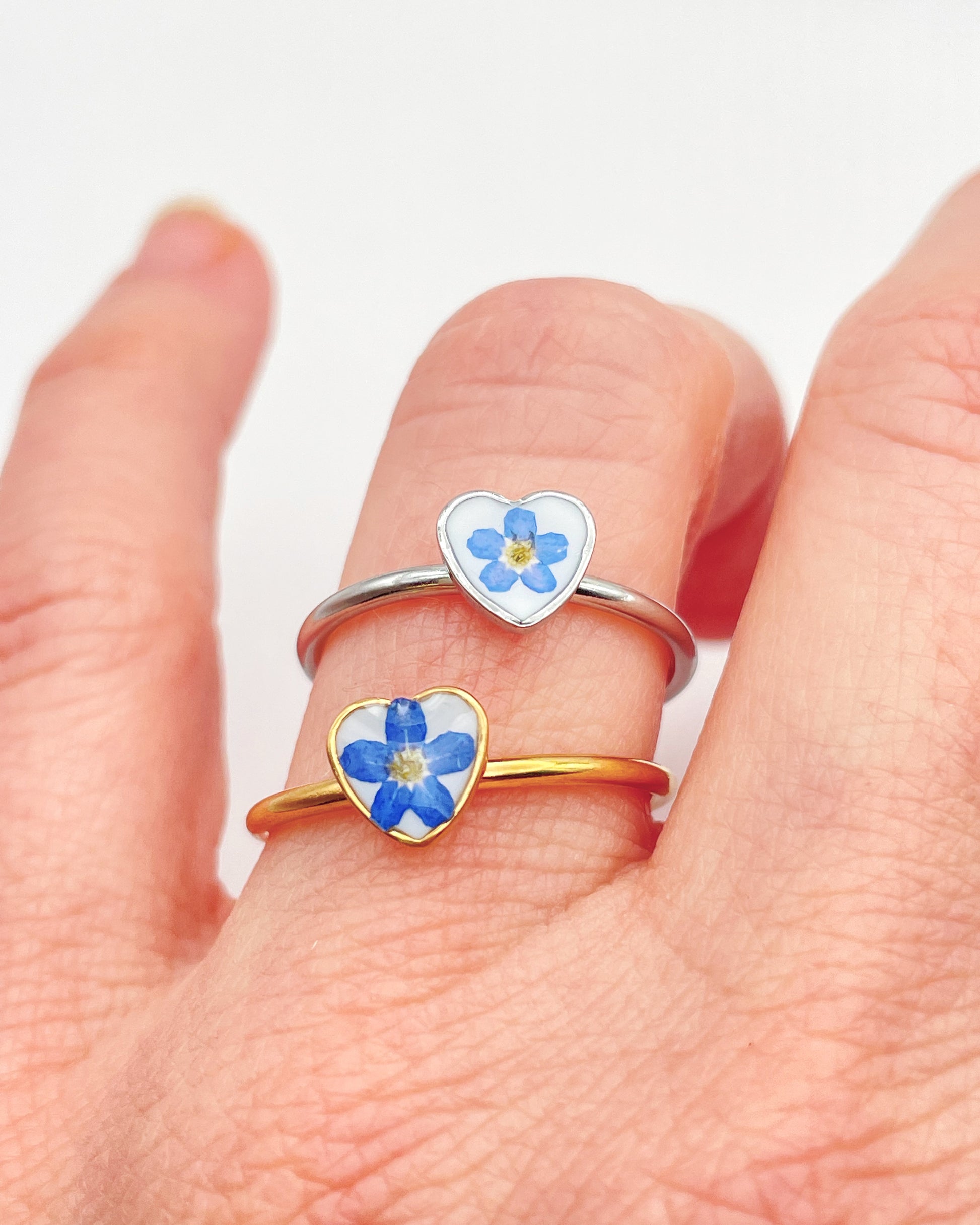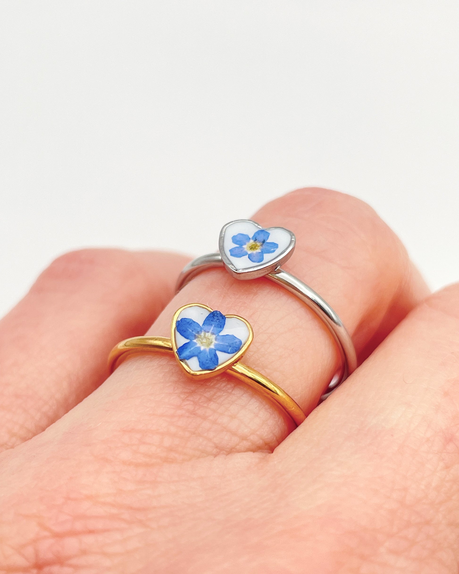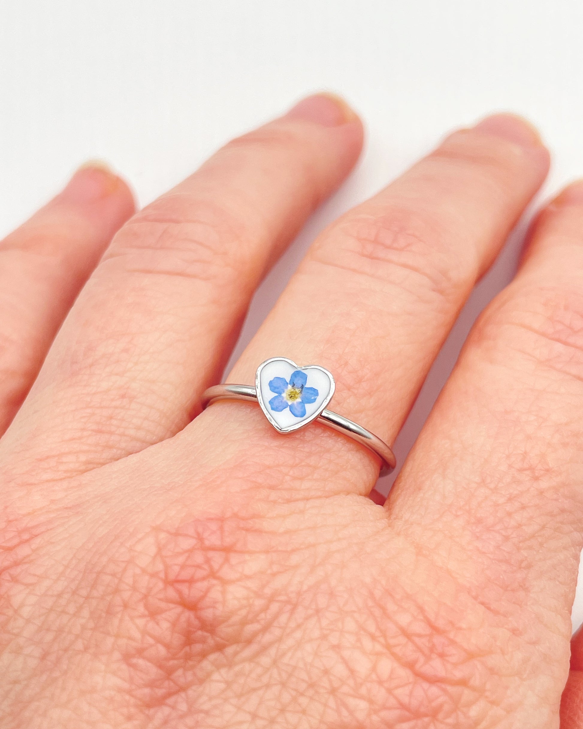 A beautiful and fully adjustable ring handmade with real forget-me-not flowers and in white lacquer. Most of the flowers are collected during my walks and pressed/dyed at my workshop in London. My inspiration is vintage Victorian and sentimental jewellery. A layer of white resin is applied to the background of the bezel, which gives the piece a beautiful vintage feel.