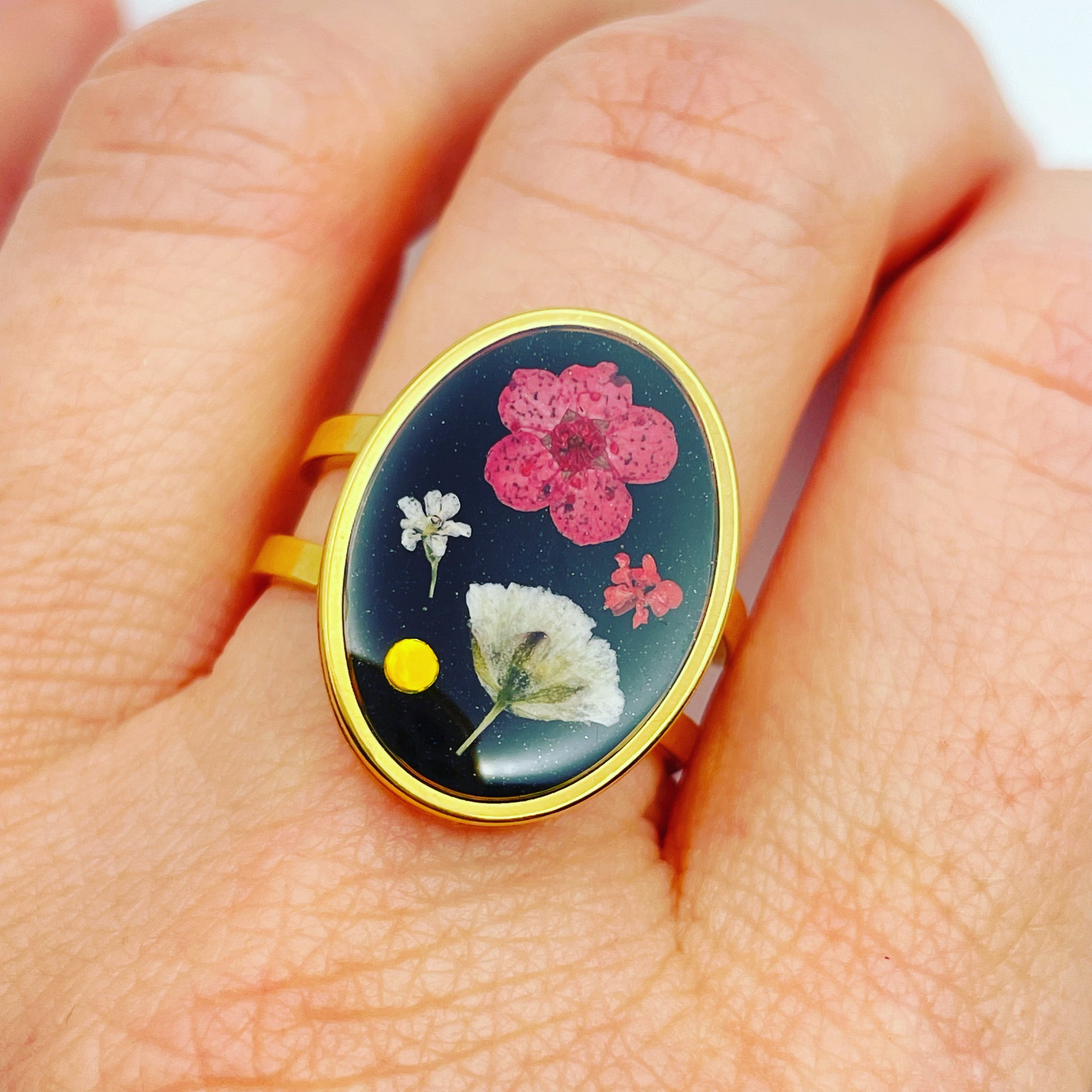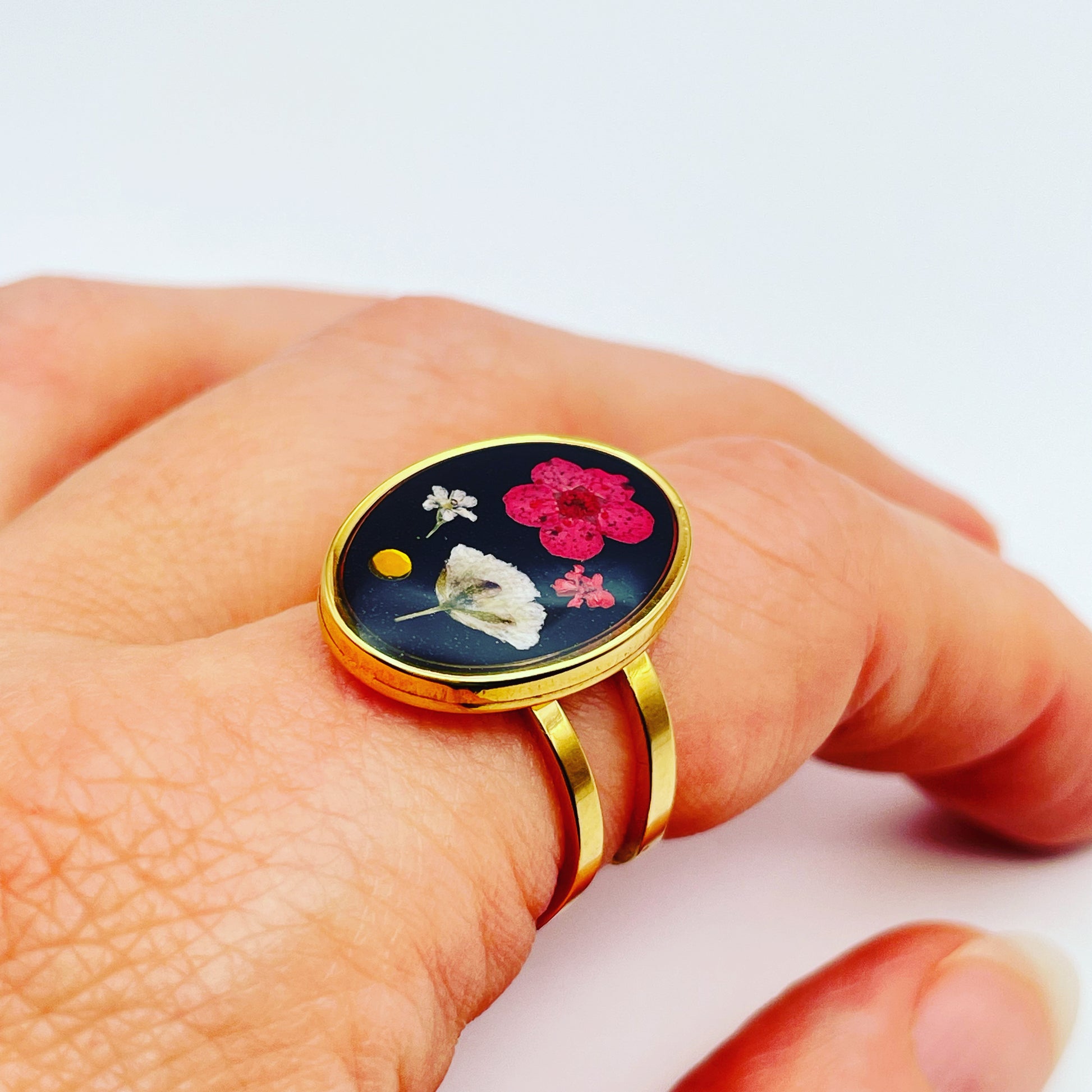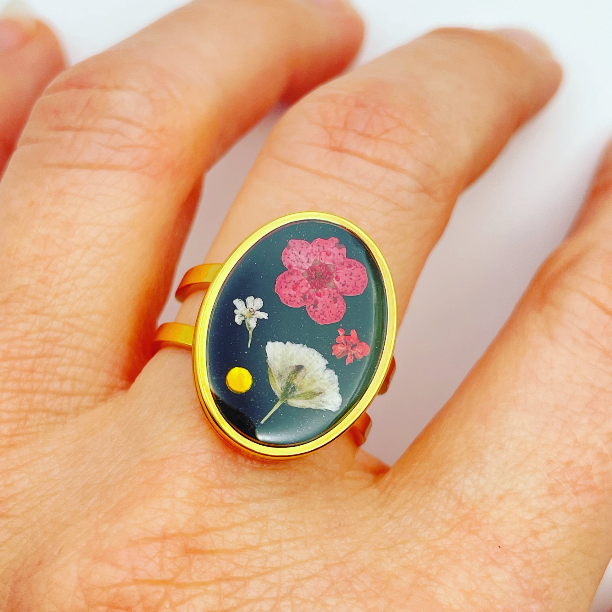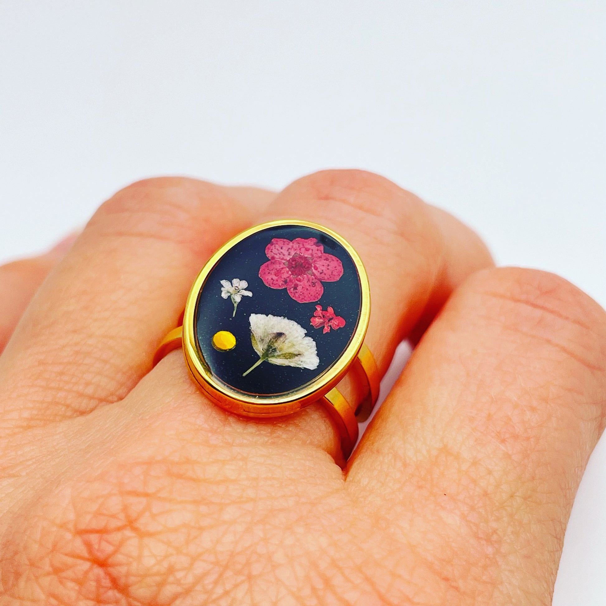 A beautiful and fully adjustable ring handmade with real red flowers and crystals in black lacquer. Most of the flowers are collected during my walks and pressed/dyed at my workshop in London. My inspiration for this Black Collection is vintage Victorian jewellery and Asian lacquer art. A layer of black resin is applied to the background of the bezel, which gives the piece a beautiful vintage Victorian feel.