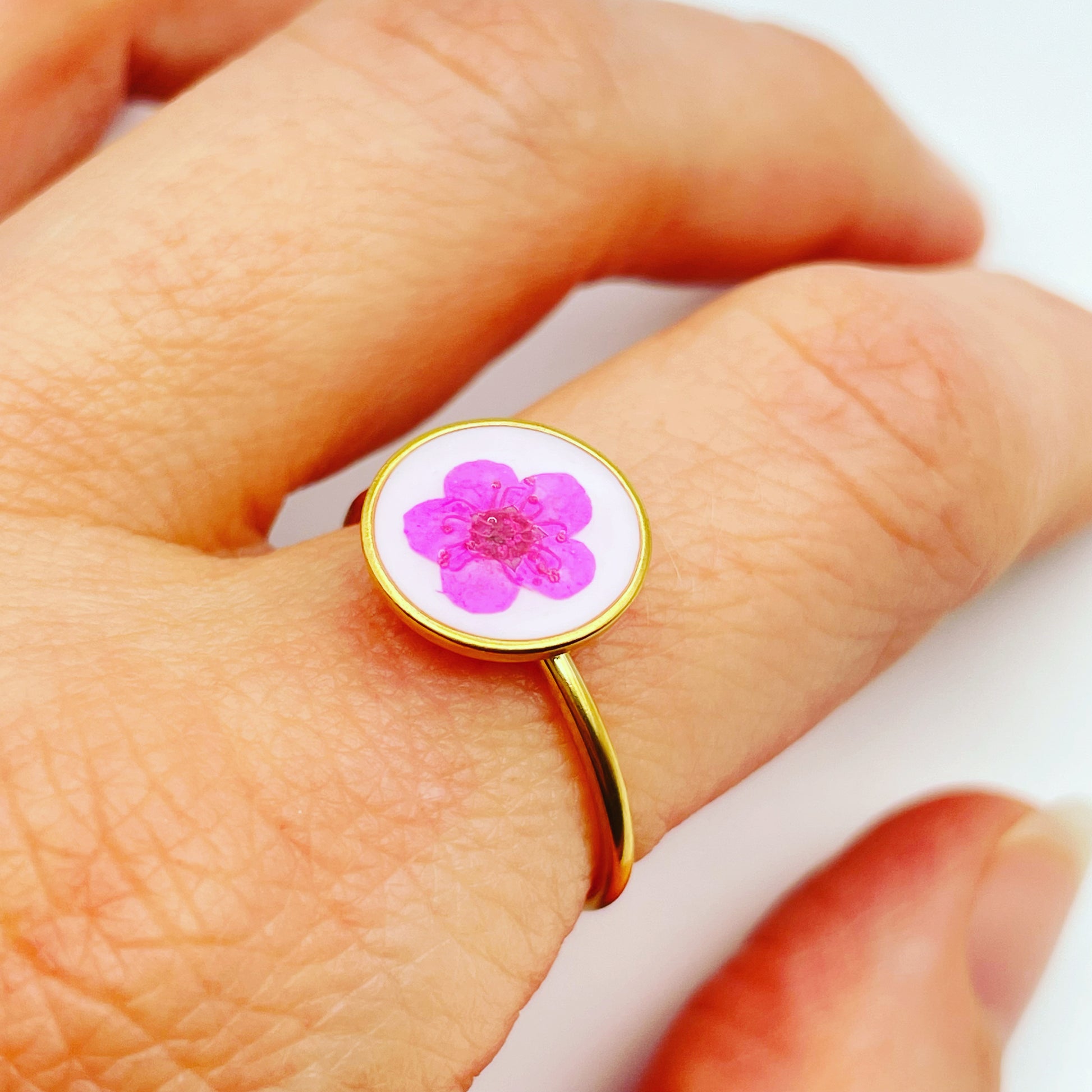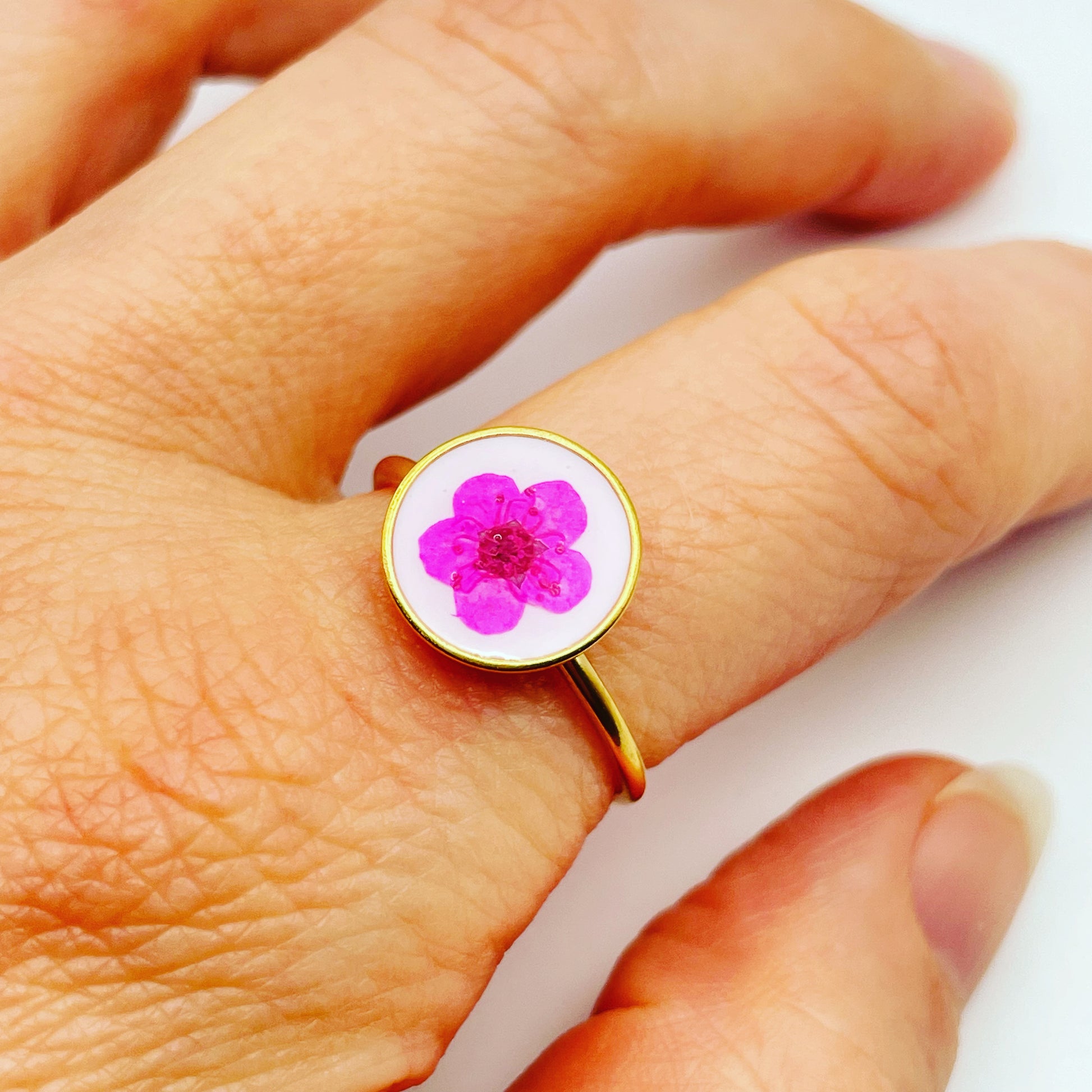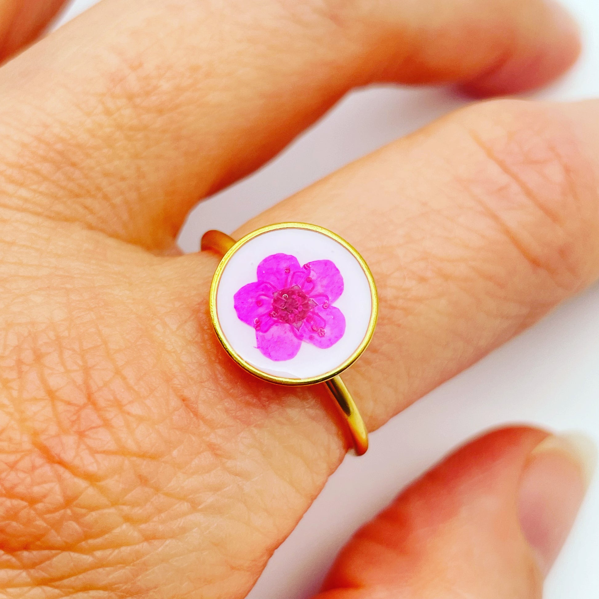 A beautiful and fully adjustable ring handmade with real narcissi flowers and crystals in white lacquer. Most of the flowers are collected during my walks and pressed/dyed at my workshop in London. My inspiration is vintage Victorian and sentimental jewellery. A layer of white resin is applied to the background of the bezel, which gives the piece a beautiful vintage feel.
