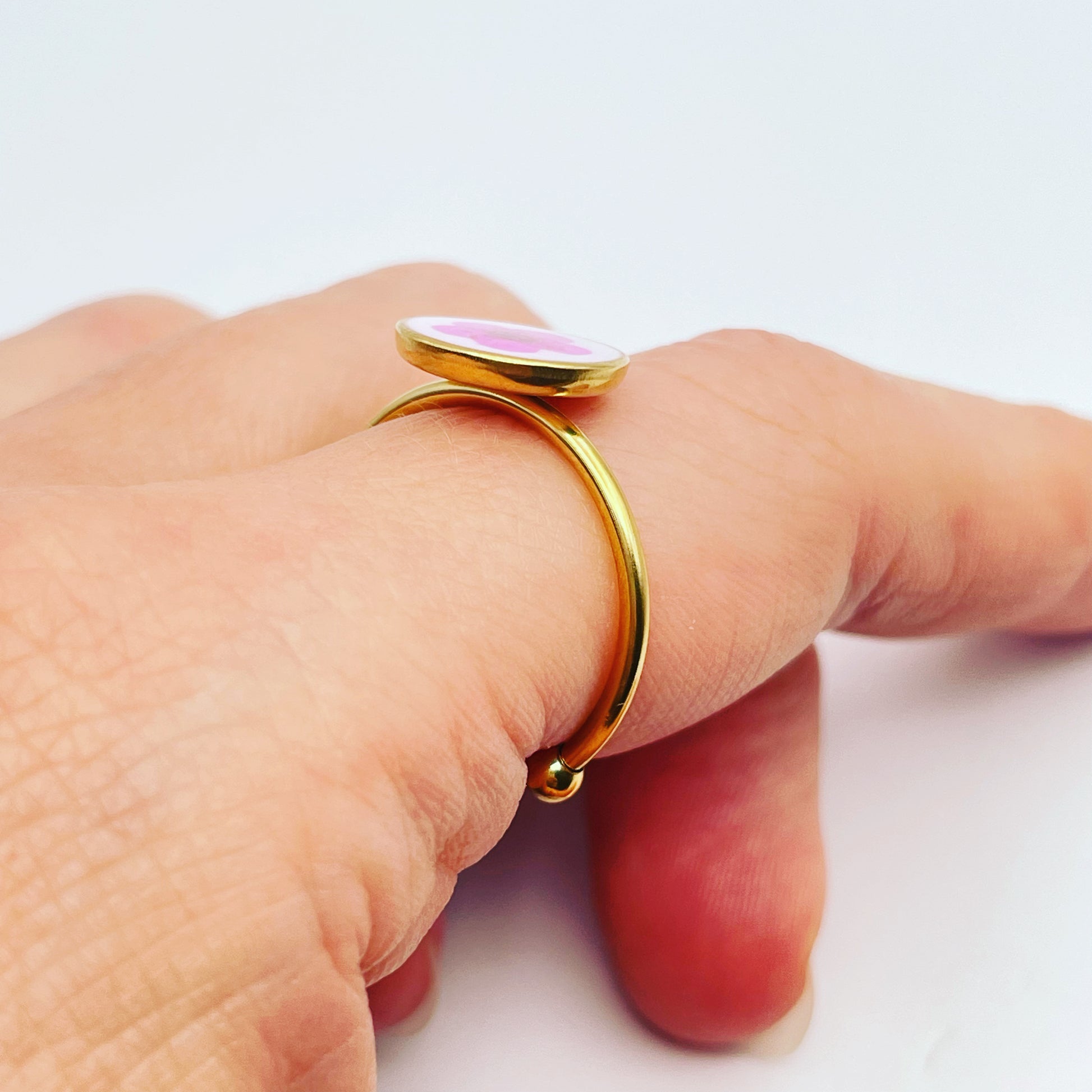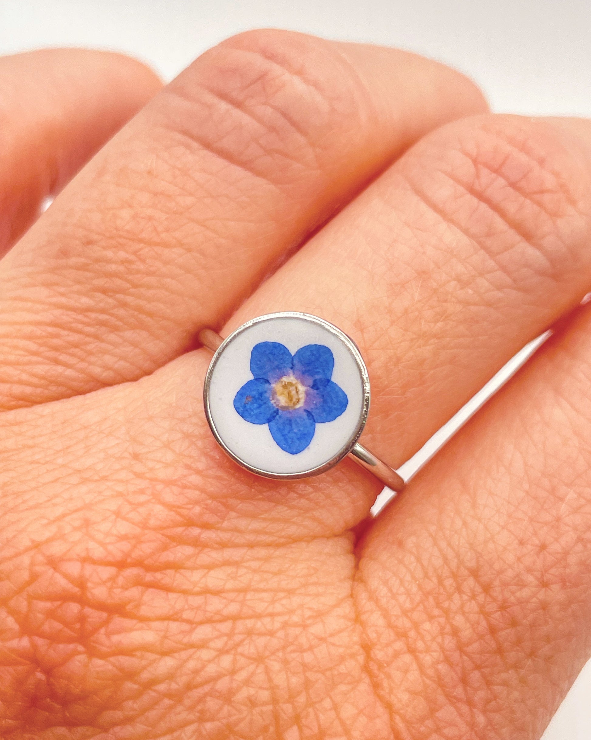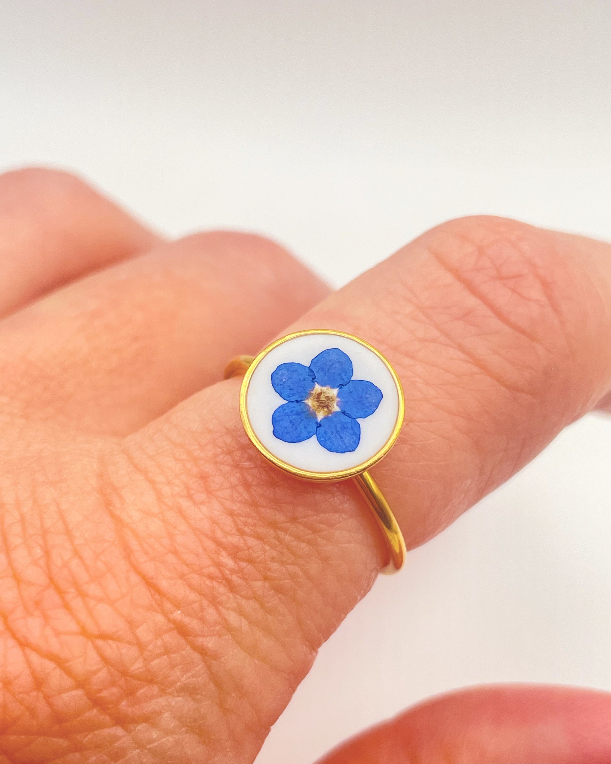 A beautiful and fully adjustable ring handmade with real narcissi flowers and crystals in white lacquer. Most of the flowers are collected during my walks and pressed/dyed at my workshop in London. My inspiration is vintage Victorian and sentimental jewellery. A layer of white resin is applied to the background of the bezel, which gives the piece a beautiful vintage feel.