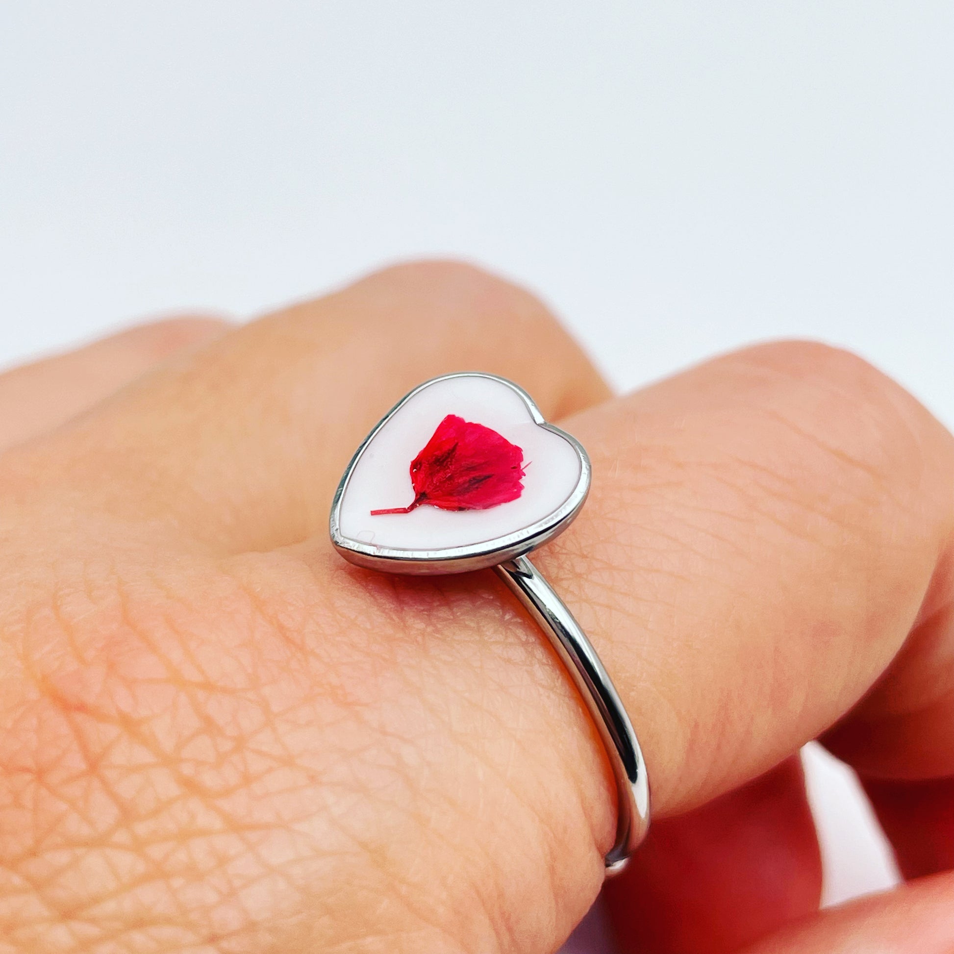 A beautiful and fully adjustable ring handmade with real narcissi flowers and crystals in white lacquer. Most of the flowers are collected during my walks and pressed/dyed at my workshop in London. My inspiration is vintage Victorian and sentimental jewellery. A layer of white resin is applied to the background of the bezel, which gives the piece a beautiful vintage feel.