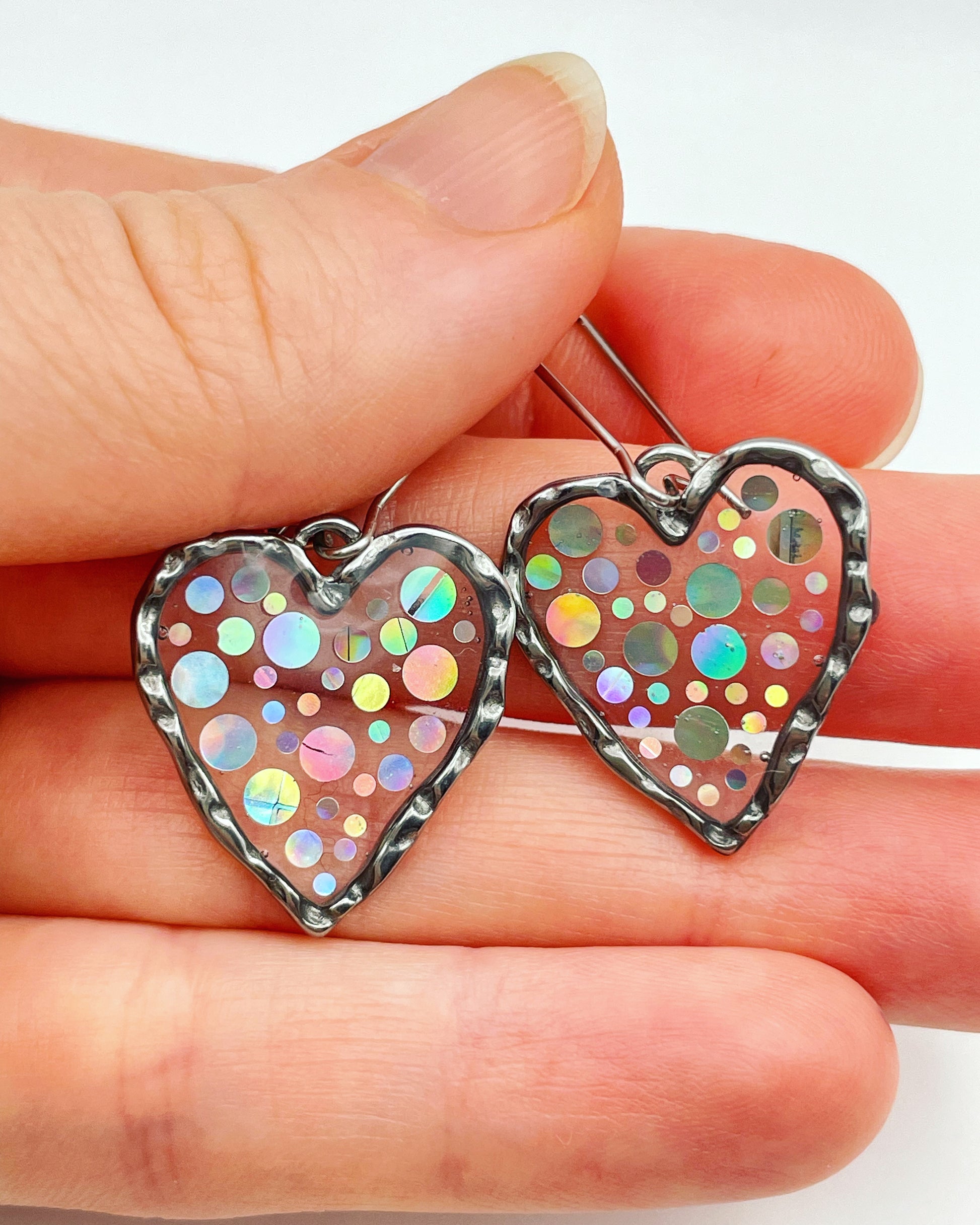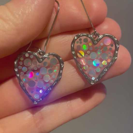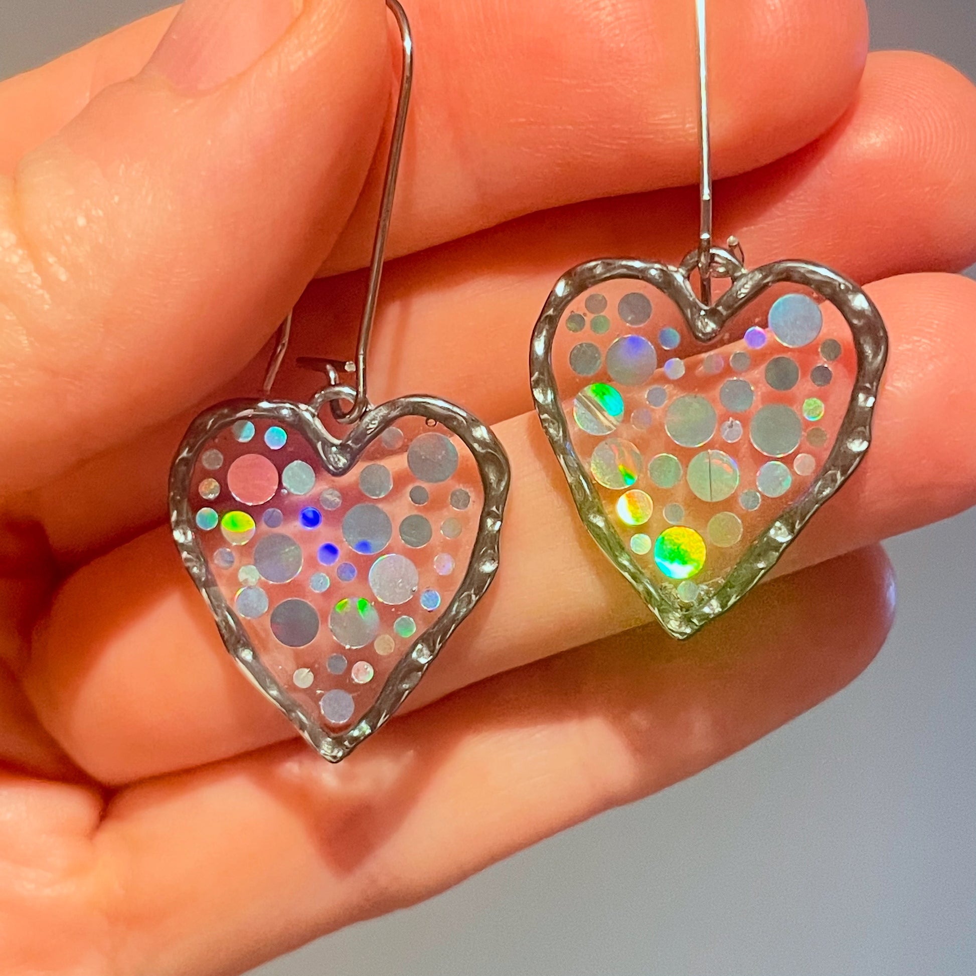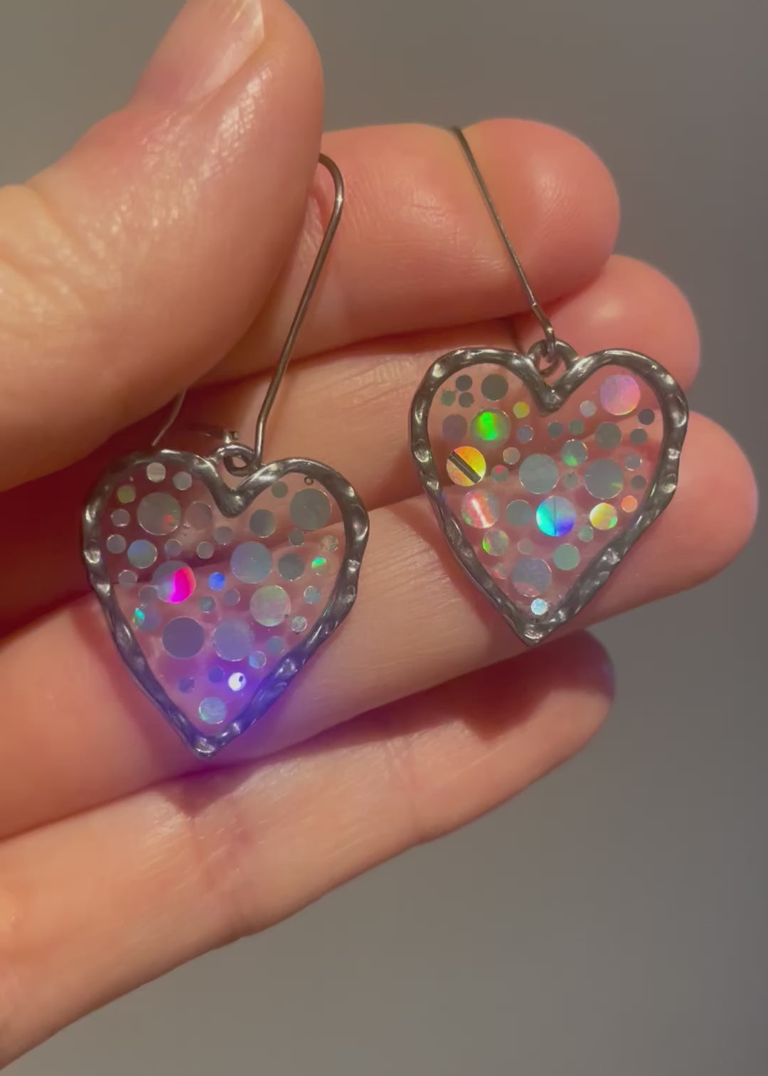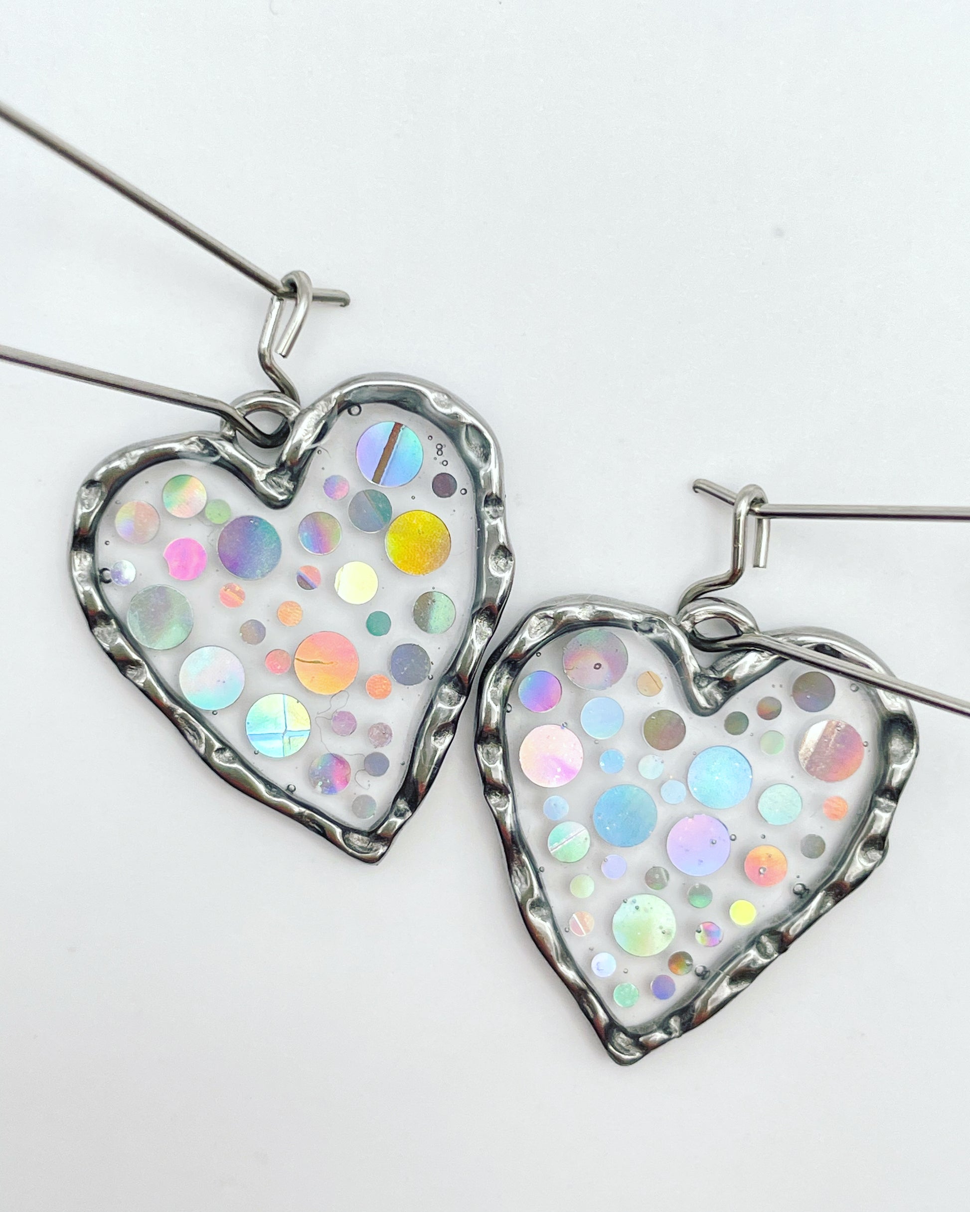 Sparkly disco dangle heart earrings handmade with tiny silver sequins in resin. My inspiration for this collection is Disco balls. The tiny iridescent sequins change colour and shine in the light for a very refined and festive look! Each piece is carefully handcrafted by me at my workshop in London UK.