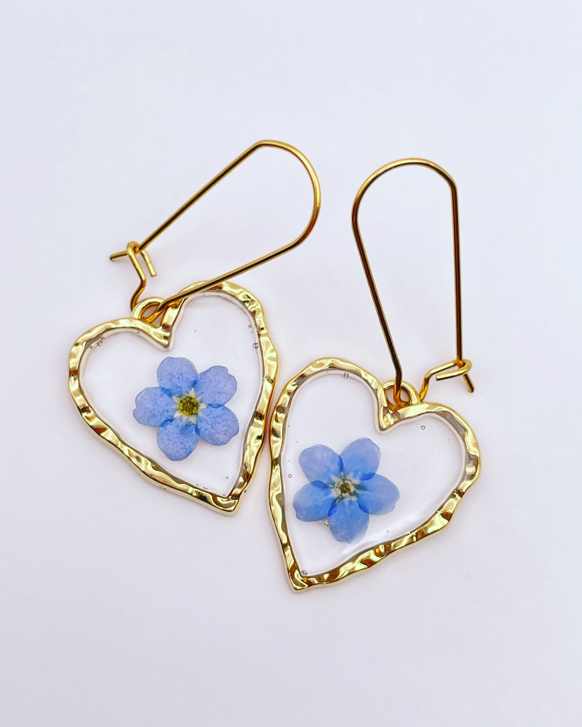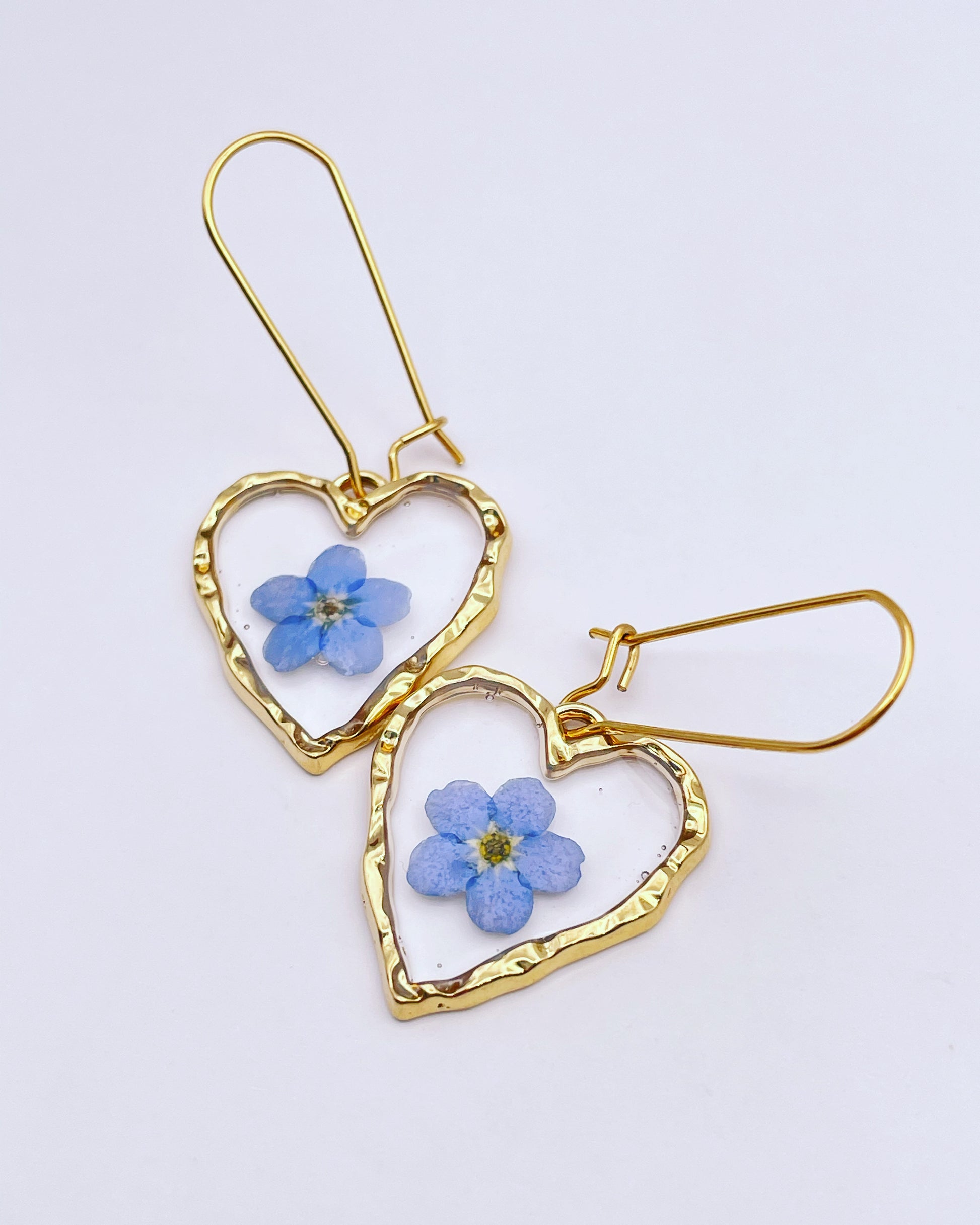 A beautiful pair of heart dangle earrings handmade with real flowers in non-toxic resin. Most of the flowers are collected during my walks and pressed/dyed at my workshop in London UK. Each piece is carefully handcrafted by me.