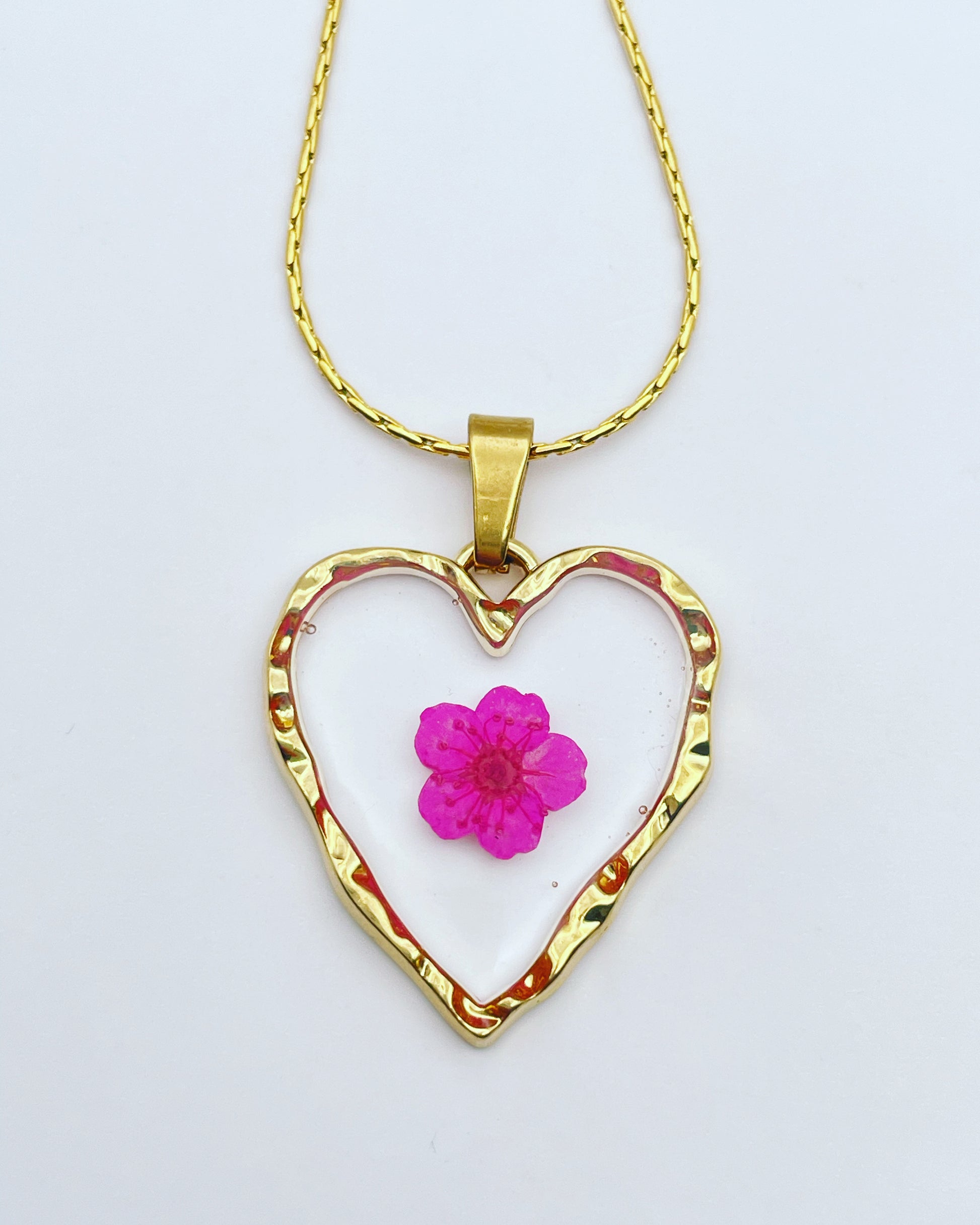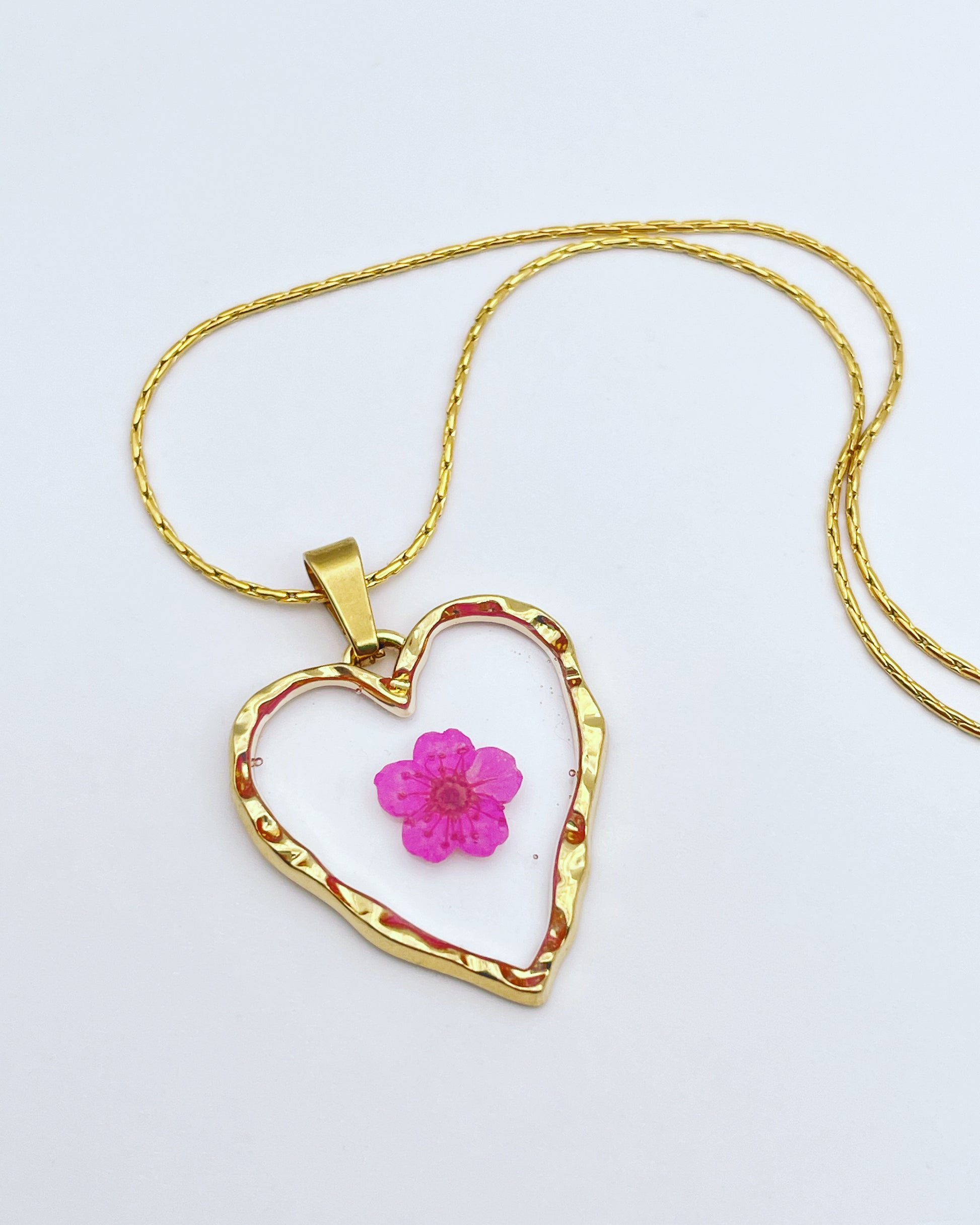 A beautiful heart pendant necklace handmade with real flowers in non-toxic resin. Most of the flowers are collected during my walks and pressed/dyed at my workshop in London UK. Each piece is carefully handcrafted by me.