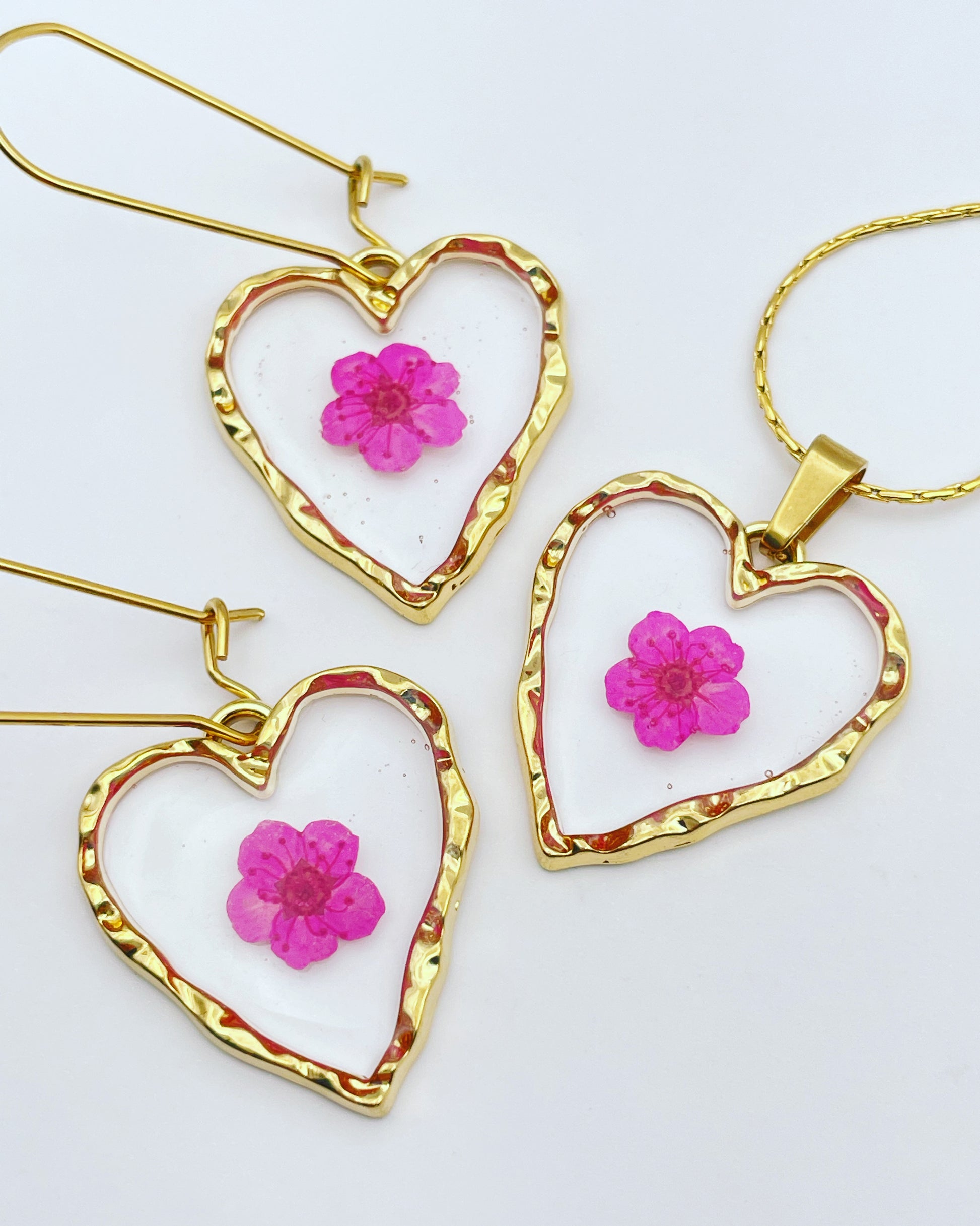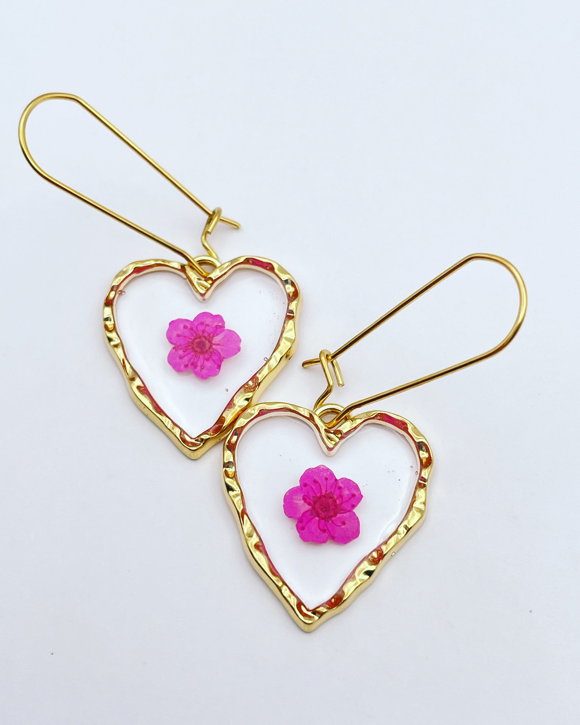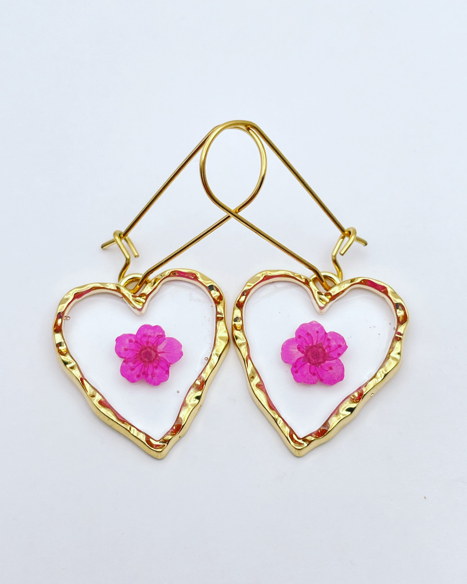 A beautiful pair of heart dangle earrings handmade with real flowers and crystals in non-toxic resin. Most of the flowers are collected during my walks and pressed/dyed at my workshop in London UK. Each piece is carefully handcrafted by me.