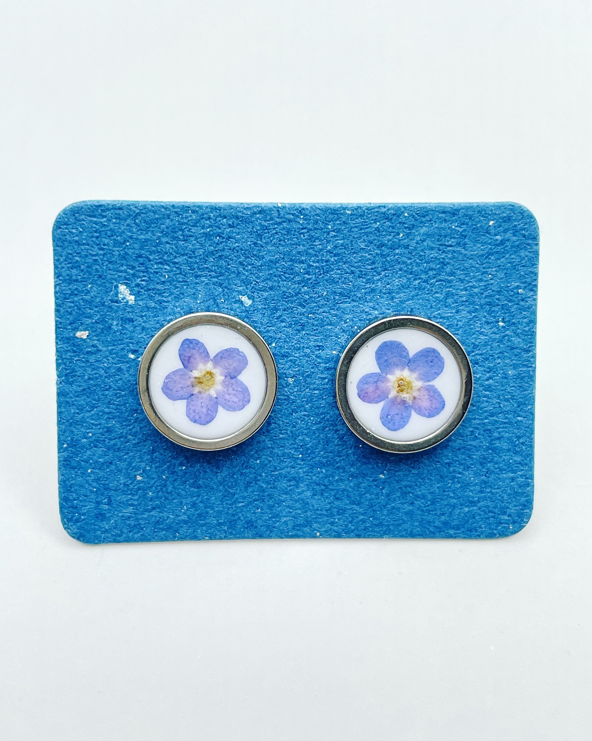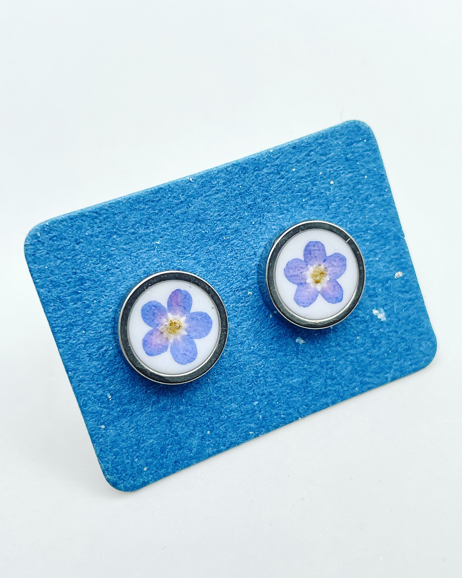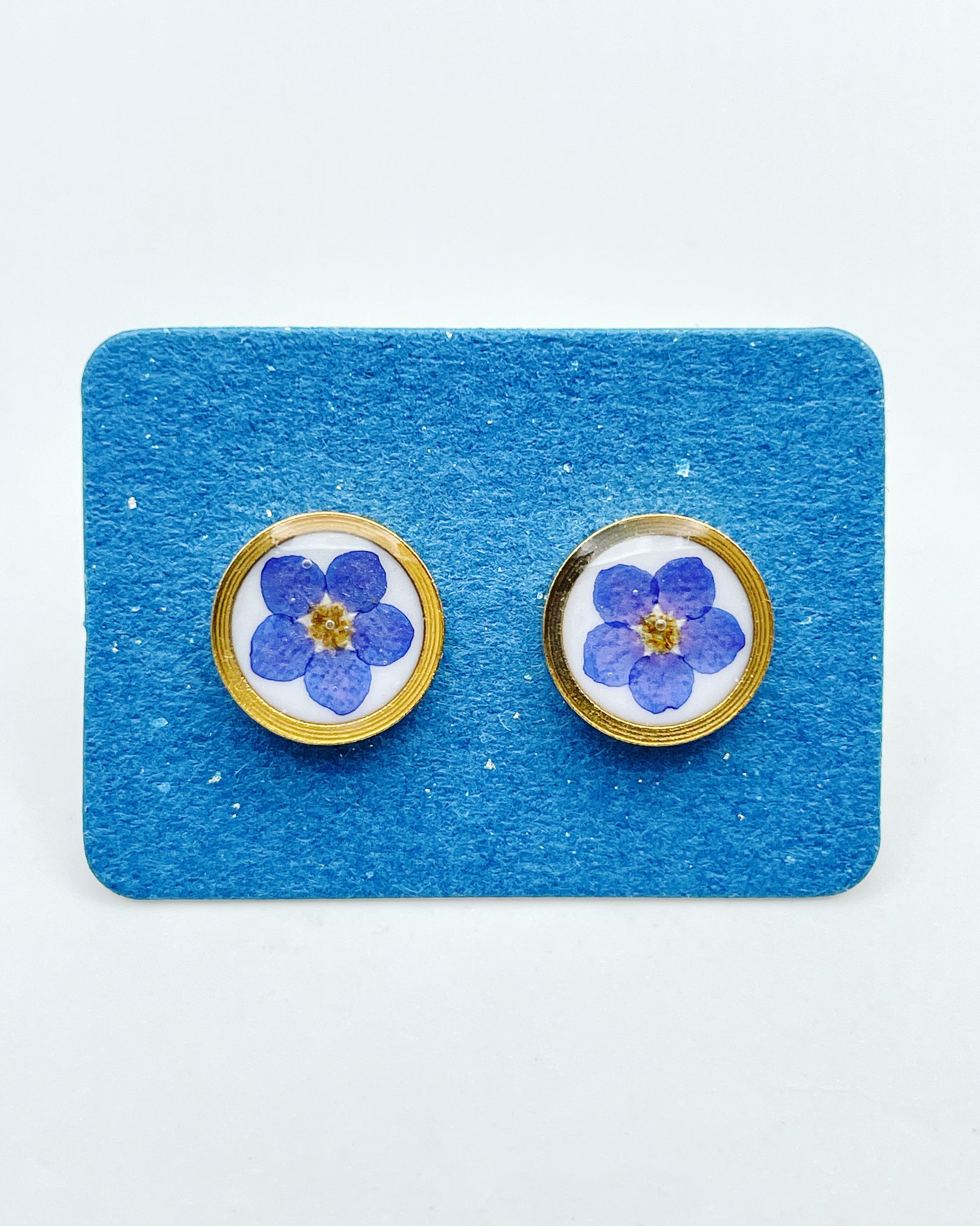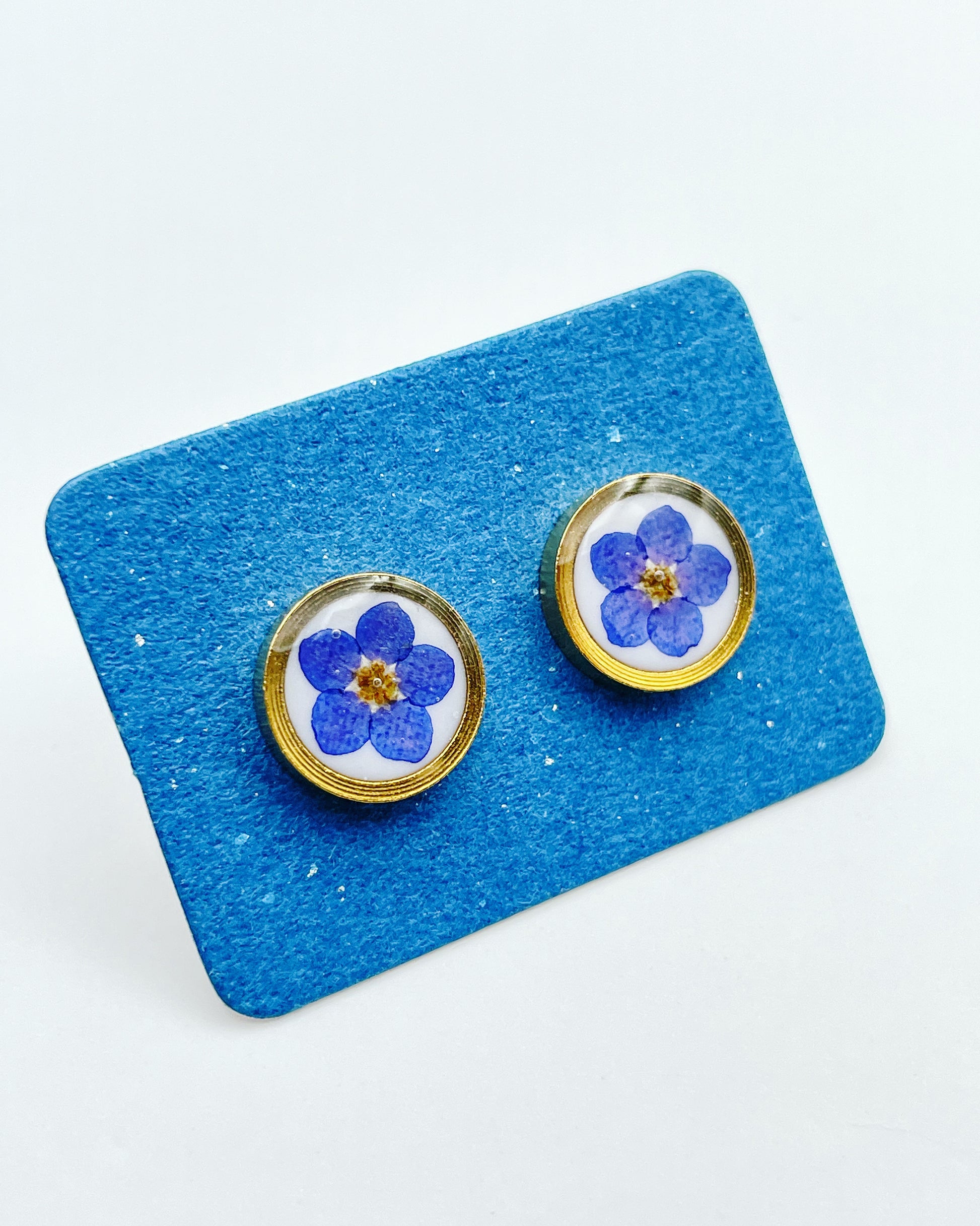A pair of beautiful small stud earrings handmade by me with real forget-me-not flowers embedded in white lacquer. Most of the flowers are collected during my walks and pressed/dyed at my workshop in London UK. Each piece is carefully handcrafted by me.