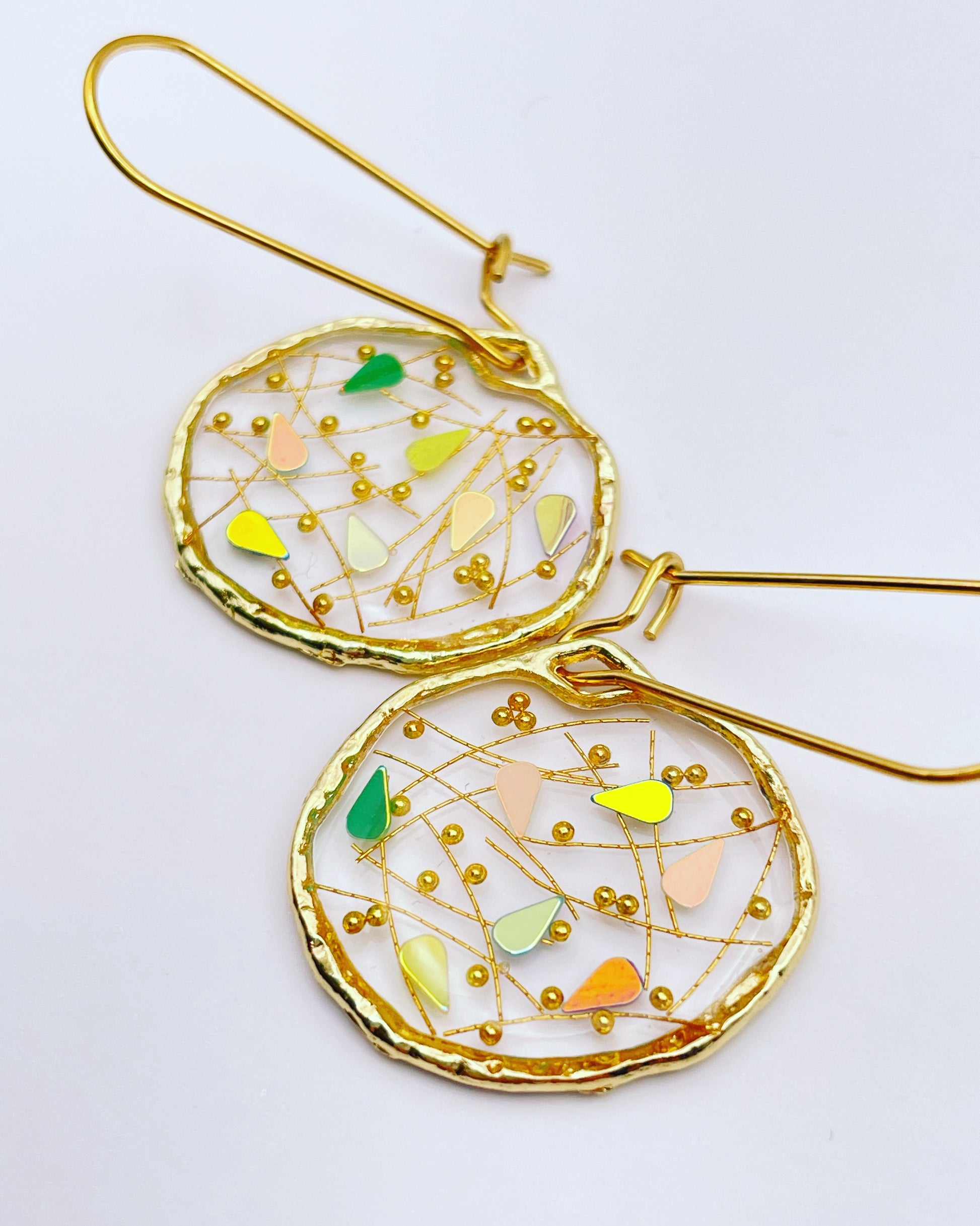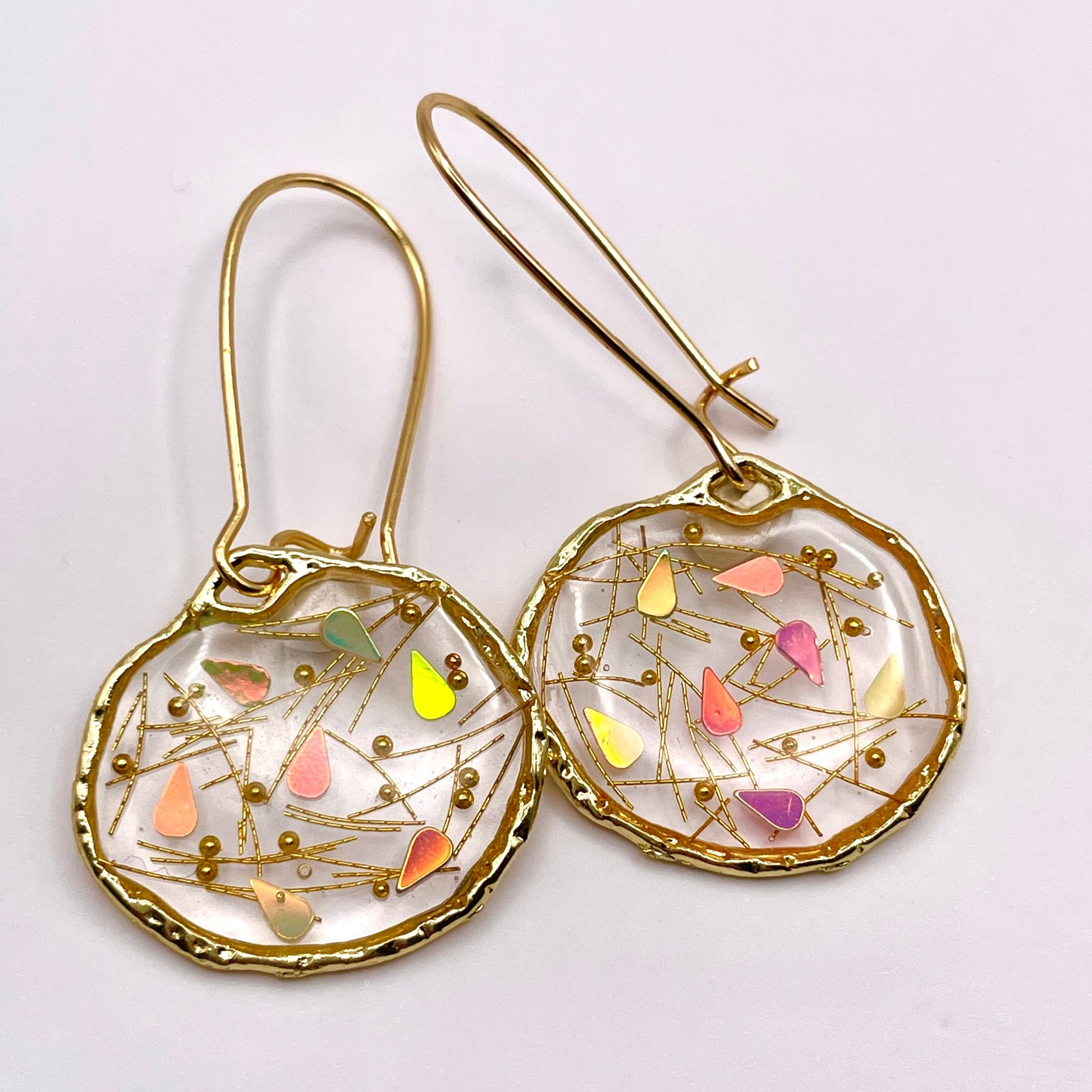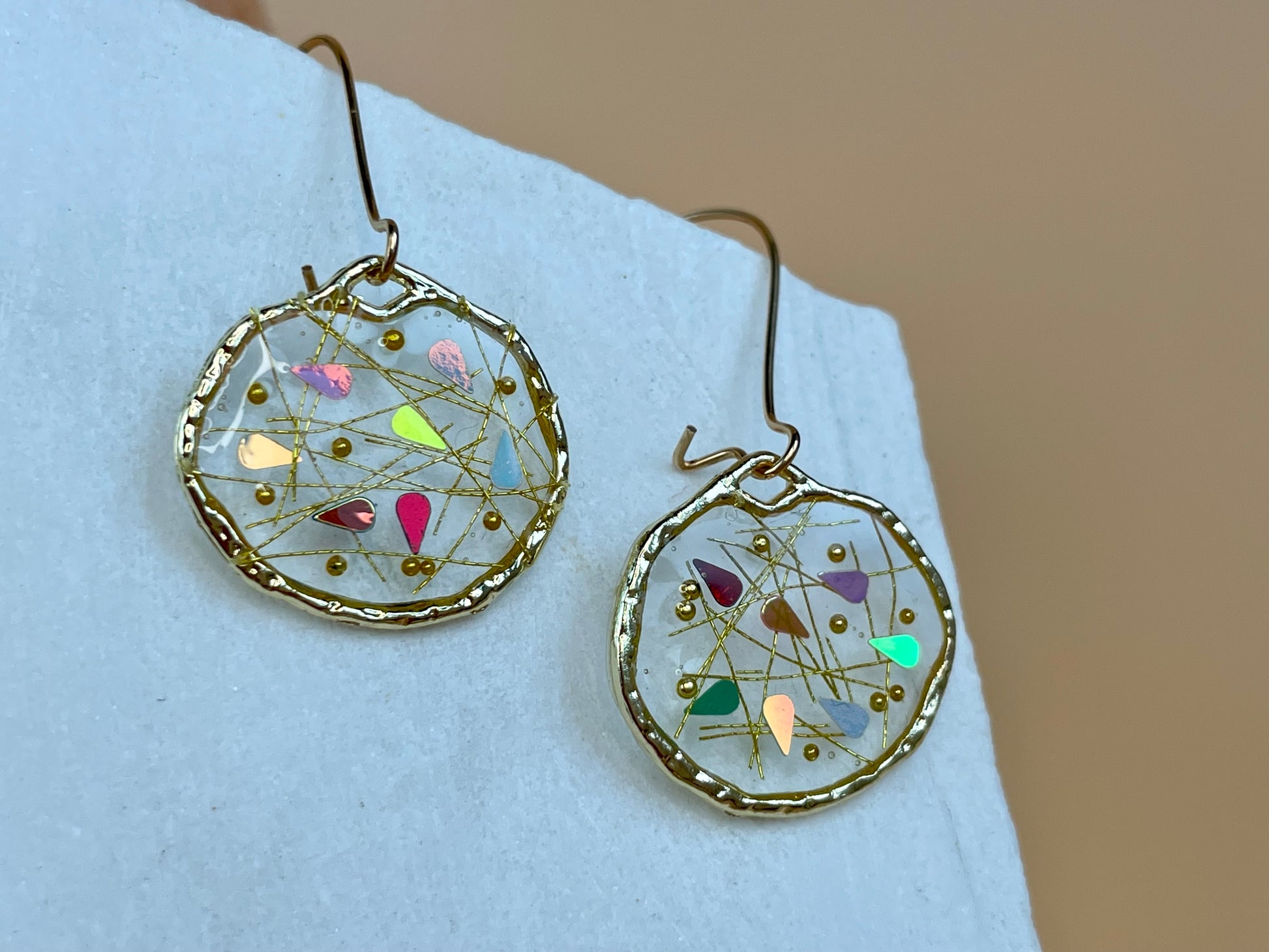 Elegant sparkly dangle earrings handmade with tiny iridescent sequins in resin. My inspiration for this collection is Disco balls! The tiny iridescent sequins change colour and shine in the light for a very refined and festive look. Each piece is lovingly handcrafted by me at my workshop in London UK.