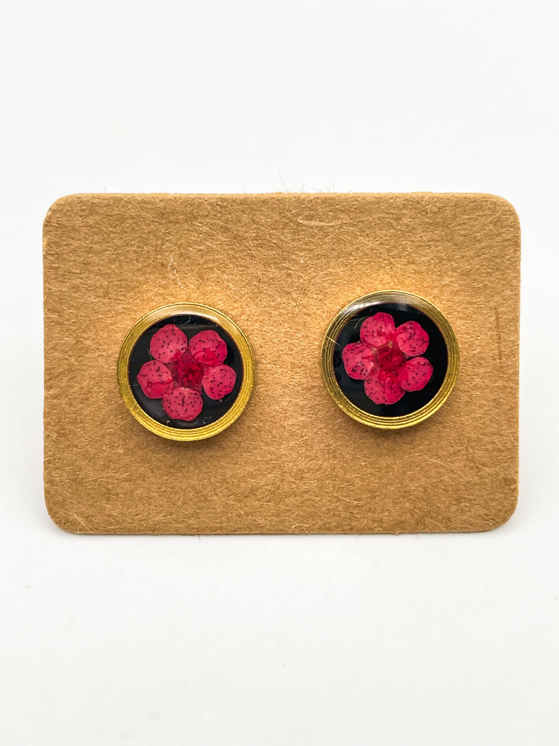 Stud earrings with red flowers in black lacquer